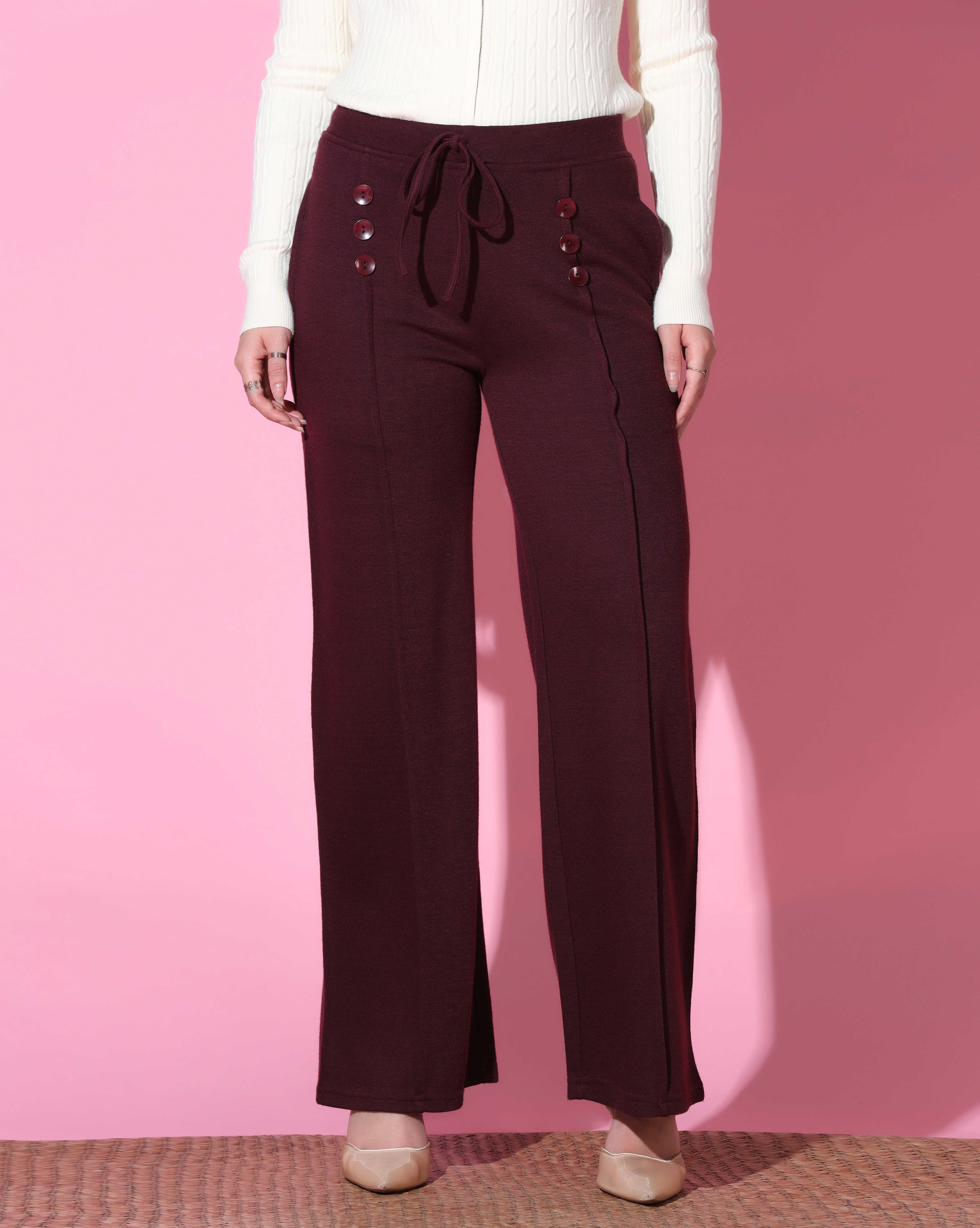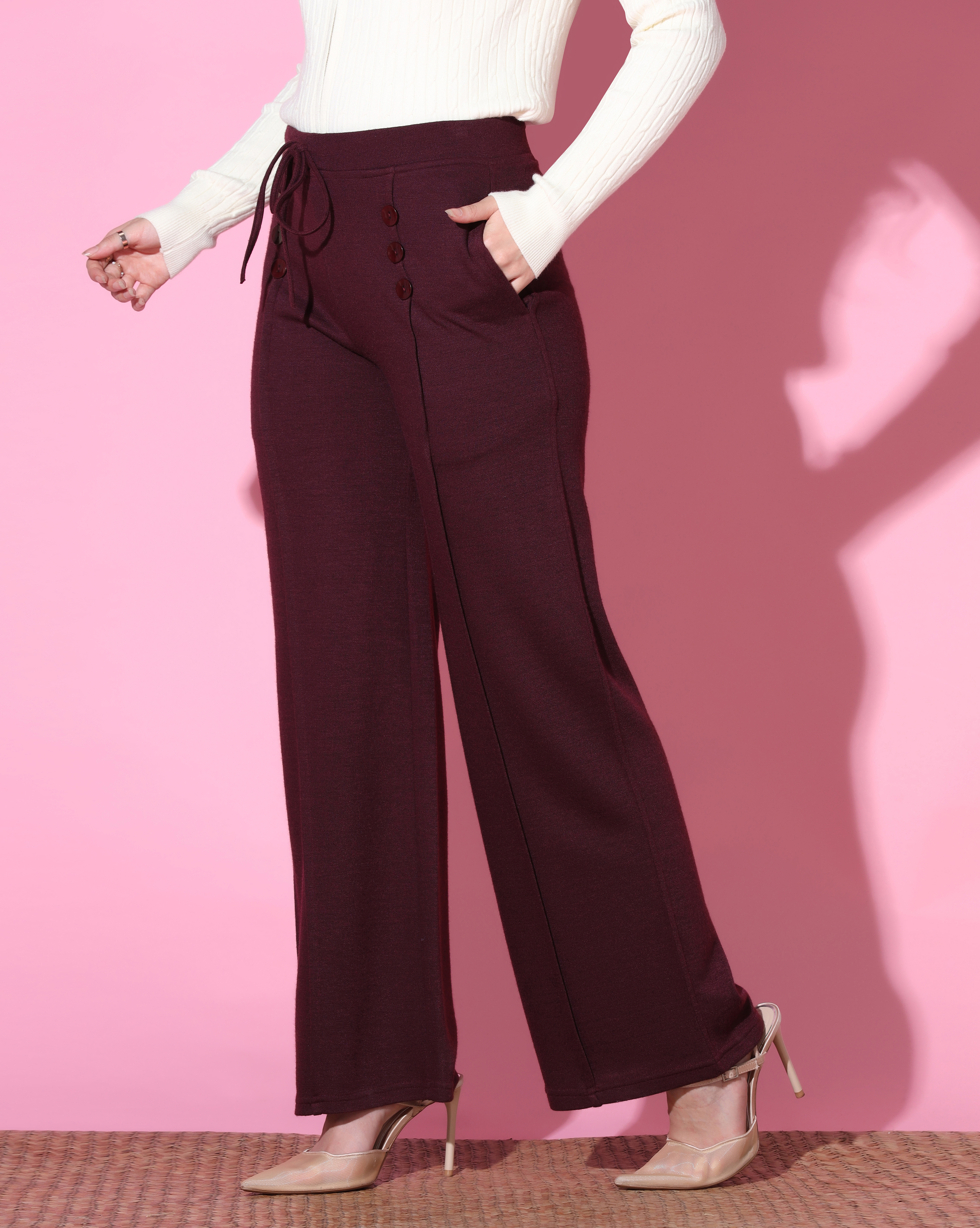 Elevate your everyday wardrobe with the WL-125 Wide-Leg Trousers. These comfortable yet sophisticated pants are designed with a flattering, relaxed fit and a subtly cropped wide-leg silhouette. Crafted from a superior blend of Viscose, Acrylic, and Spandex, they offer the perfect balance of softness, warmth, and flexible stretch for all-day wear. The standout feature is the decorative button detailing on the front pockets, adding a refined, nautical-inspired touch to a classic design. Fabric: Premium Viscose Acrylic Spandex Blend Design: Flattering wide-leg cut with a slightly tailored look from the front seams Waistband: Comfortable fixed or elasticated waistband with an adjustable drawstring Fit: Flattering wide-leg Colors: Teal, Beige, Wine, Coffee, Rust