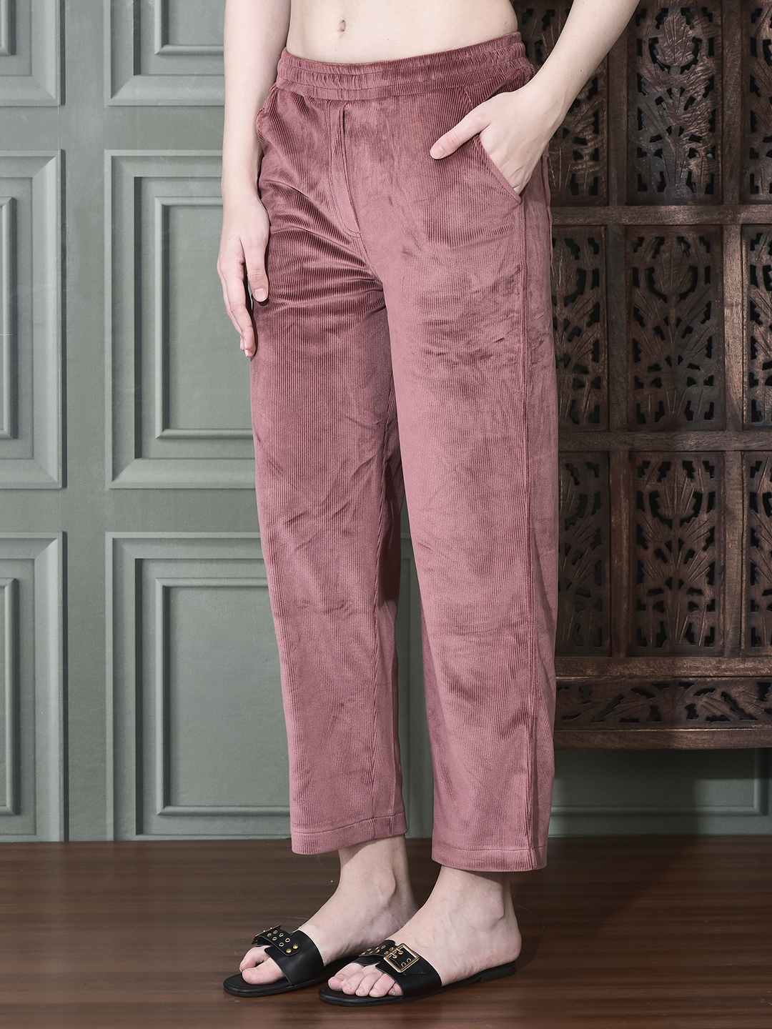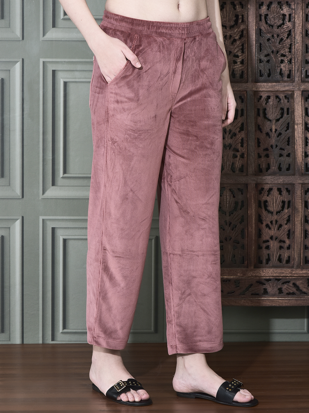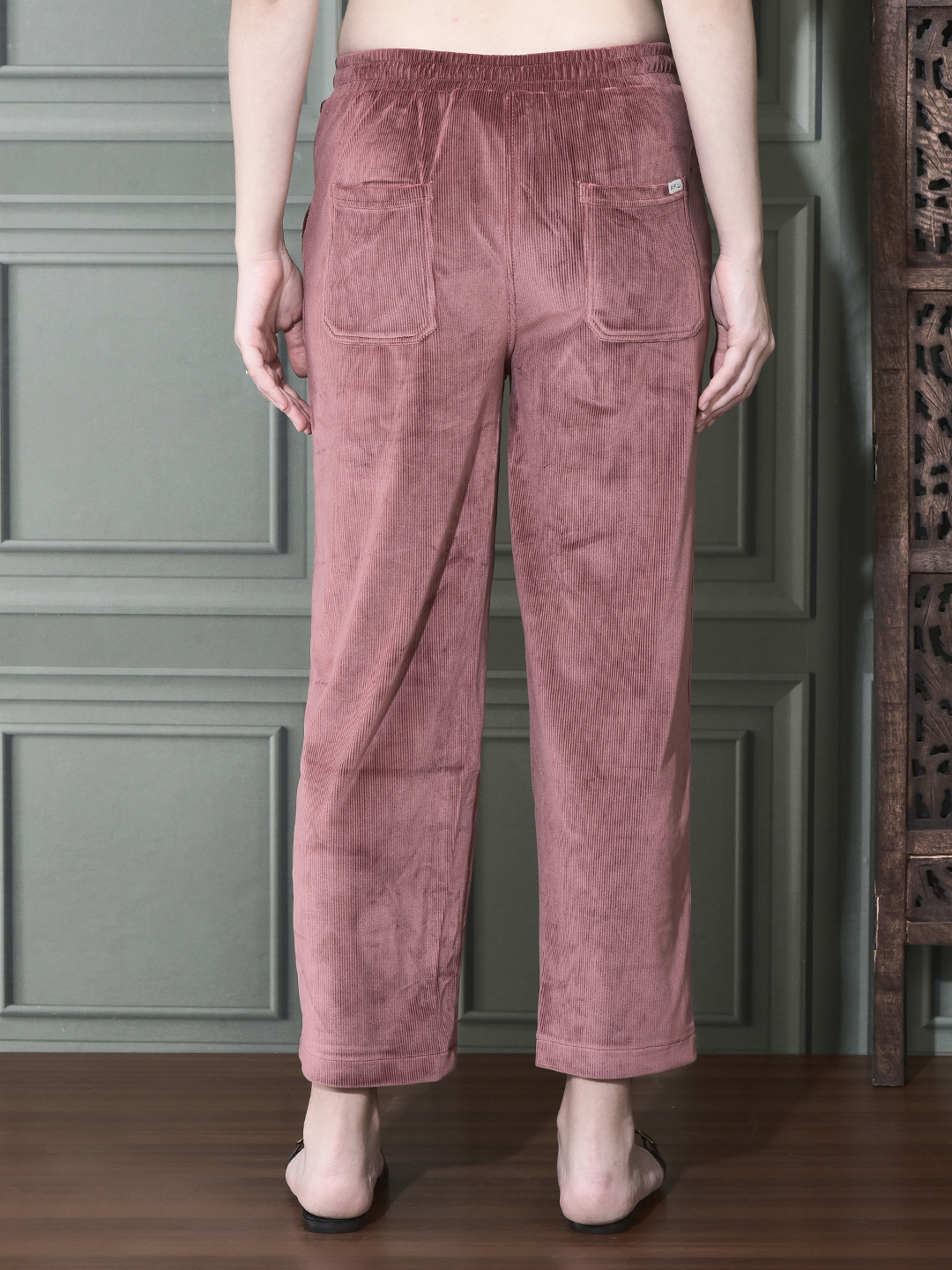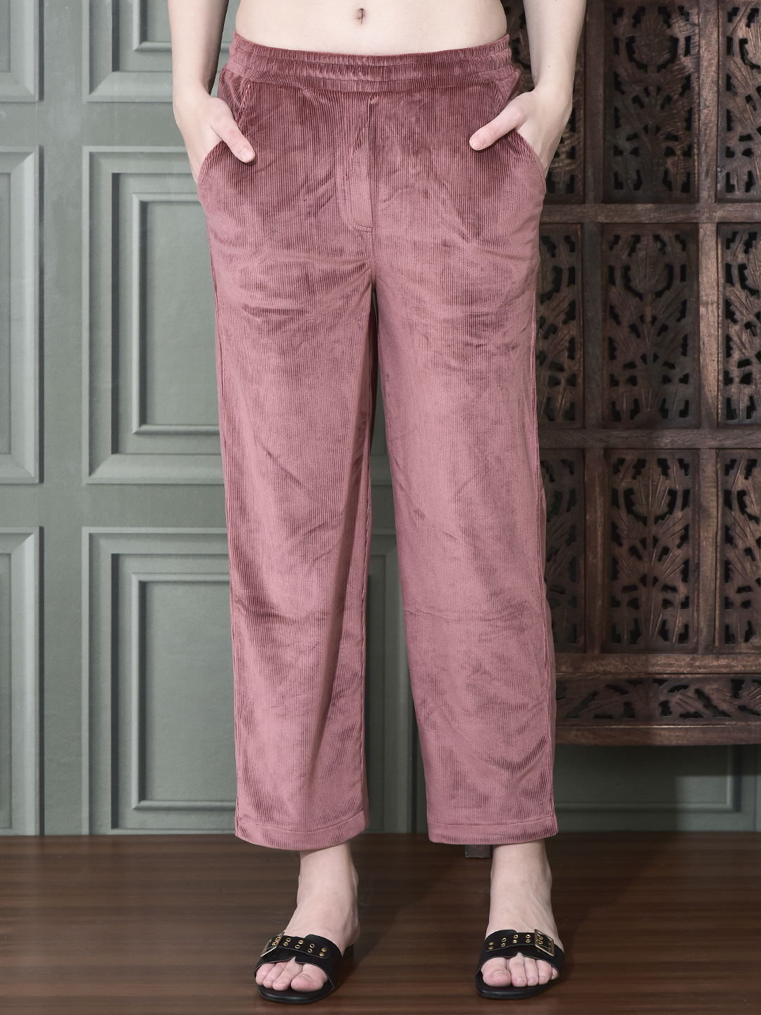 Step into cozy elegance with the CORD-151 Trousers. These stylish pants are crafted from a soft, thick Warm Velvet Corduroy fabric, featuring wide wales that offer a rich, plush texture and excellent warmth. The high-quality blend of Poly Viscose Spandex ensures both durability and a comfortable stretch, making them perfect for all-day wear. Designed in a relaxed wide-leg silhouette and a versatile Full Length, the CORD-151 features a flattering High Waist fit for a streamlined look. Fabric: Ultra-soft Warm Velvet Corduroy Composition: Durable and stretchy Poly Viscose Spandex Fit: Relaxed wide-leg silhouette with a clean Full Length and a flattering High Waist fit Waistband: Comfortable, wide elasticated waistband Colors- Mauve, Onion, Navy Blue, Coffee