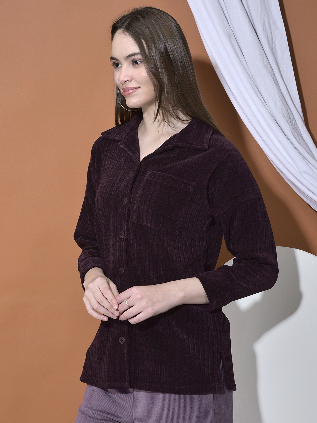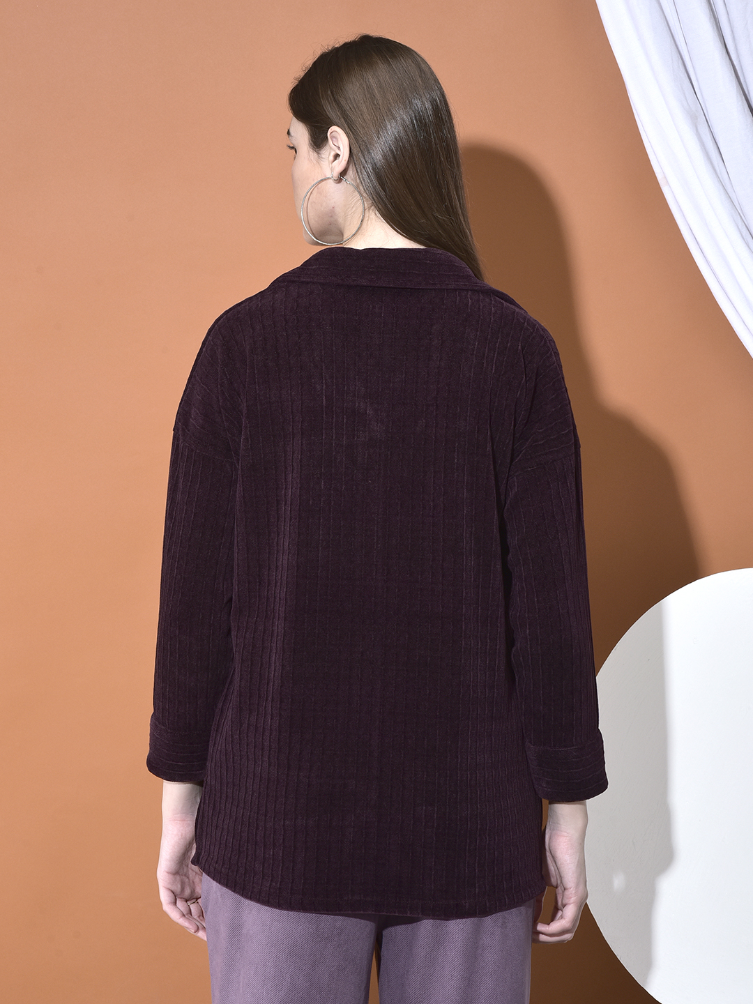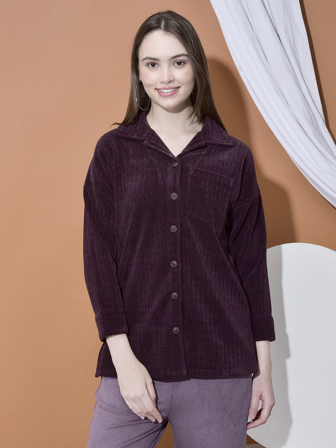 This Textured Button-Front Shirt/Shacket offers a perfect combination of comfort and contemporary style. Designed to be worn as a structured oversized shirt or a lightweight jacket, it is crafted from a soft and warm Poly Viscose Blend fabric, making it an excellent layering piece for any season. Fabric: Made from a soft and warm Poly Viscose Blend Design: Versatile overshirt or shacket style Fit: Relaxed and Slightly Oversized Fit (Boxy Fit) Pockets: Features a single chest pocket (as seen in the close-up image) Front Closure: Full button-front closure with matte, tonal buttons. Colors: Black, Wine