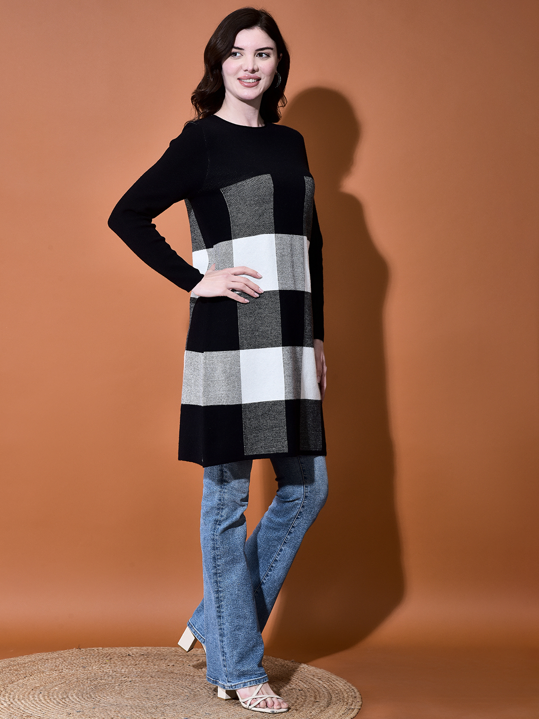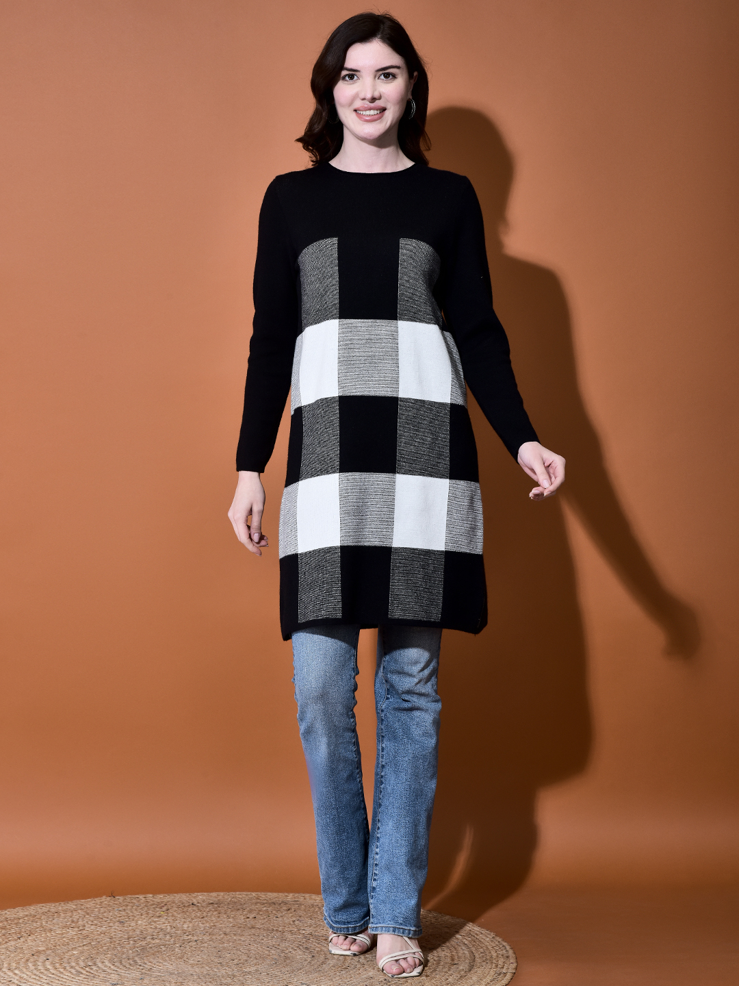 Make a bold statement this season with our Checkmate Woolen Long Tunic. Featuring a striking block pattern, this tunic is designed to keep you warm and effortlessly stylish throughout the colder months. The tunic features a classic round neck and long sleeves, serving as a canvas for the eye-catching check/buffalo plaid pattern centered on the body. This pattern offers a fun, contemporary take on a cozy winter look.\r\nFabric for Warmth: Crafted from a high-quality, warm Viscose Nylon\r\nFit: Designed with a relaxed, longline fit\r\nLength: Longline; typically falls mid-thigh to just above the knee\r\nColors: Classic Black, Blush Pink\r\n\r\nSizing Note: This garment utilizes combined sizing (S/M, L/XL etc)
