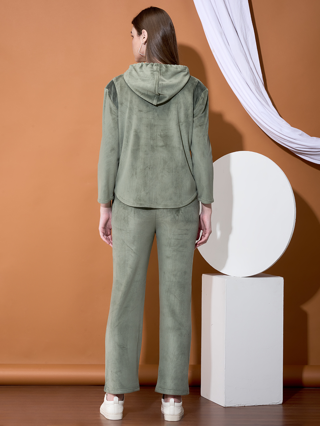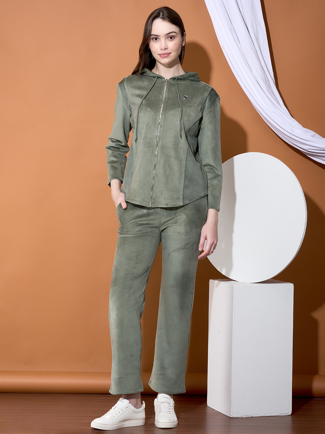Step into style and comfort with this velvet corduroy co-ord set, crafted to keep you warm, cosy, and effortlessly chic. The set features a soft zip-up top with a drawstring neckline and matching straight-fit pants, designed to give you a relaxed yet polished look. Made from premium velvet corduroy, this outfit feels luxuriously soft on the skin—perfect for winter weather or the snuggle season. Whether you\\\'re lounging at home, stepping out for coffee, or travelling in comfort, this co-ord set blends ease with elegance. \r\nFabric: Premium Velvet Corduroy \r\nFit: Relaxed & Comfortable \r\nColors: Wine, Black, Olive