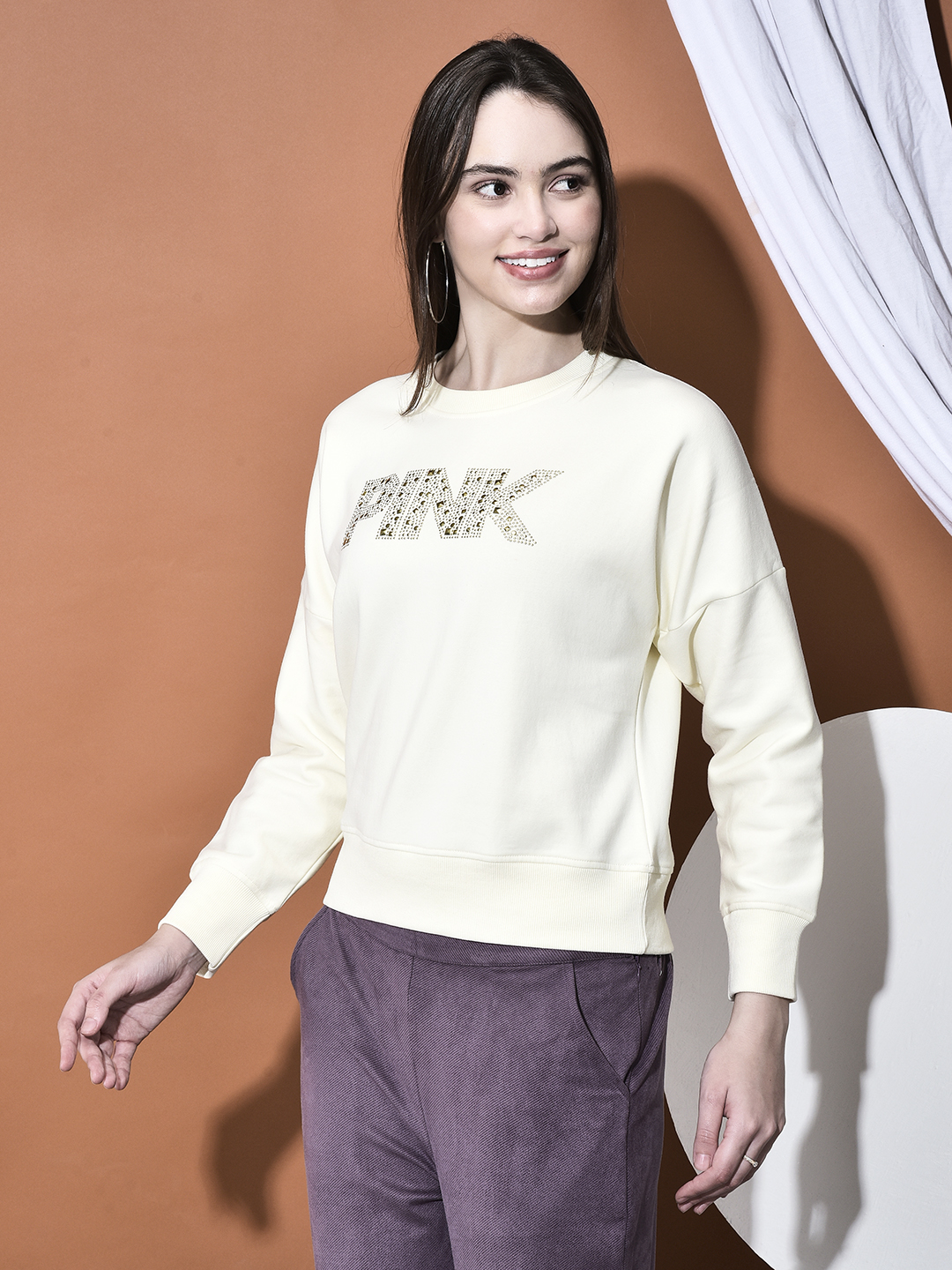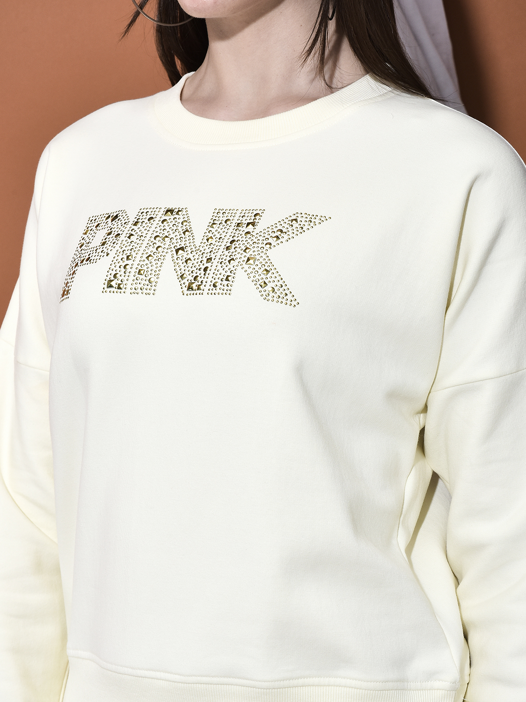 Define your casual winter style with The Modern Luxe Sweatshirt named PINK , a comfortable essential upgraded with fashionable detailing. This sweatshirt is crafted from a high-performance Warm Poly-Viscose-Spandex blend, offering the perfect balance of soft, cozy warmth, comfortable stretch, and durability. The smooth, fleece-like interior (implied for a warm sweatshirt) and relaxed fit make it perfect for layering. The design is elevated by prominent contrasting metallic embellishments on the chest (e.g., a bold word, like 'PINK'), transforming the classic silhouette into a statement piece. It's the perfect way to stay warm, relaxed, and stylish through the cold season.