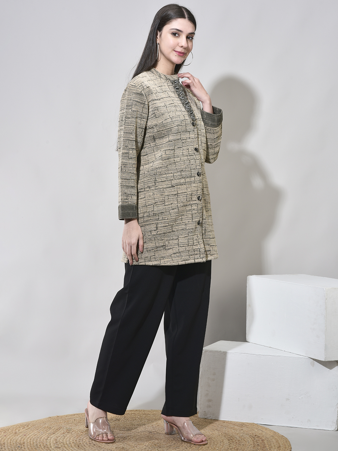 Step into sophistication with the Heritage Jacquard Co-ord Set, designed for elevated winter style. The set features a stunning long jacket-style top crafted from a luxurious Warm Poly Viscose Jacquard fabric. This blend provides essential warmth, a structured feel, and a rich, tactile texture that immediately catches the eye.