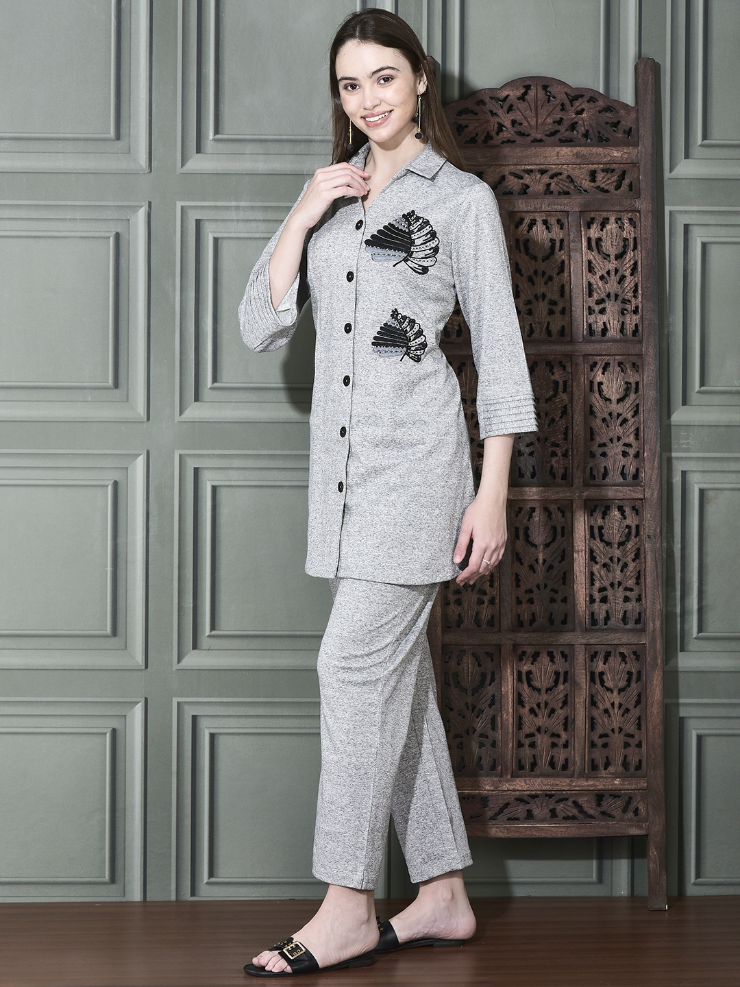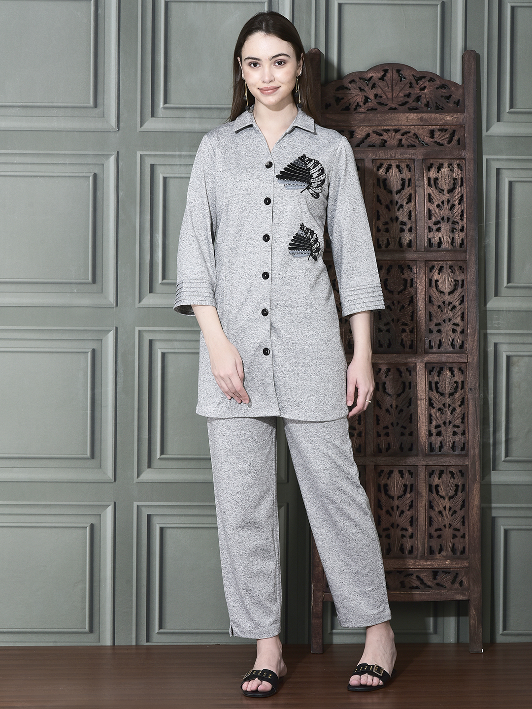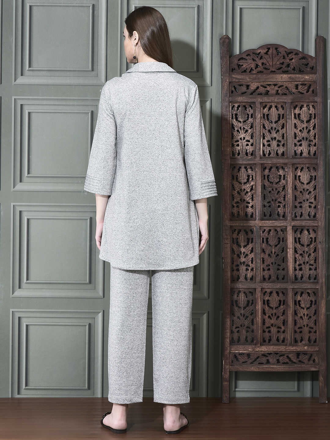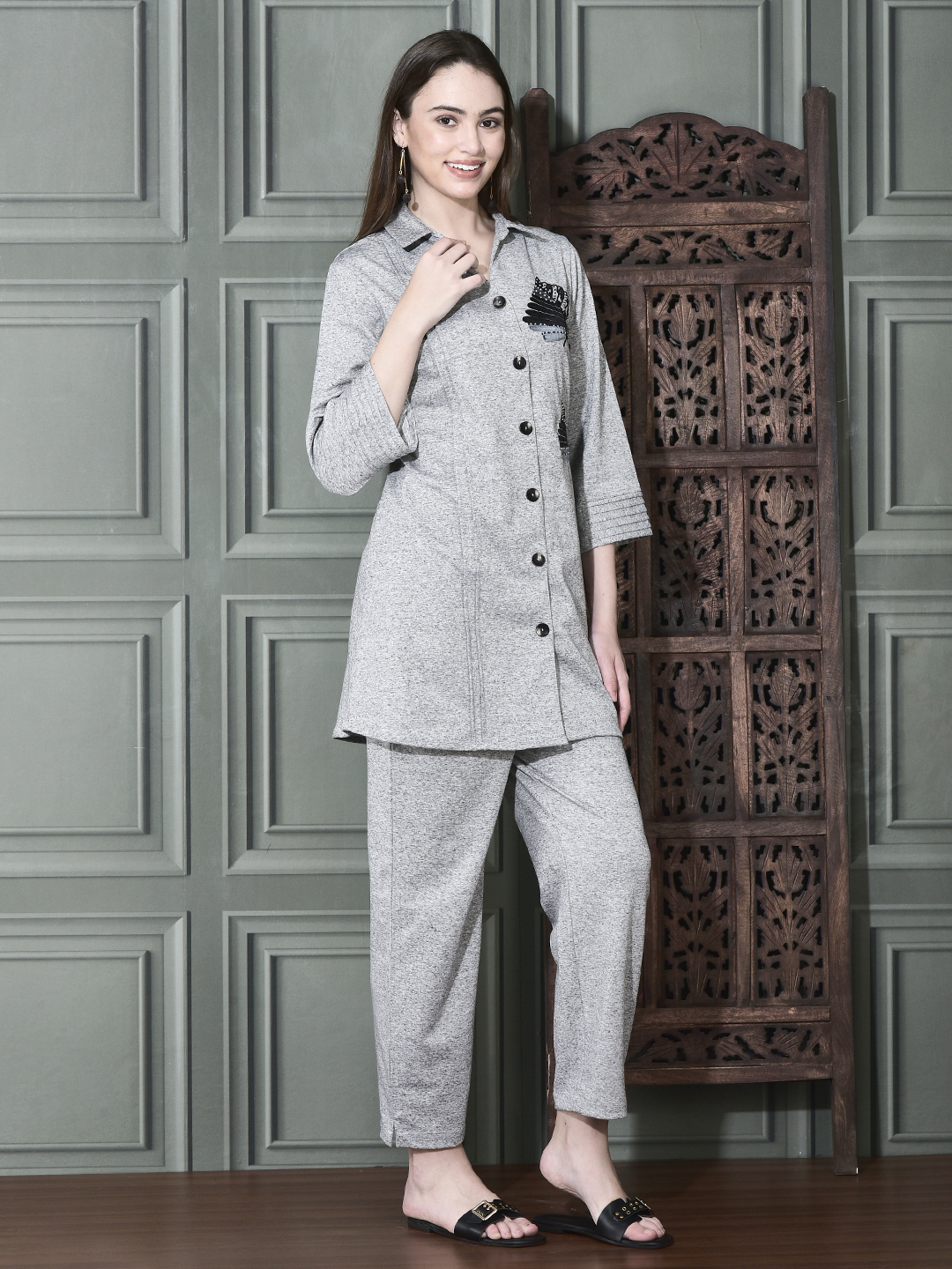 Drift into comfort this winter with The Cozy Whisper Lounge Set, a perfectly coordinated button-down tunic and pyjama that blends sophisticated style with essential warmth. Crafted for your relaxation, this set features a soft, warm-touch fabric in soothing winter hues like Cloud Grey, Blush Pink, and Gentle Pistachio.