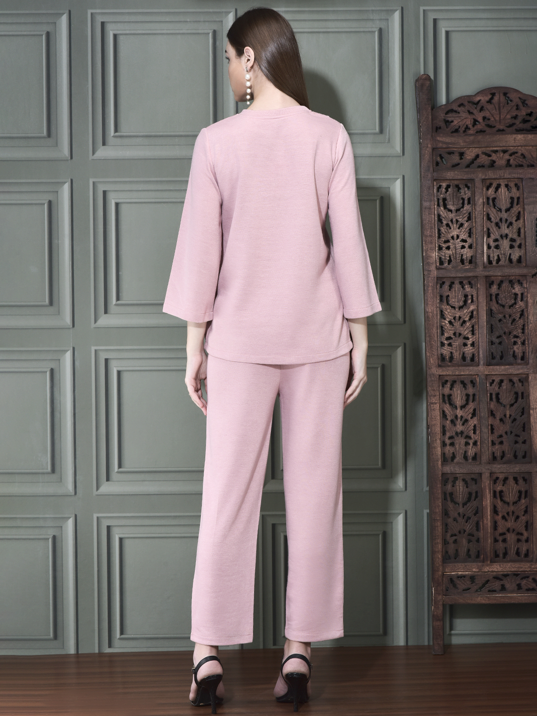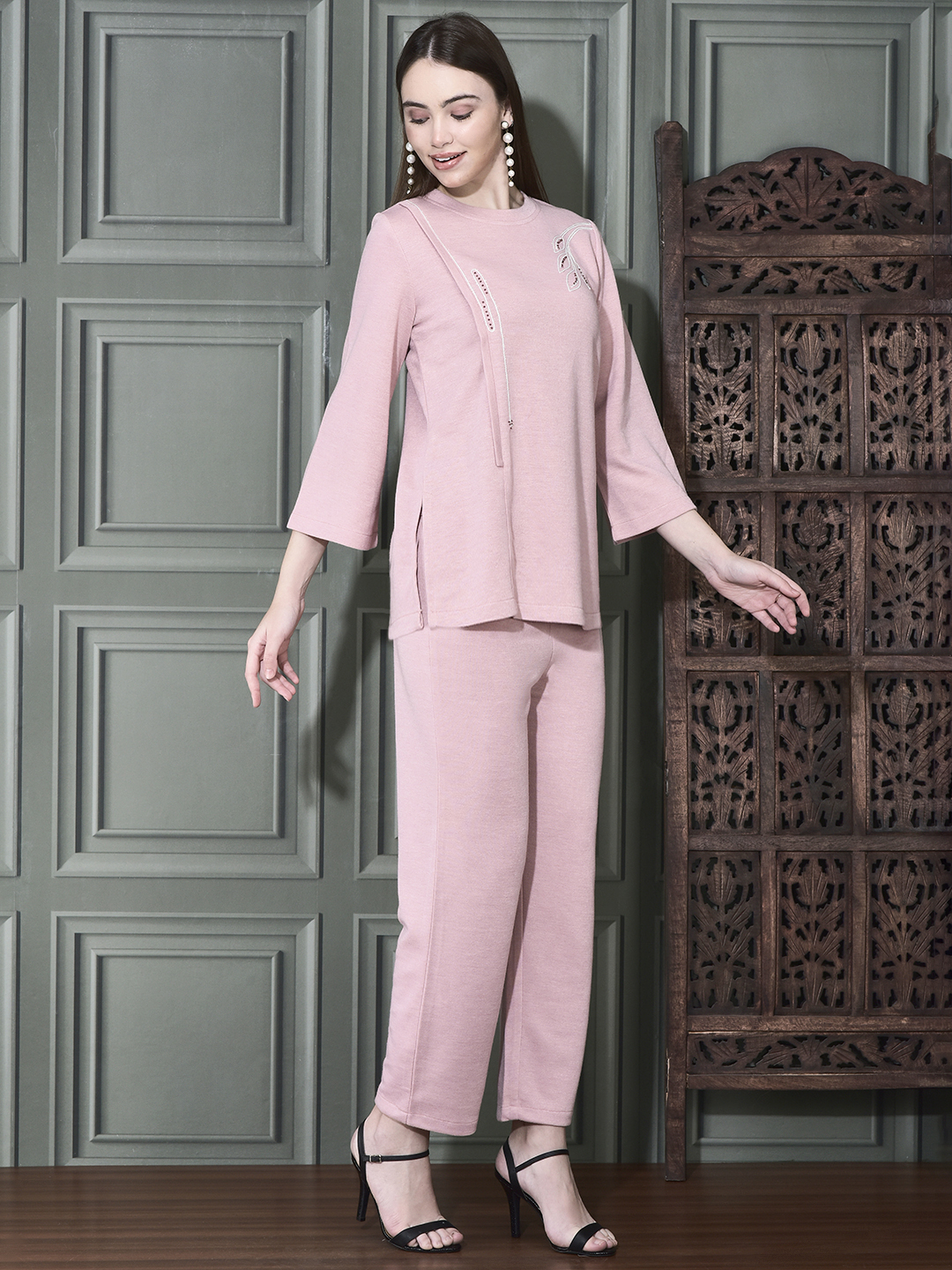 Wrap yourself in effortless warmth with The Winter Sprig Embellished Co-ord Set. This ensemble is designed for chic comfort, featuring a cozy, soft-touch warm Acrylic-Viscose-Spandex blend that provides superb insulation and a flattering drape.