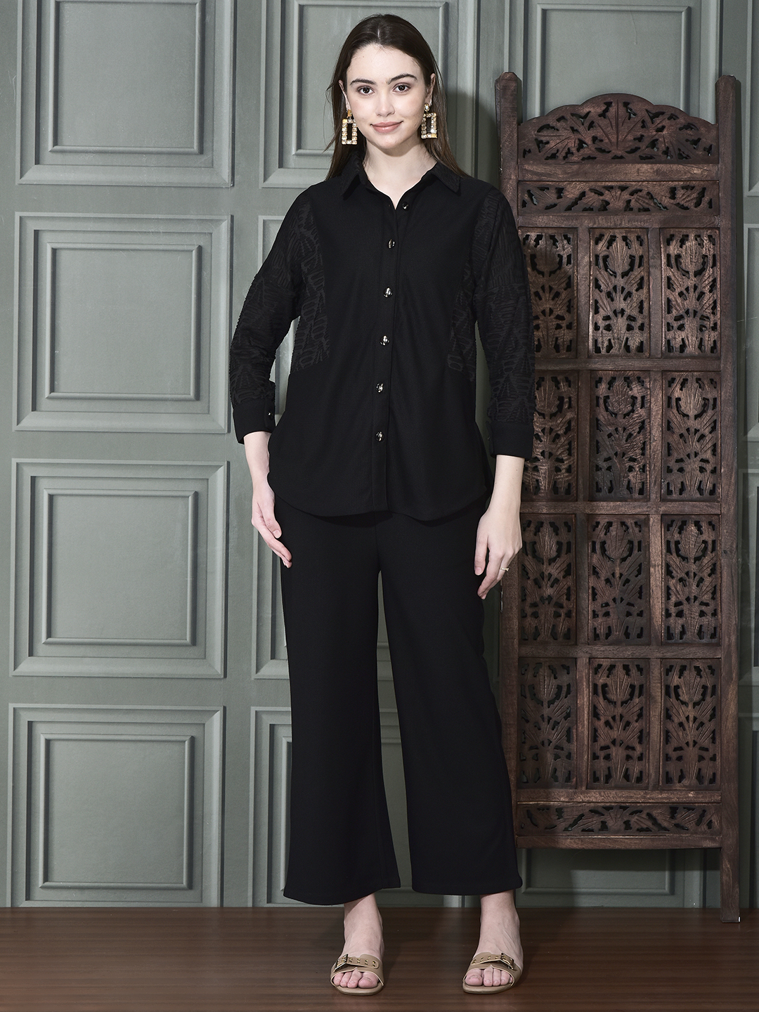 Step out in sophistication and comfort with our Warm Tonal Texture Co-ord Set. This two-piece ensemble features a stylish button-down shirt and perfectly matching trousers, crafted from a warm and soft Polyviscose Spandex blend.