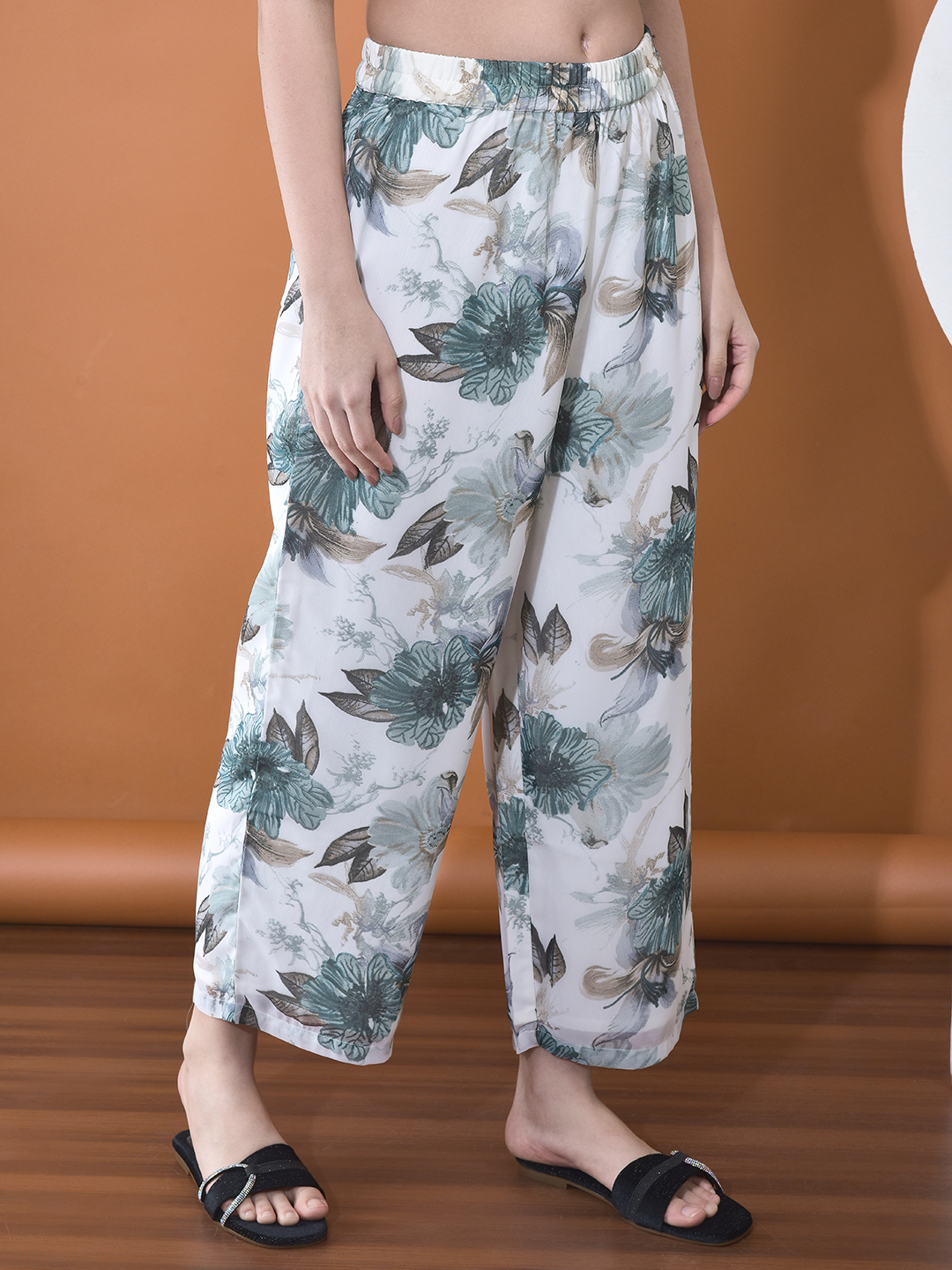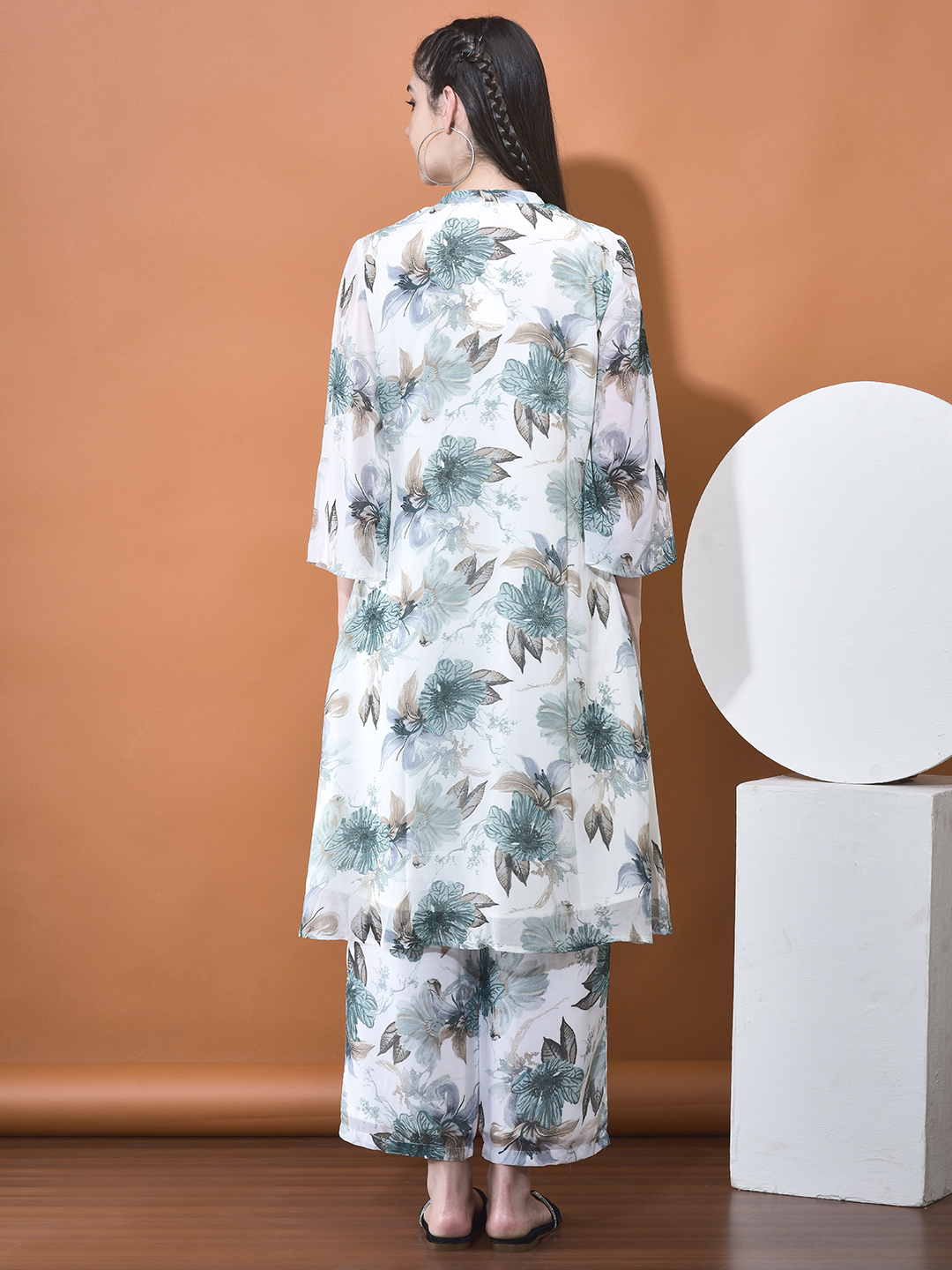 Ethereal Blooms: Floral Georgette Co-ord Set Embrace the effortless charm of summer with our Floral Georgette Co-ord Set. Designed for the modern woman who values both style and comfort, this two-piece ensemble features a delicate, oversized floral print in soothing shades of teal, sage, and earthy browns against a crisp white backdrop.