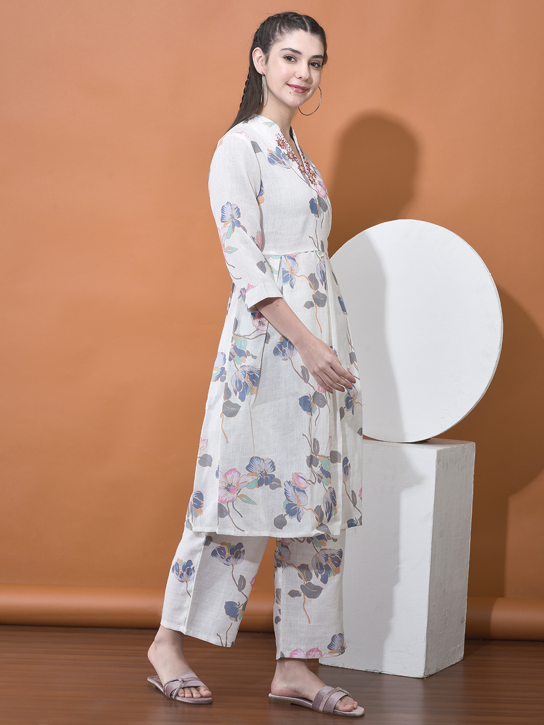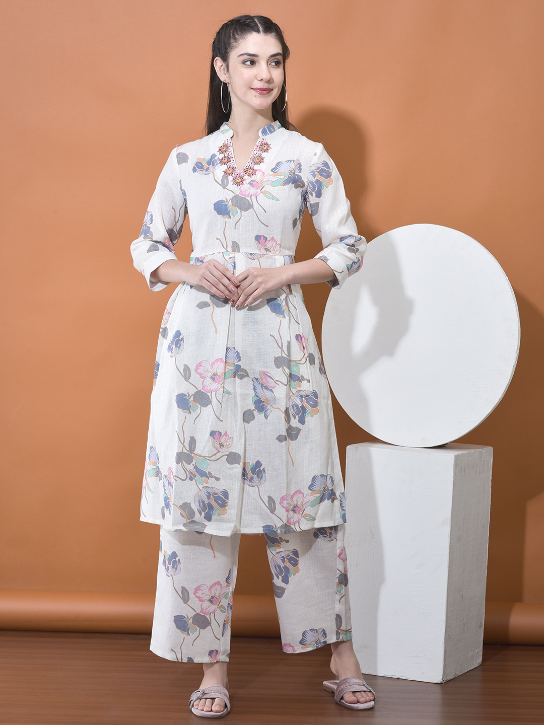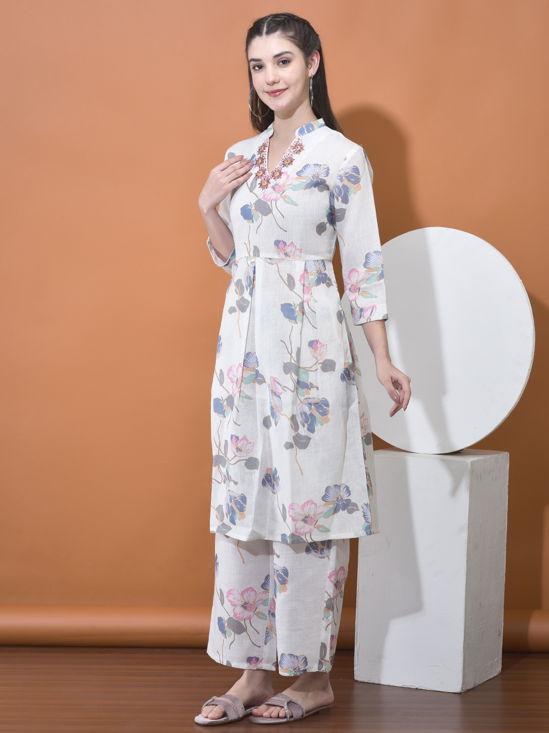 Experience the perfect harmony of heritage and contemporary style with our Cotton-Linen Blend Floral Co-ord Set. This ensemble is meticulously crafted for the woman who seeks a polished yet relaxed silhouette for the warmer months. Featuring a soft ivory base adorned with artistic, multi-hued botanical illustrations in shades of dusty rose, slate blue, and amber, this set is a true summer essential.