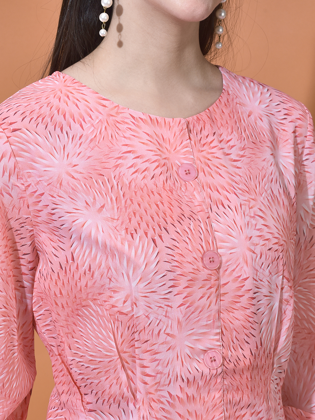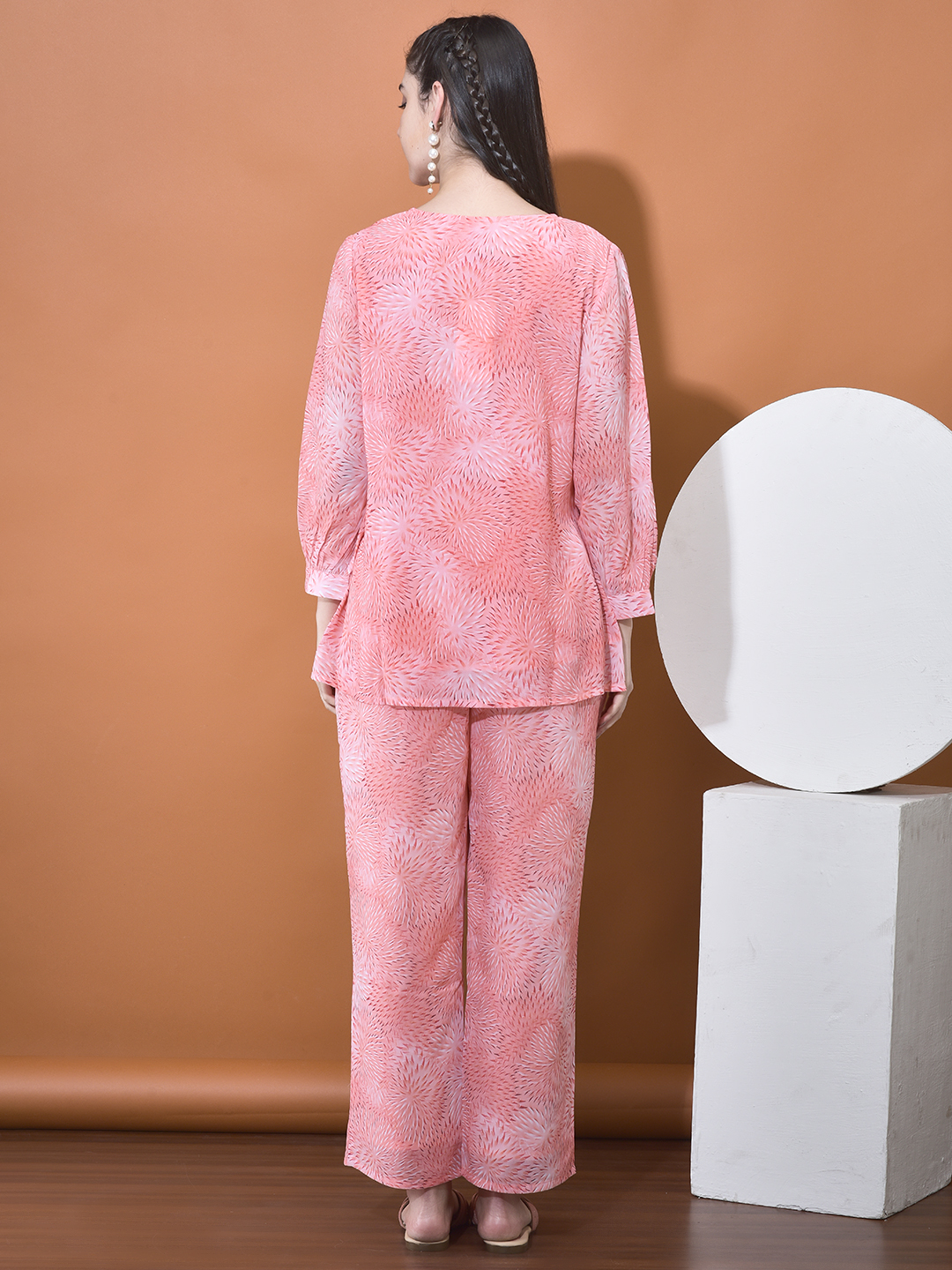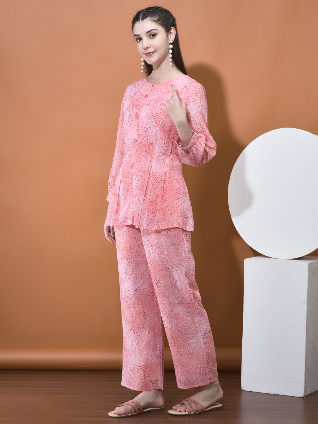 Step into the spotlight with our Poly Georgette Co-ord Set. This ensemble combines a high-fashion architectural silhouette with the airy, lightweight feel of georgette. The standout feature is the intricate, radial pleated texture that adds depth and a modern "crinkle" aesthetic to the soft coral-pink hue