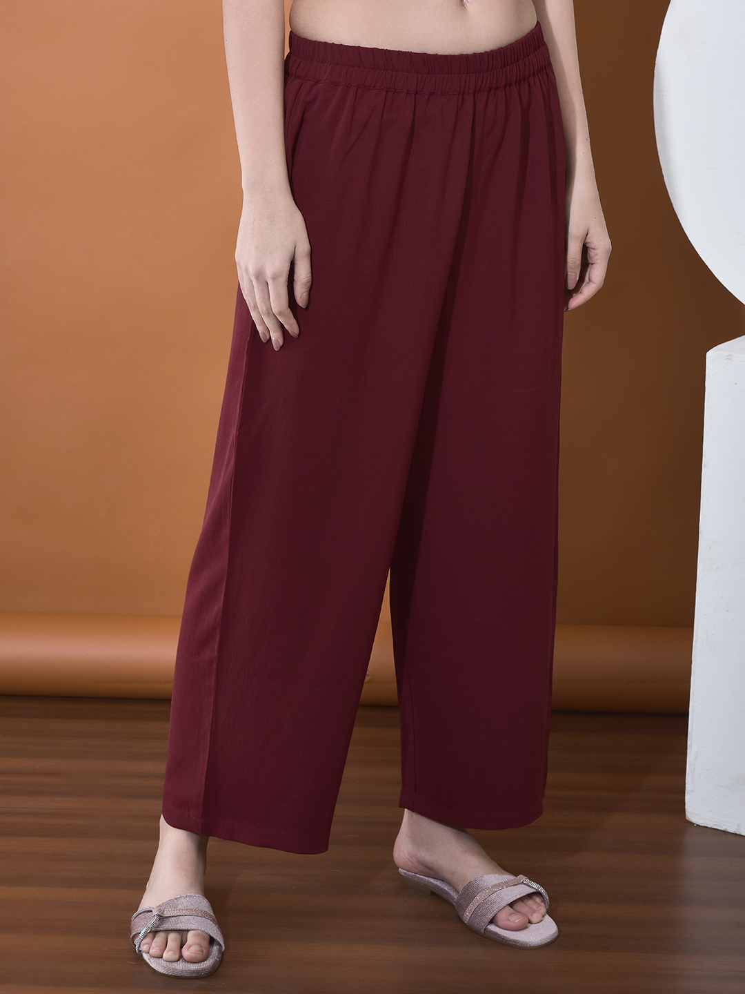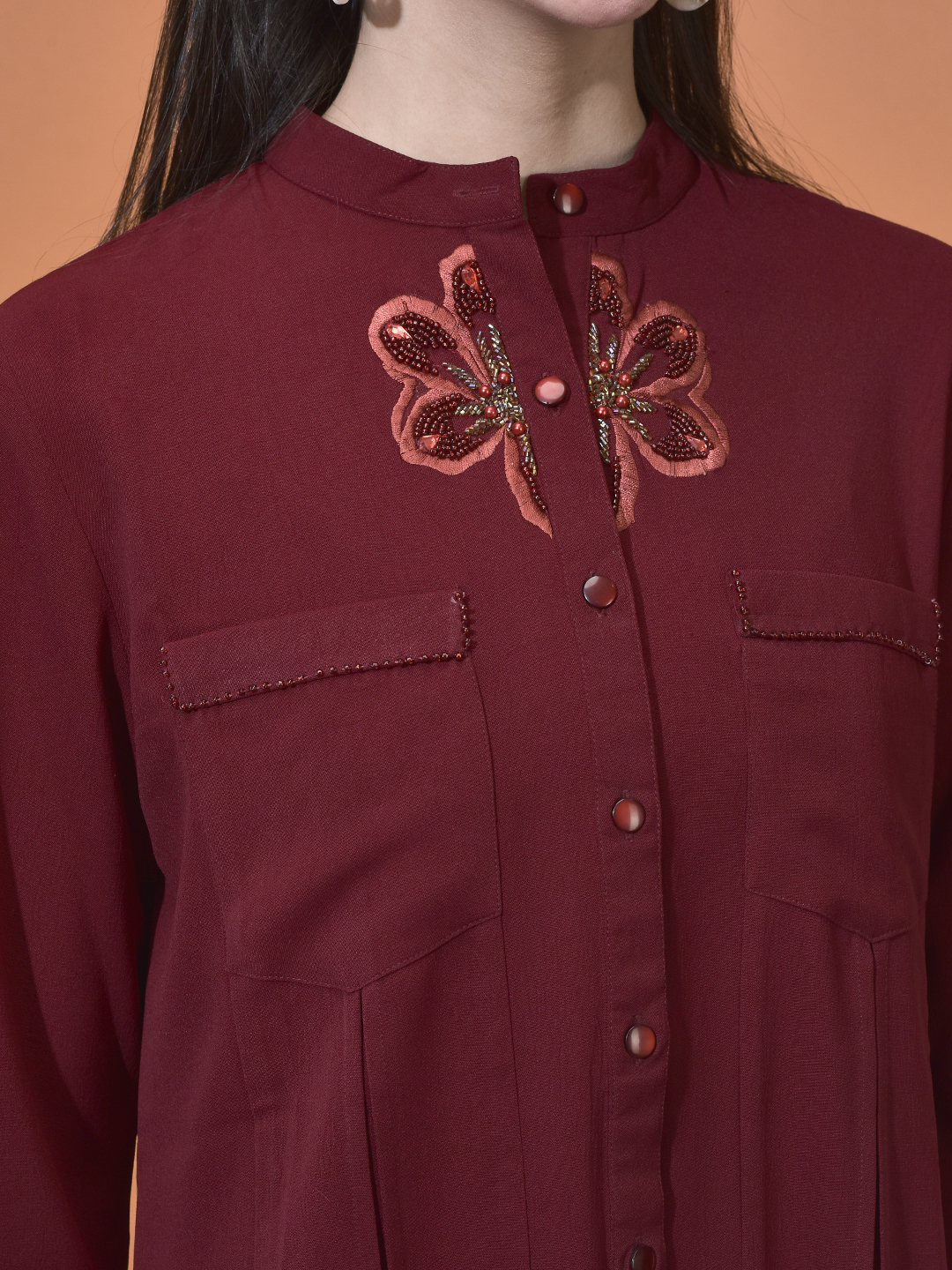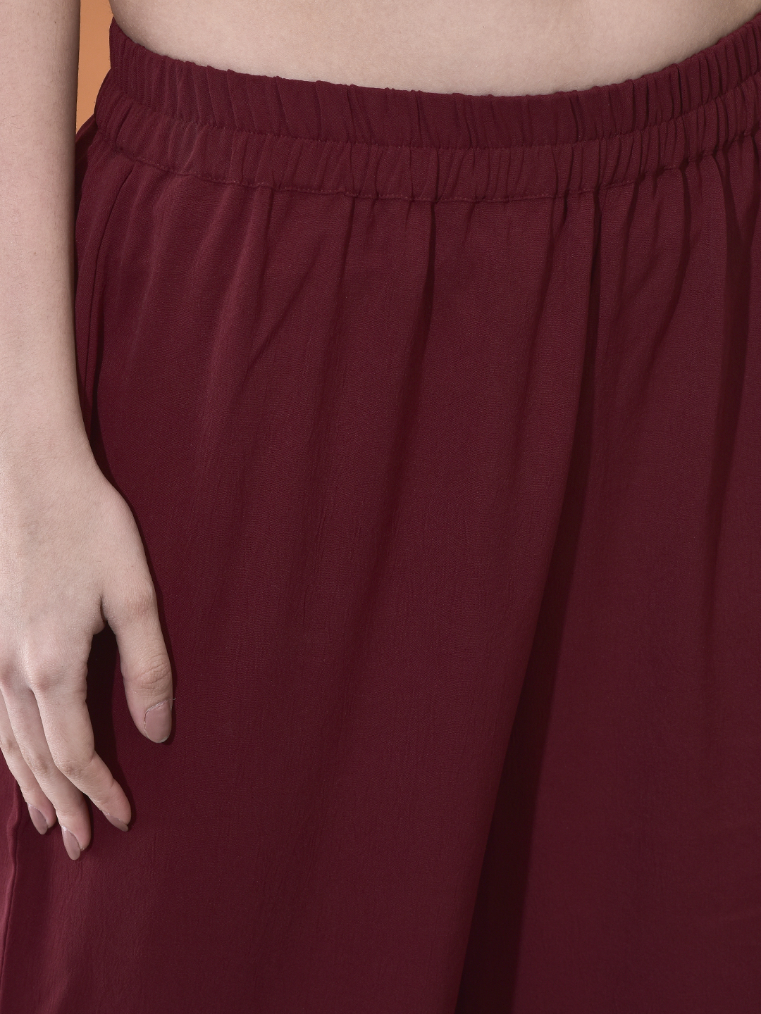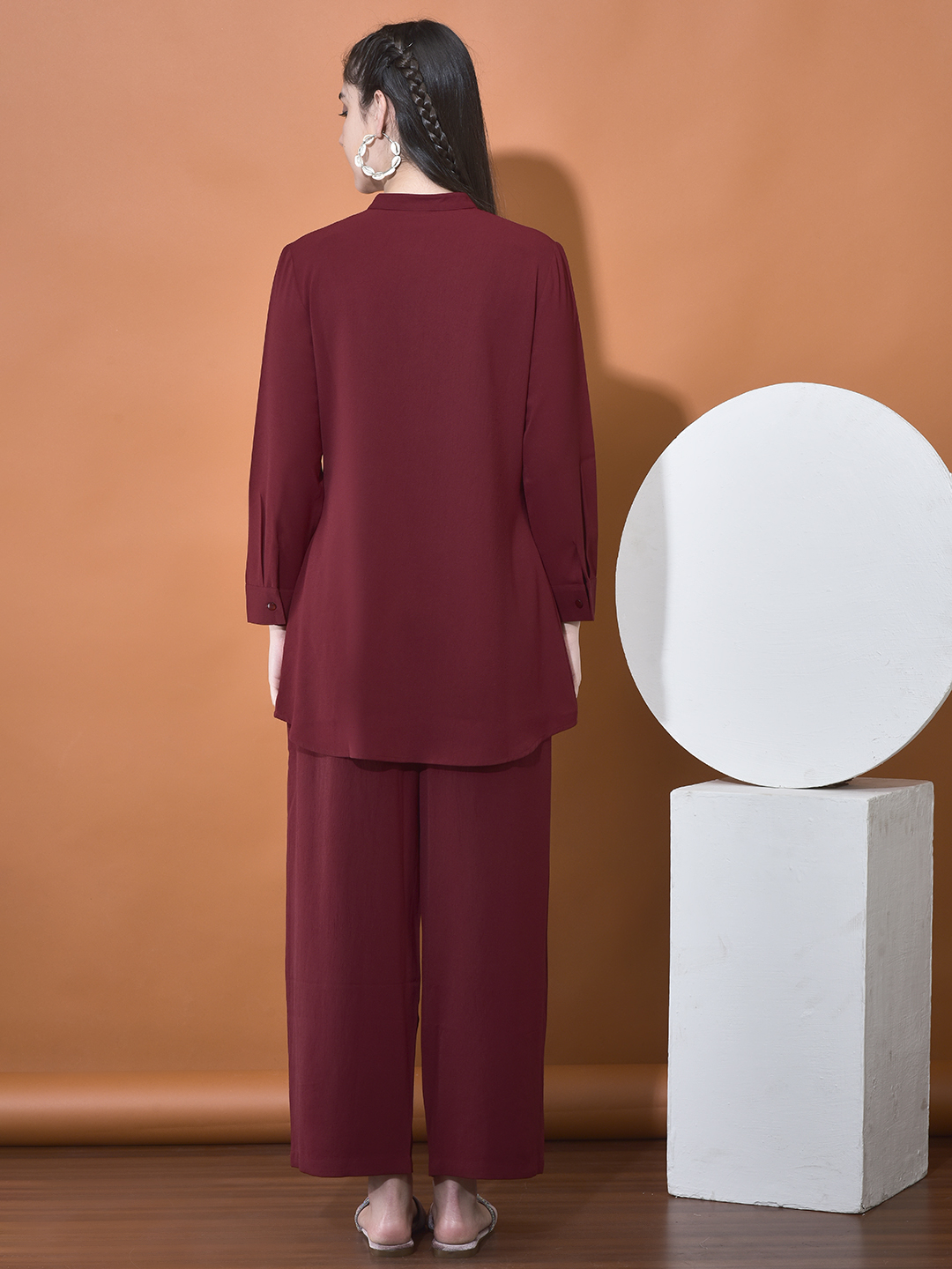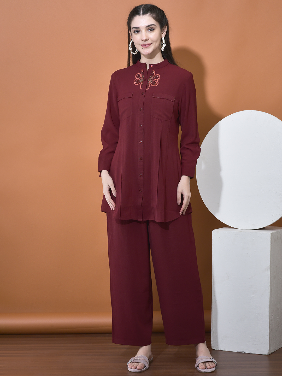 Make a statement with our Poly-Spandex Co-ord Set in a rich burgundy wine. This ensemble features a meticulously tailored longline tunic paired with fluid trousers, highlighted by artisanal embroidery that brings a touch of nature-inspired luxury to your wardrobe.