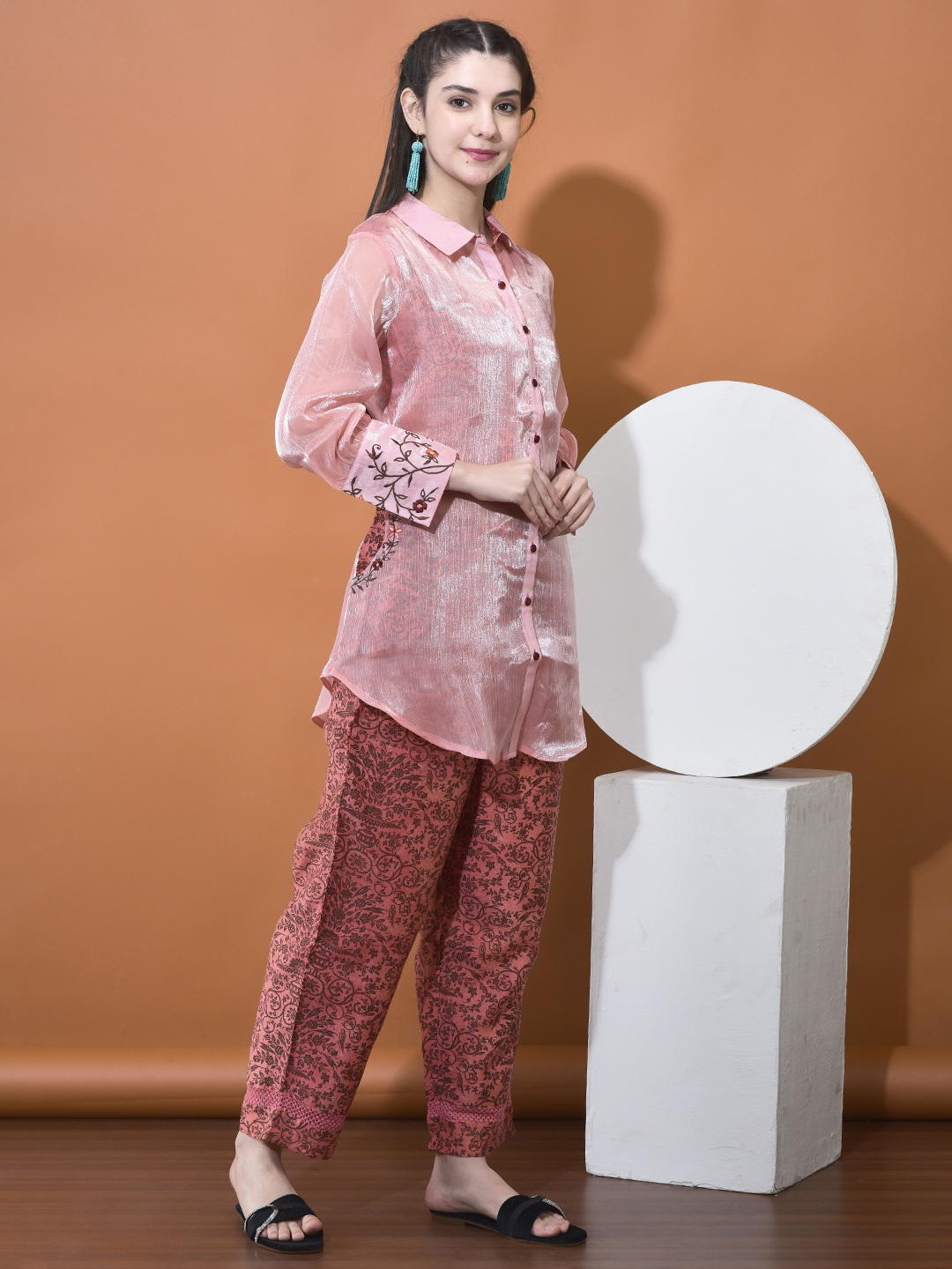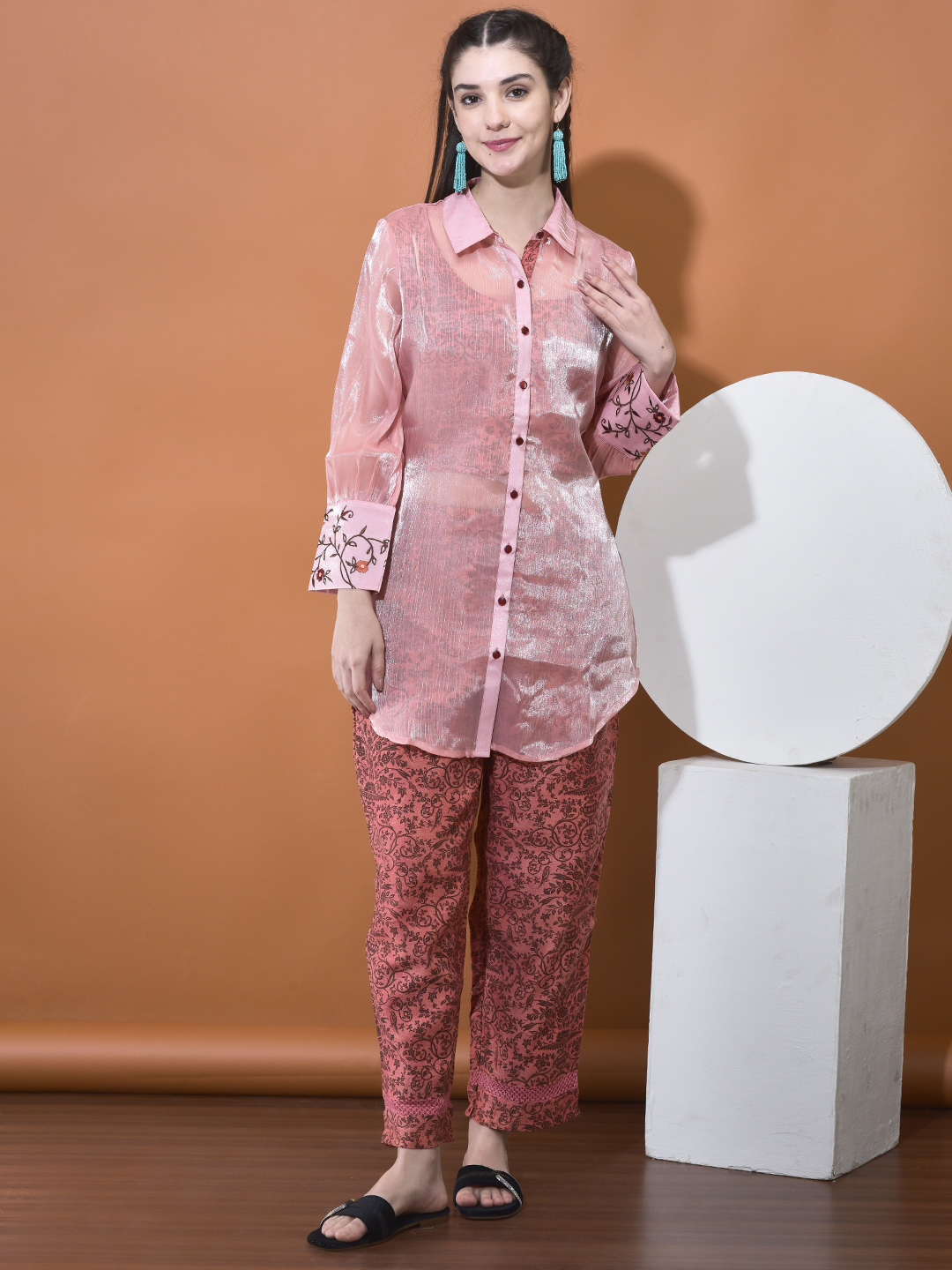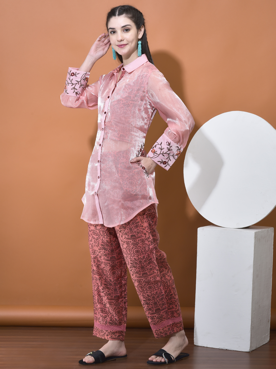 Elevate your style with our unique Chanderi and Organza Co-ord Set. This set features a beautiful interplay of fabrics, utilizing a sheer, shimmering organza overlay that reveals a rich, printed Chanderi base underneath, creating a sophisticated \"shadow\" effect.