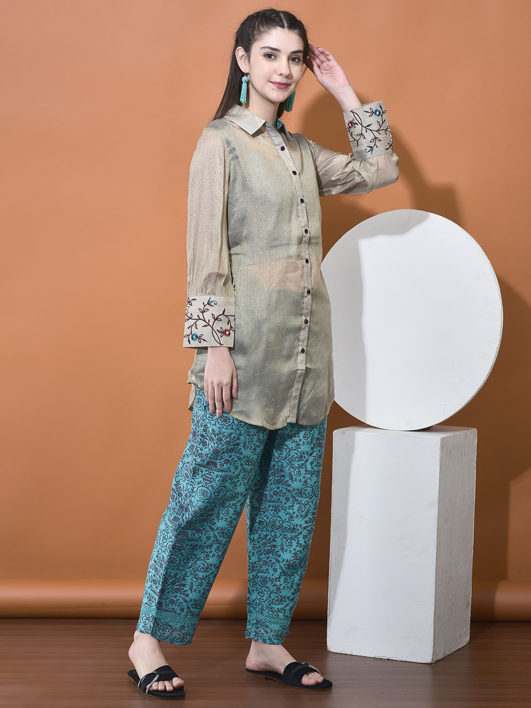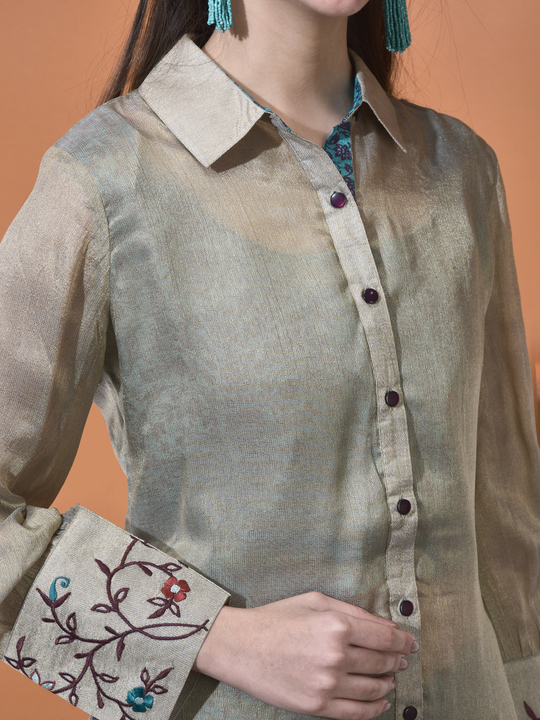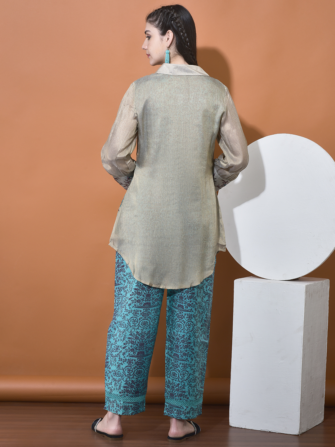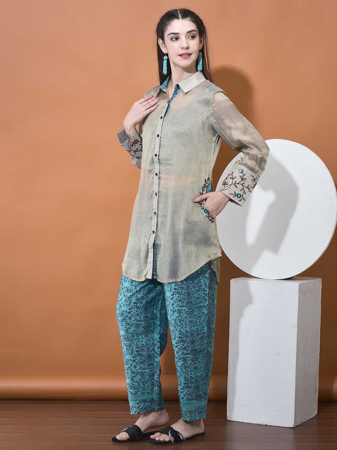Elevate your style with our unique Chanderi and Organza Co-ord Set. This set features a beautiful interplay of fabrics, utilizing a sheer, shimmering organza overlay that reveals a rich, printed Chanderi base underneath, creating a sophisticated "shadow" effect.