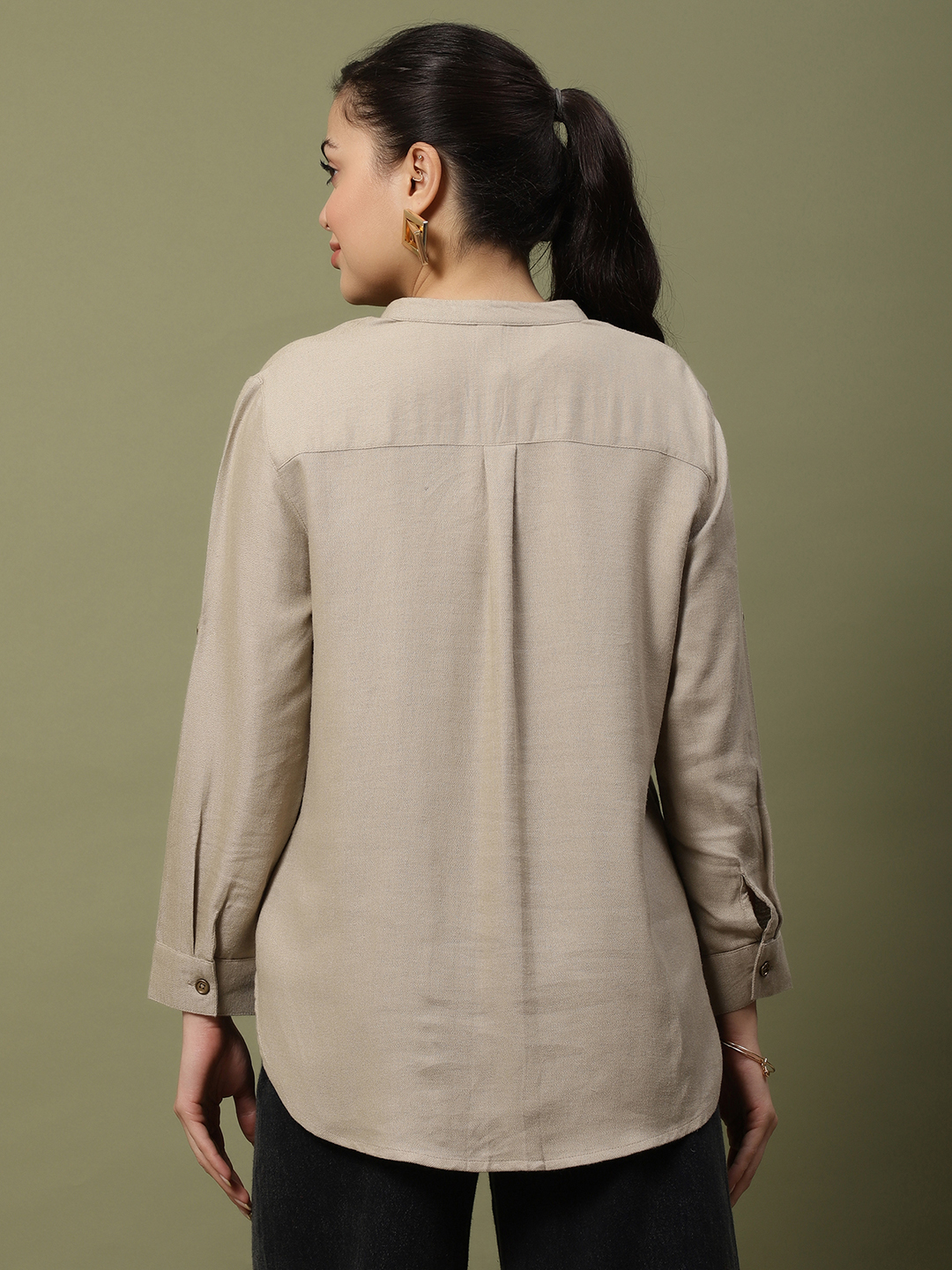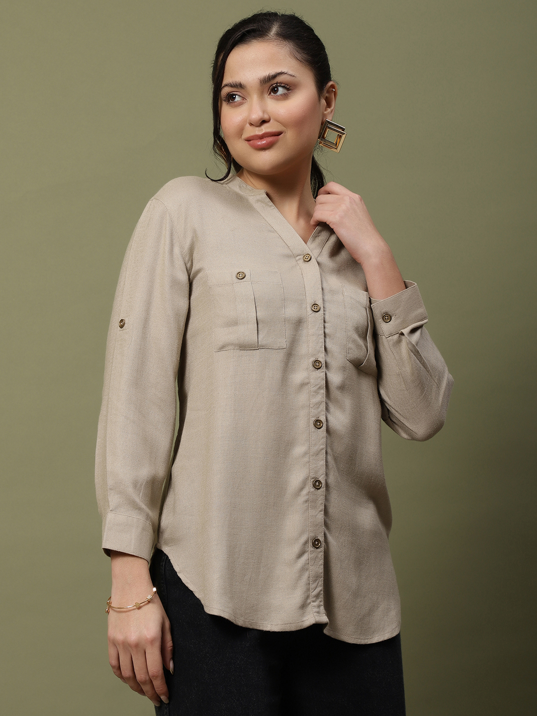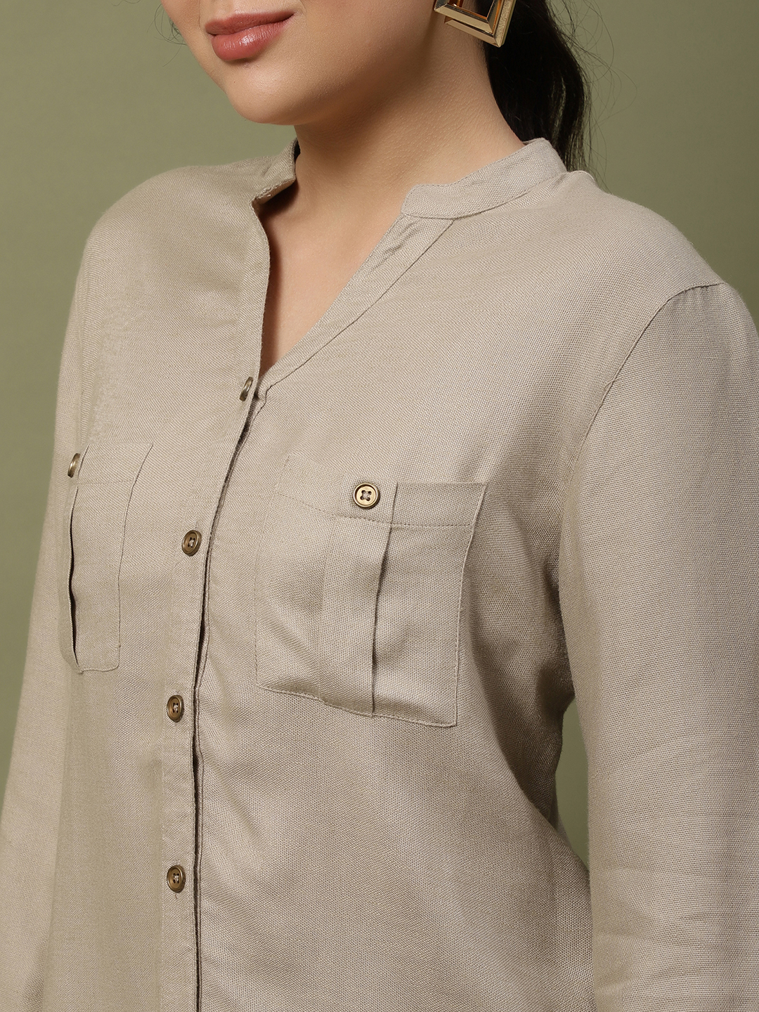 • Closure: Functional front placket with tonal, wood-finished buttons that add a touch of earthy sophistication.
