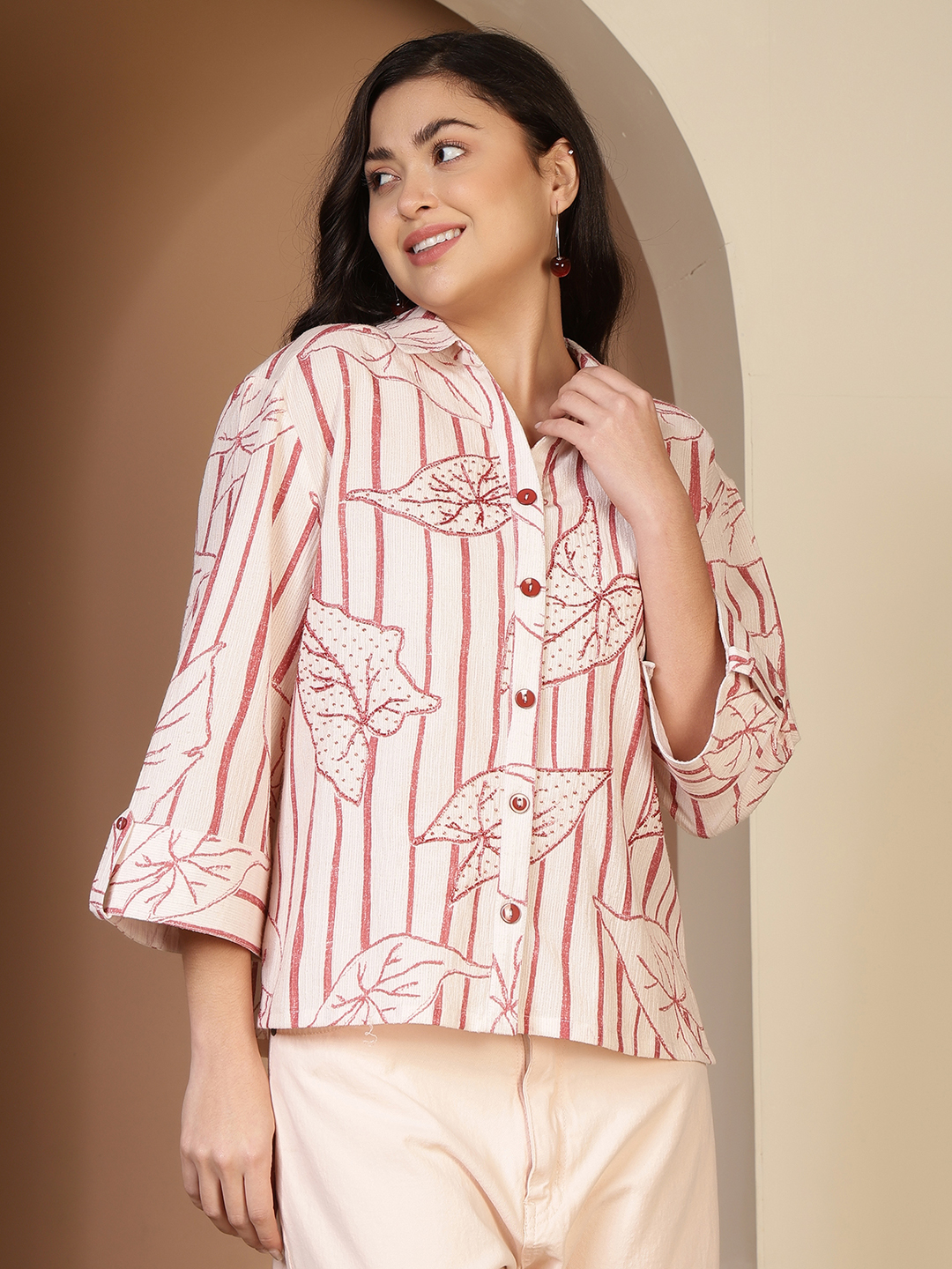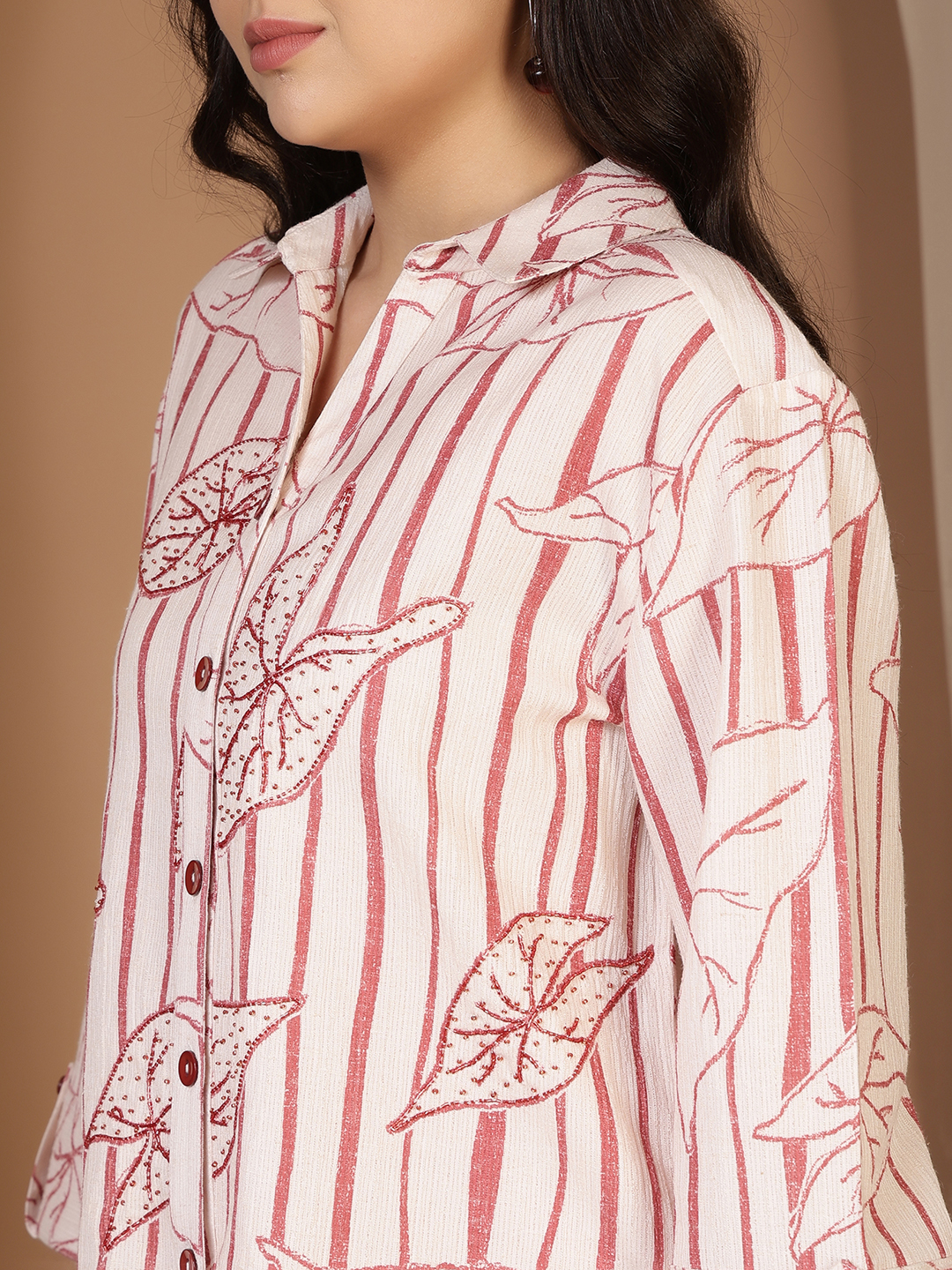 • The Embellishment: Features delicate hand-worked embellishments that highlight the leaf motifs, adding a subtle shimmer and high-end artisanal touch to the print.