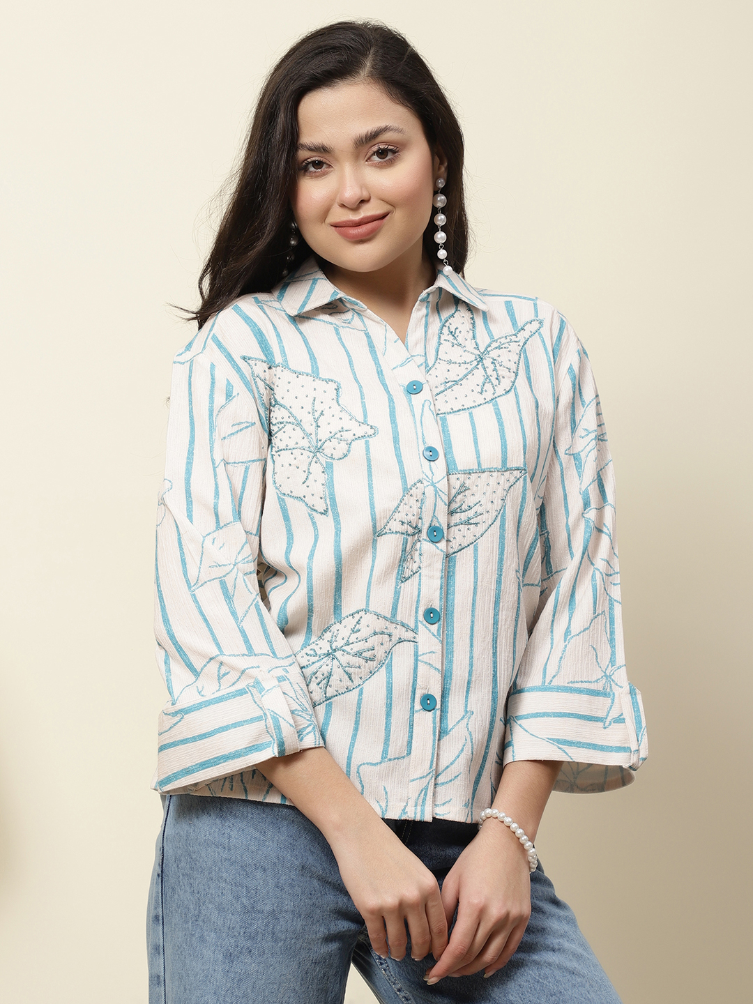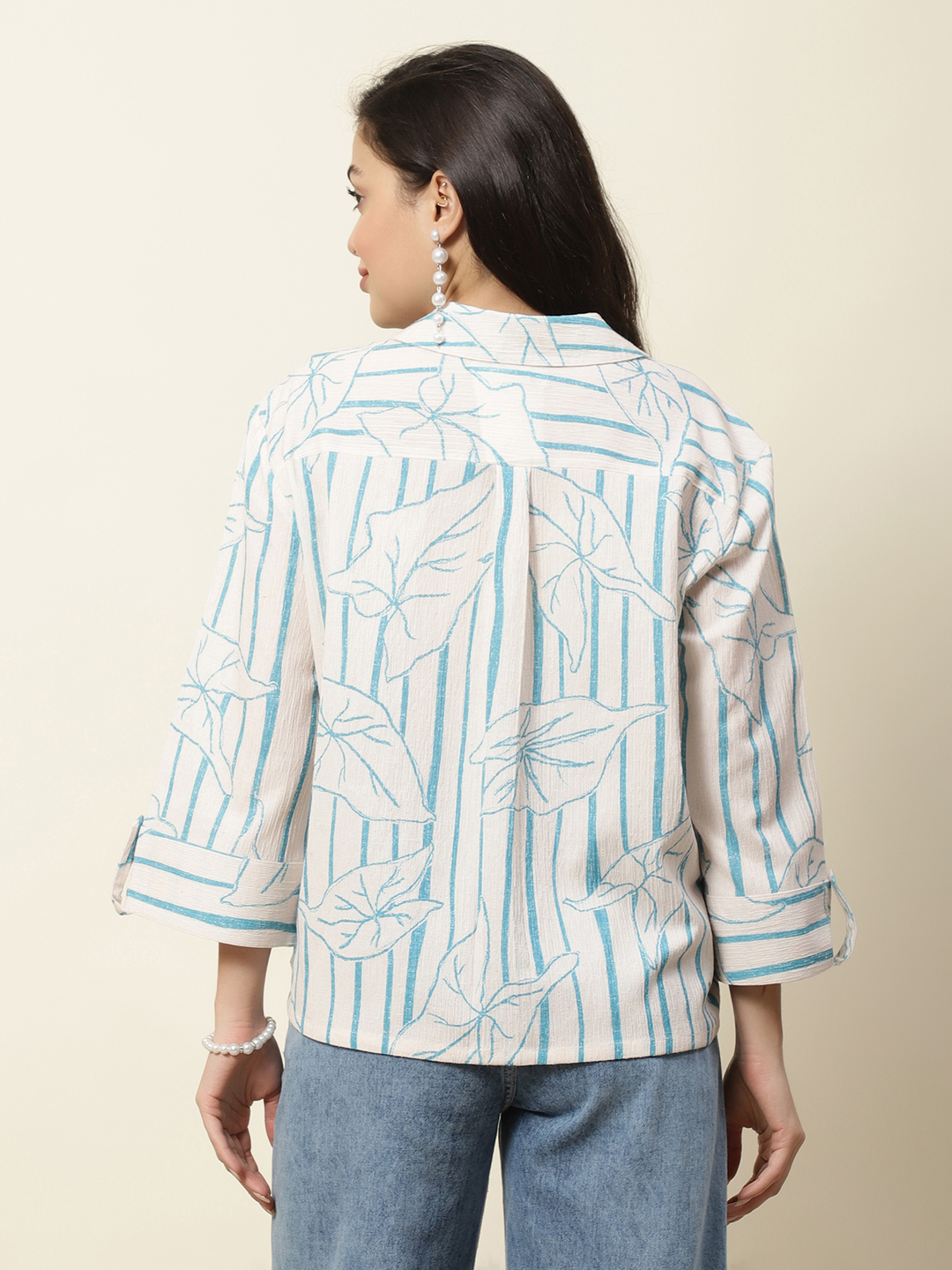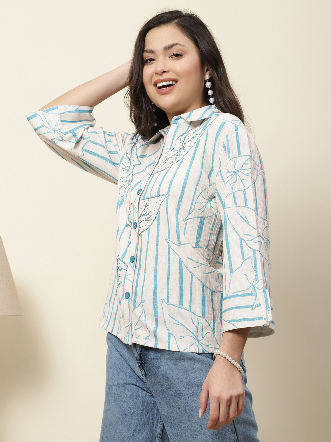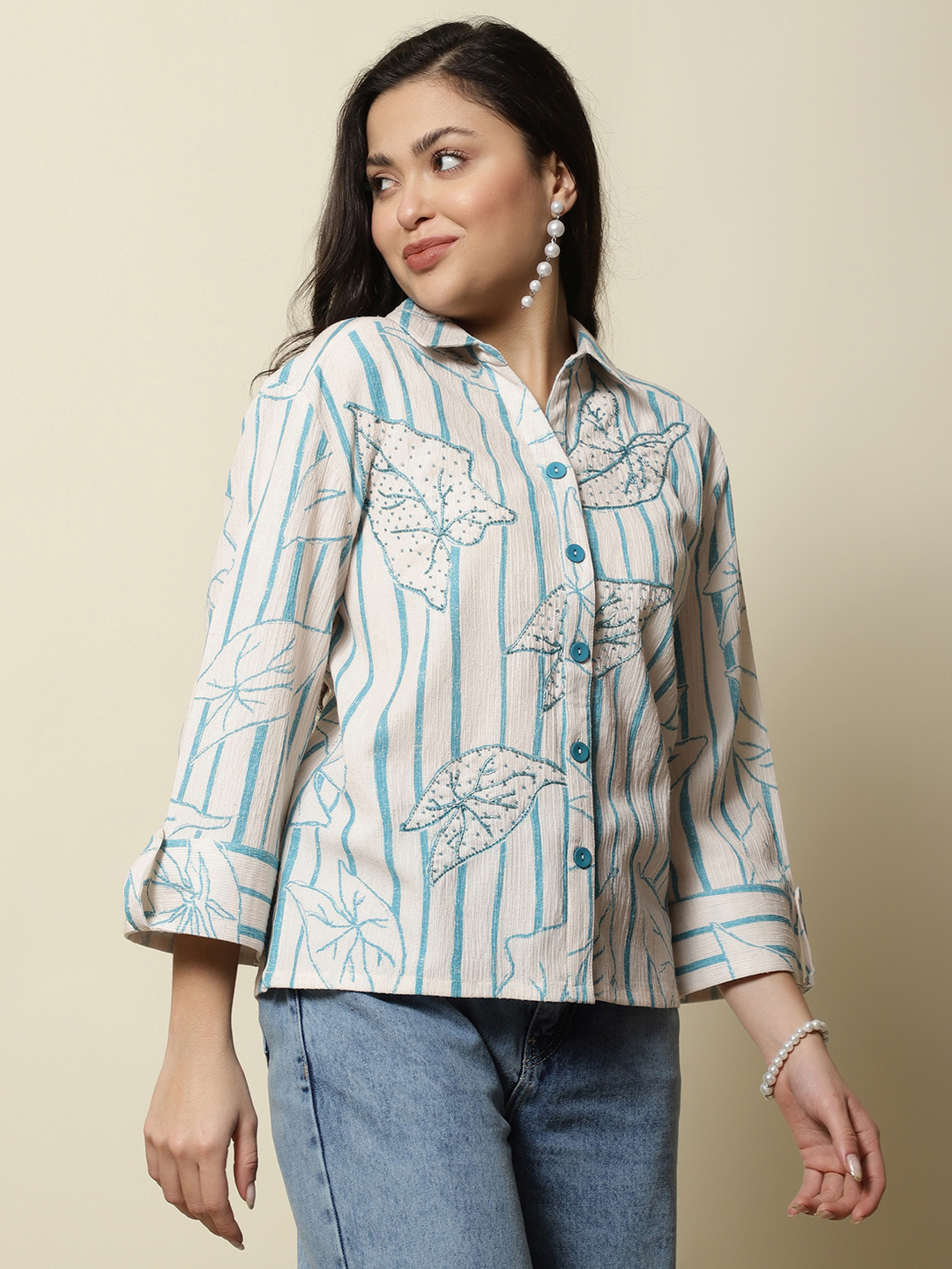 Infuse your wardrobe with natural elegance. This shirt features a striking hand-drawn botanical print overlaid on a classic stripe pattern, all on a Premium Cotton Slub Viscose base. The fabric’s characteristic "slub" texture gives it an organic, artisanal look, while the viscose blend ensures it stays soft and fluid against the skin.