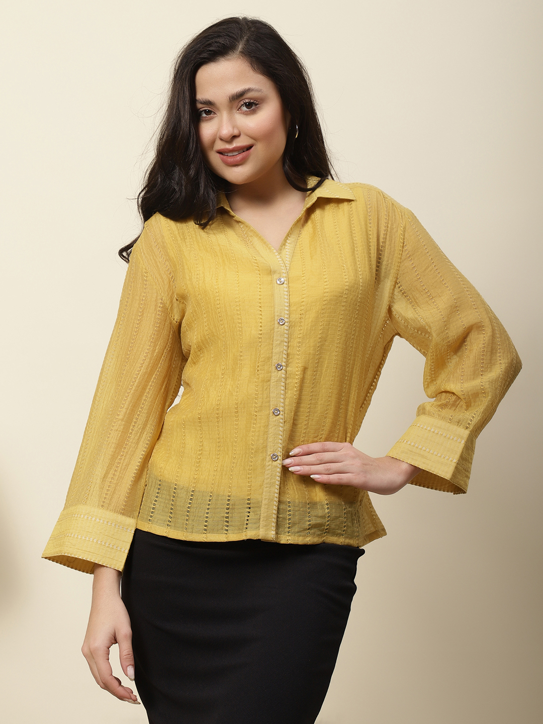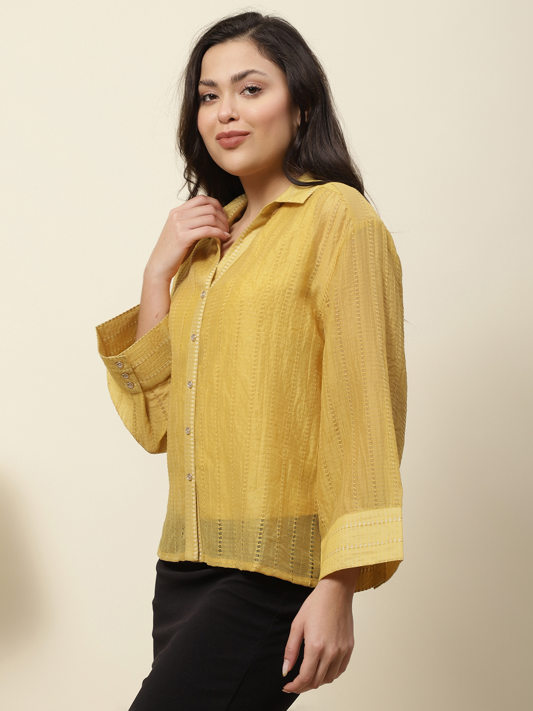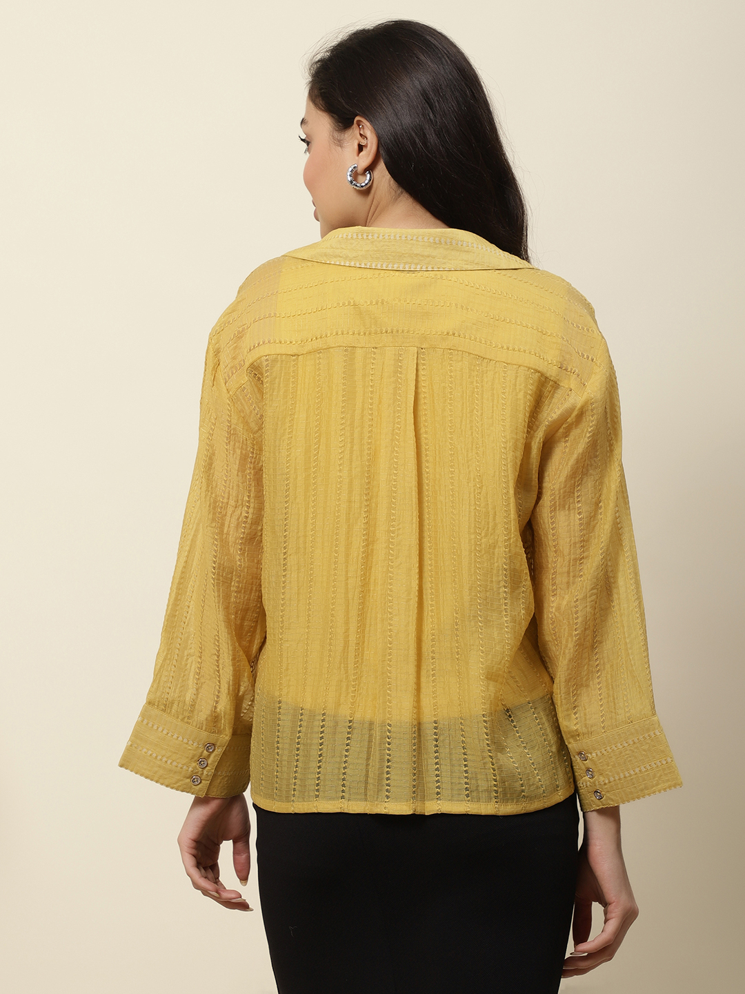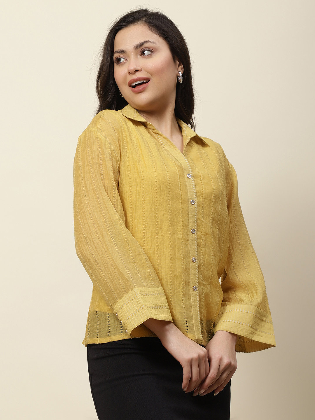 Refresh your smart-casual collection with this olive and mustard-toned, textured shirt. Featuring a vertical geometric weave, this piece combines a classic button-down aesthetic with a high-fashion, luminous finish. Designed with a relaxed fit, it offers a breezy feel perfect for layering or wearing as a standalone statement piece.