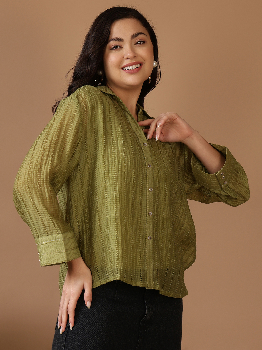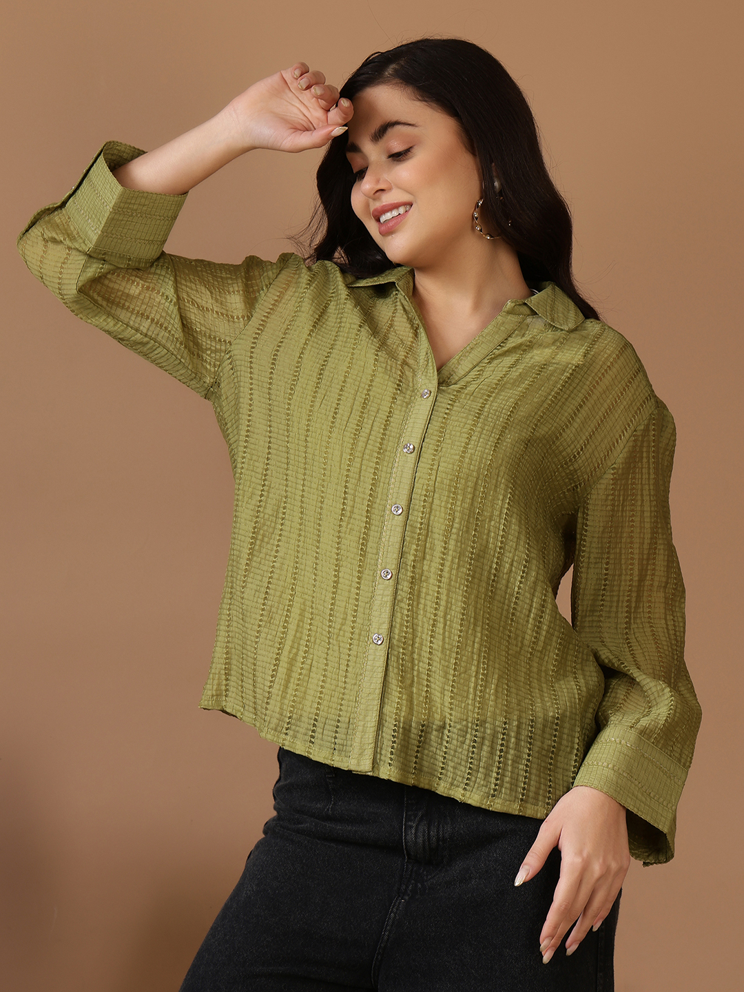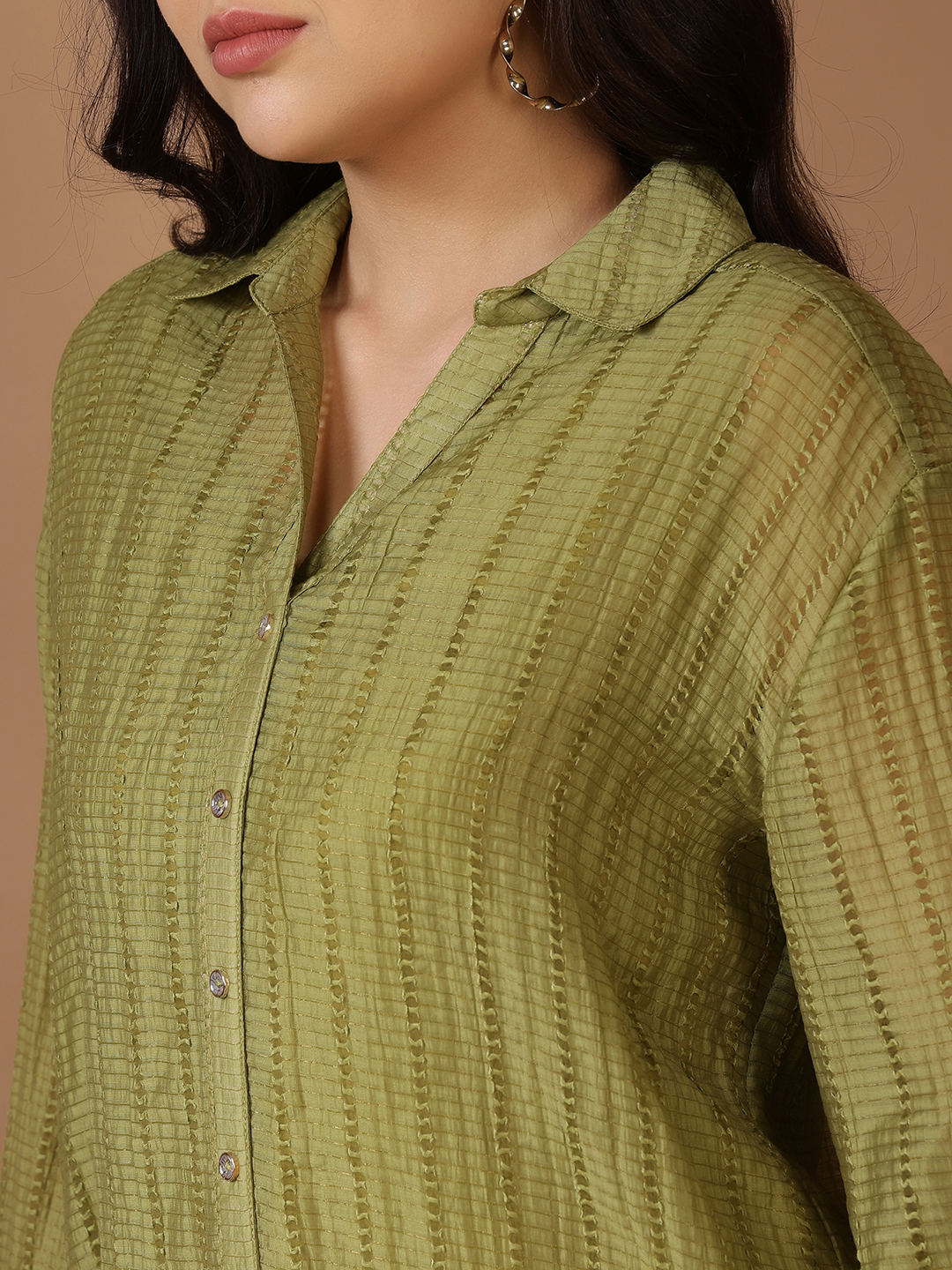 Refresh your smart-casual collection with this olive and mustard-toned, textured shirt. Featuring a vertical geometric weave, this piece combines a classic button-down aesthetic with a high-fashion, luminous finish. Designed with a relaxed fit, it offers a breezy feel perfect for layering or wearing as a standalone statement piece.