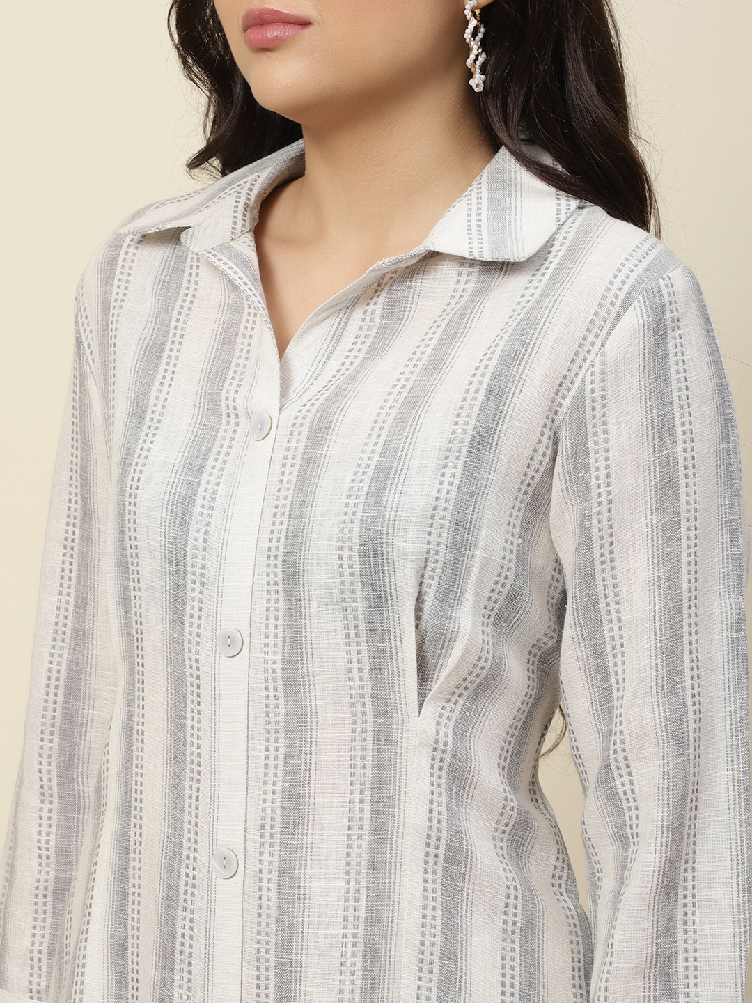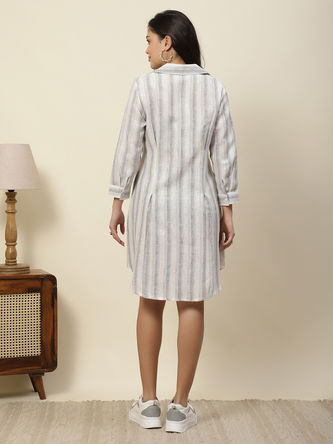 Textural Elegance Meets Modern Tailoring. A testament to refined style, our Signature Shirt Dress is reimagined in a premium 100% Pure cotton . Featuring an intricate, woven-in vertical stripe pattern, this piece offers a unique depth and luster that catches the light beautifully. Designed for the woman who values detail, it’s a versatile staple that transitions seamlessly from a high-powered gallery visit to an alfresco dinner.