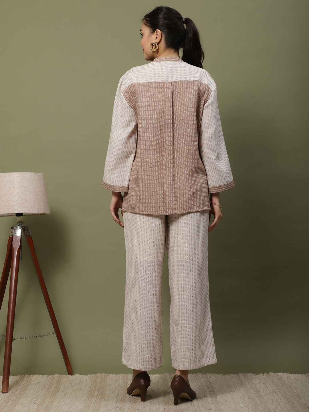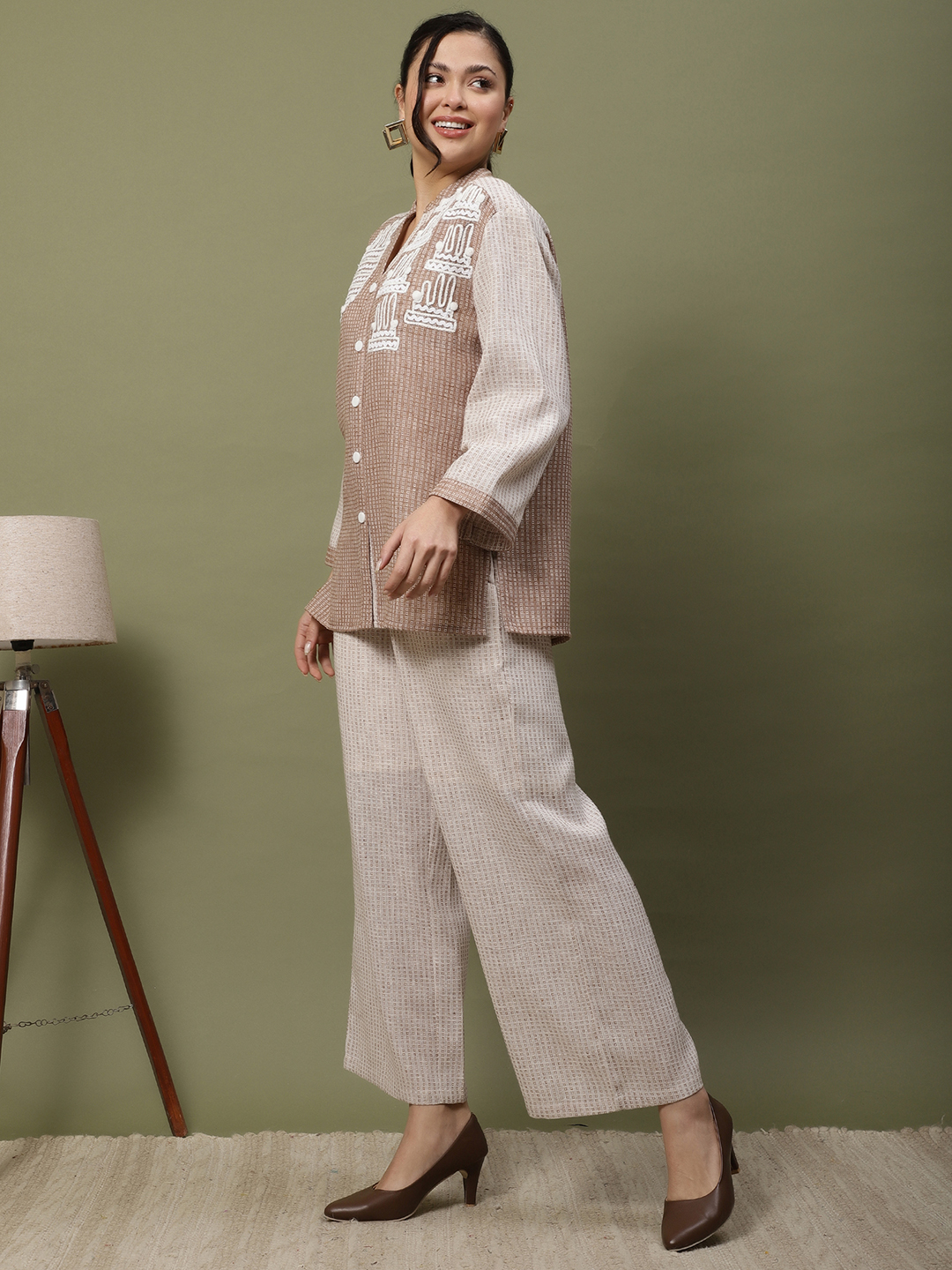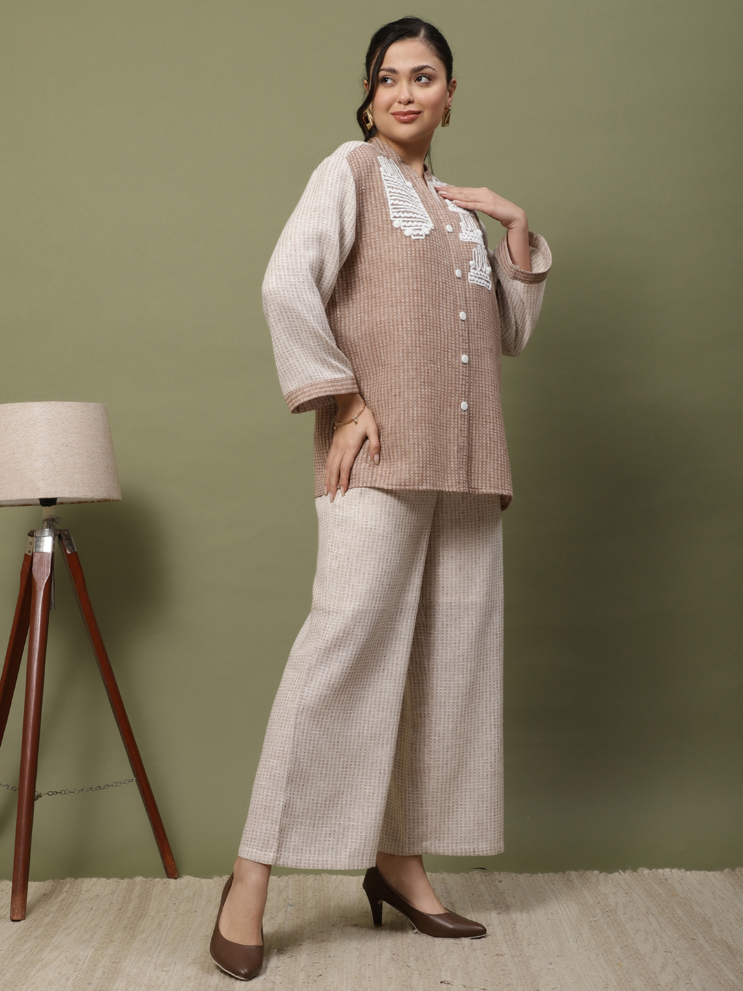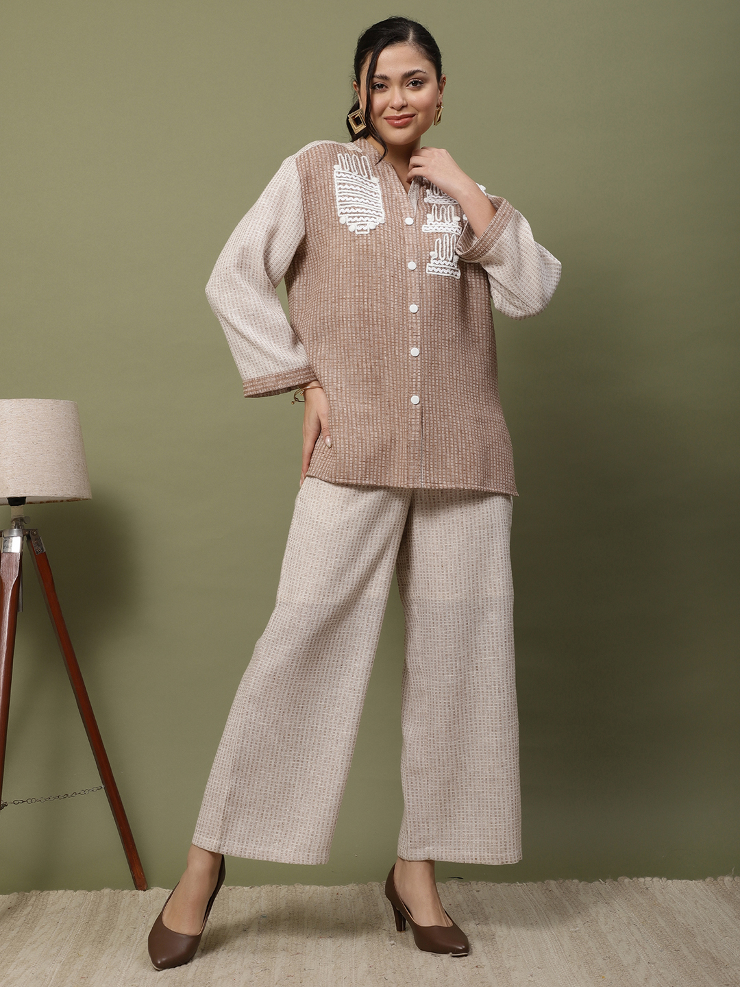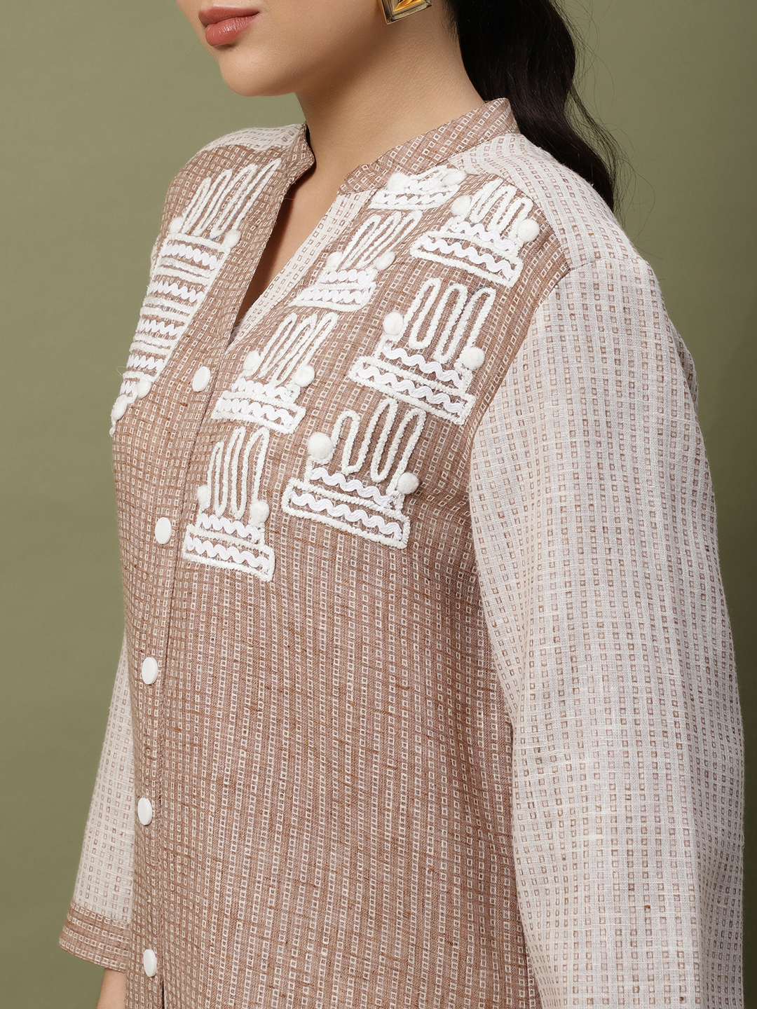 This ensemble is a beautiful celebration of texture and artisanal craftsmanship, blending the earthy appeal of jute with the softness of premium cotton. The intricate handwork elevates it from a standard coordinate set to a wearable piece of art. The Artisan Thread Cotton-Jute Set A Symphony of Texture and Hand-Crafted Detail. Step into understated luxury with our meticulously designed two-piece set. Crafted from a premium cotton-jute blend, this outfit offers a rich, tactile experience while remaining breathable and light. The standout feature is the intricate white thread handwork and delicate pom-pom accents adorning the bodice, showcasing traditional artistry with a modern, geometric twist.
