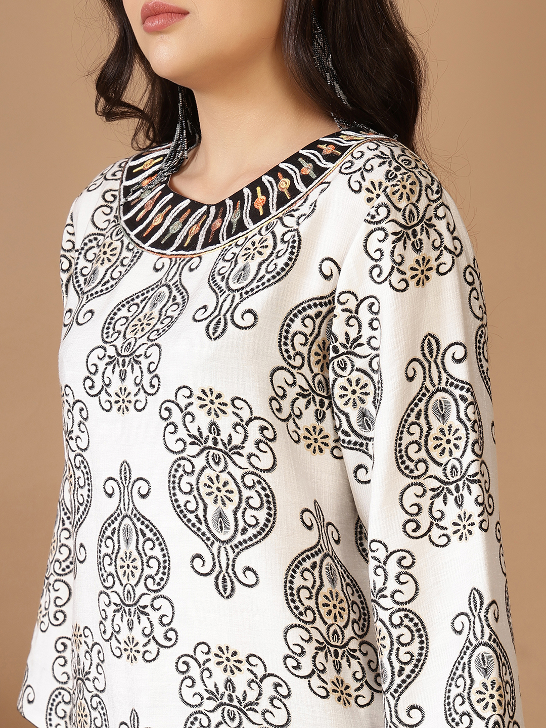 • Intricate Handwork: Features elaborate black scroll embroidery across the tunic, complemented by a striking multi-colored embroidered round neckline. The detailed stitchwork adds a dimensional, artisan quality to the garment.