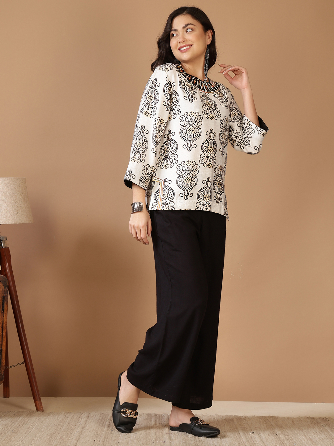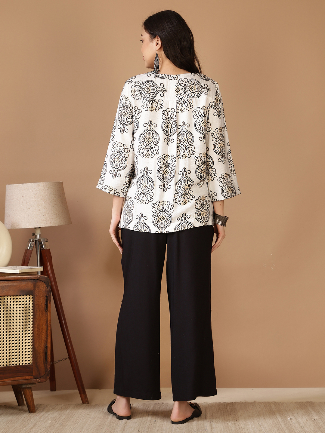 • Sleeves: Graceful 3/4 Sleeves. Designed with a clean finish and contrasting patterns to echo the overall artistic theme of the set.