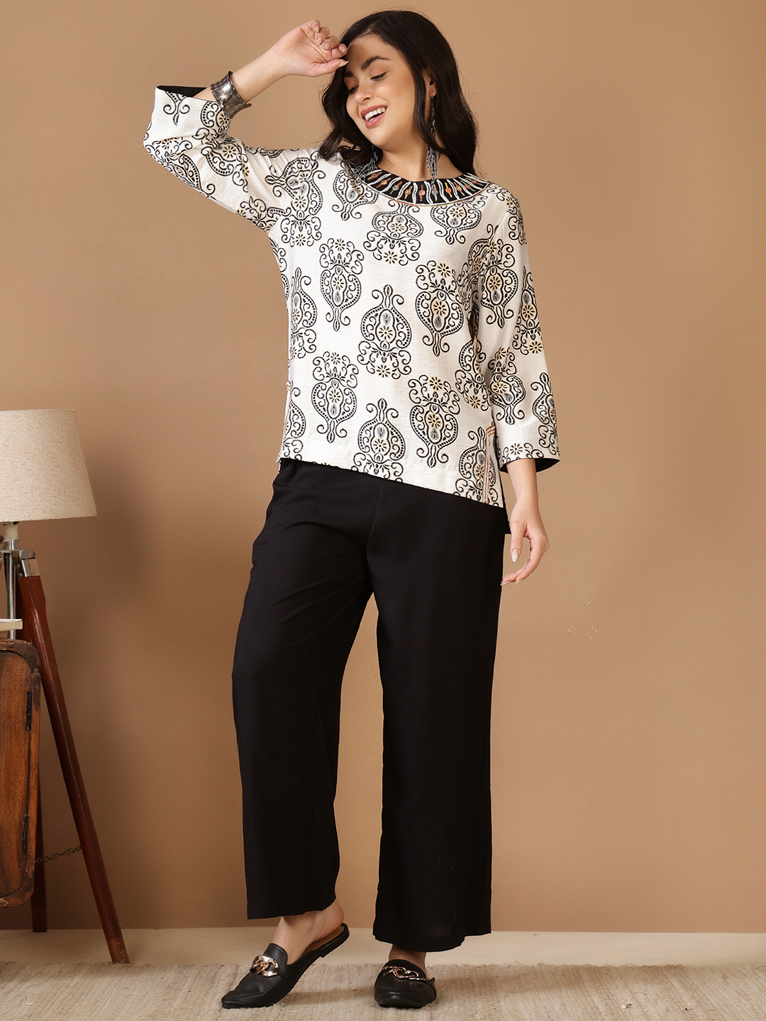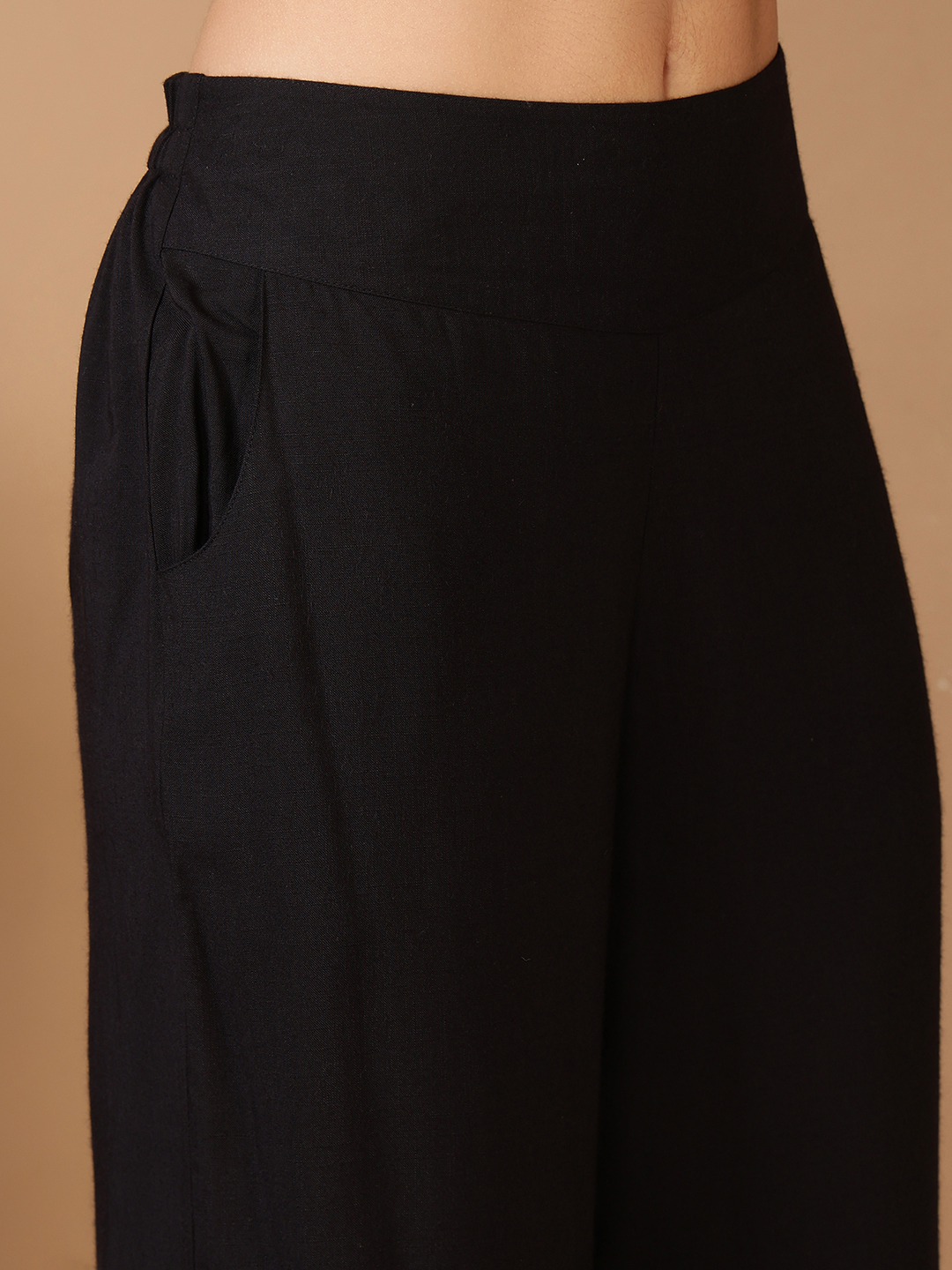 • Fit: Breezy & Relaxed Silhouette. The tunic is designed with an easy, straight-cut fit for maximum comfort. It is paired with coordinating wide-leg black trousers that create a balanced, elongated frame.