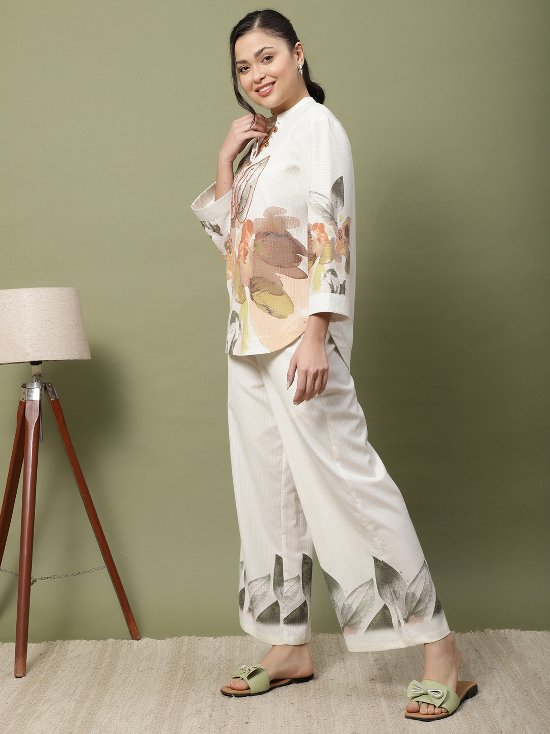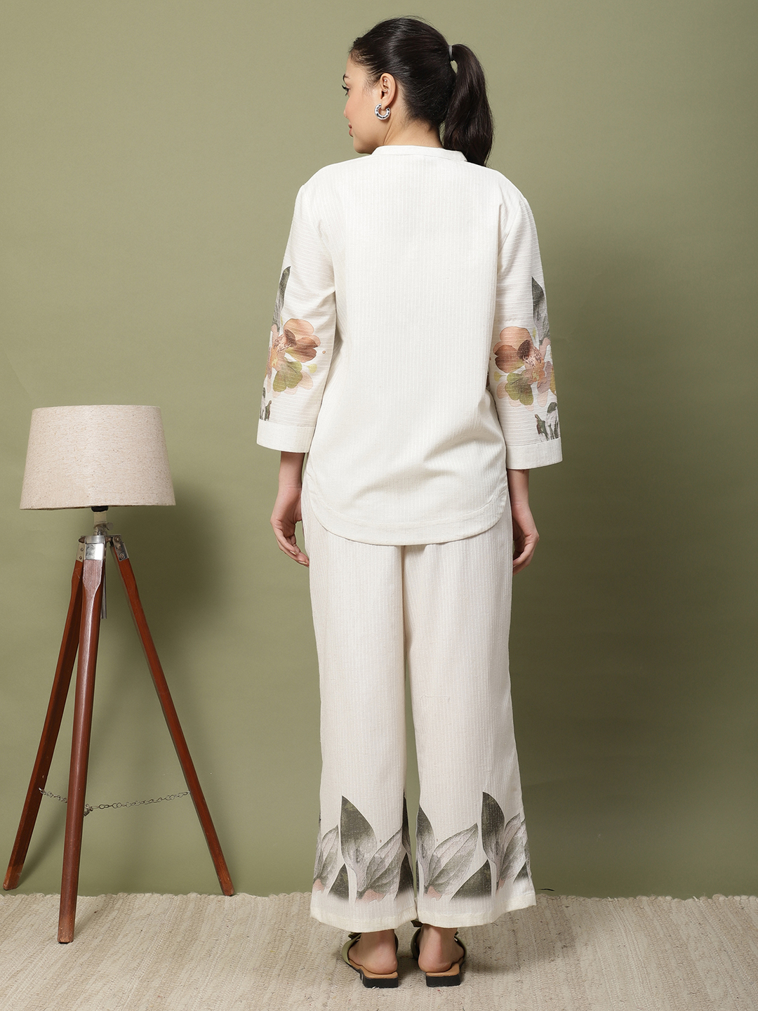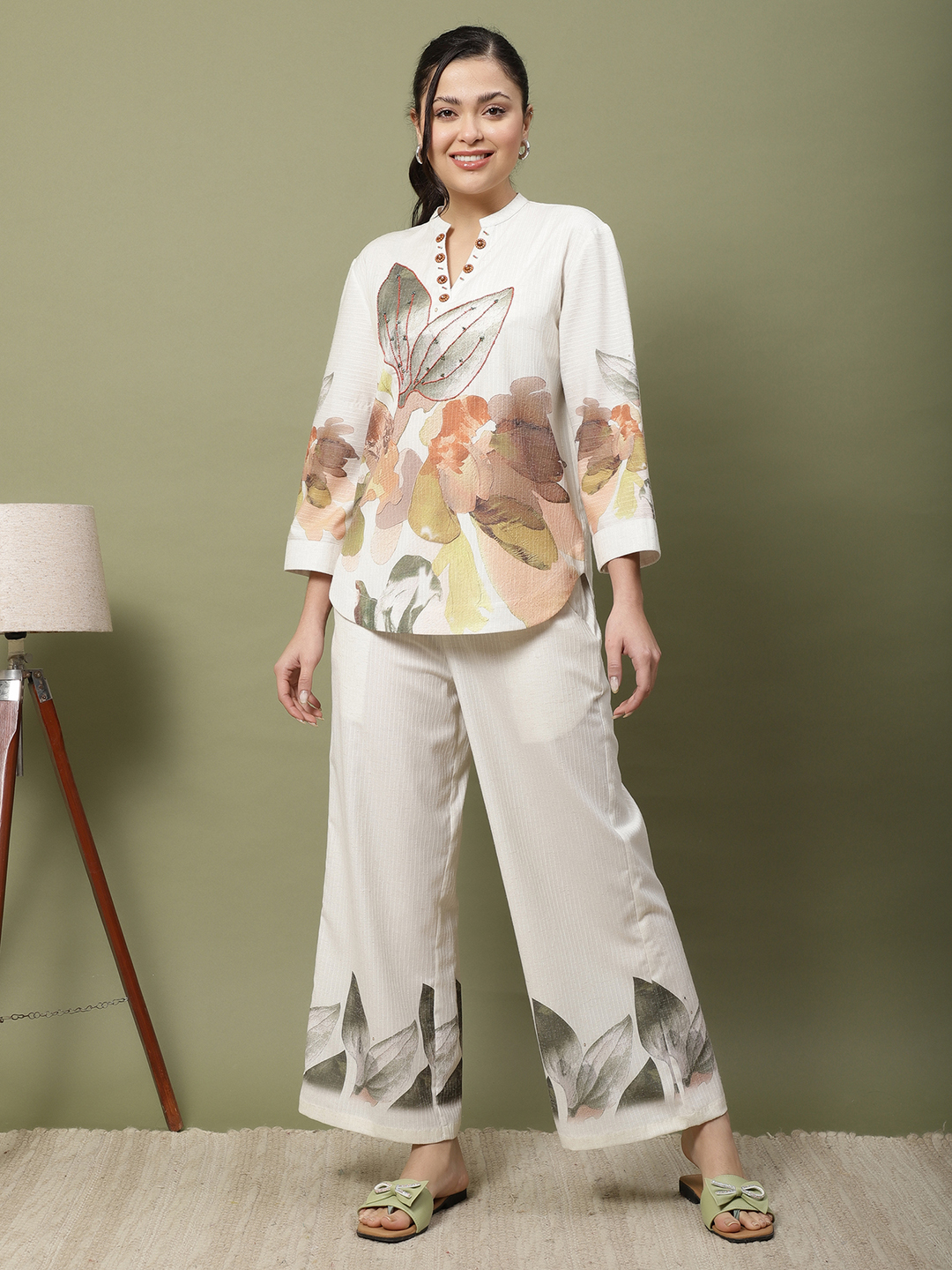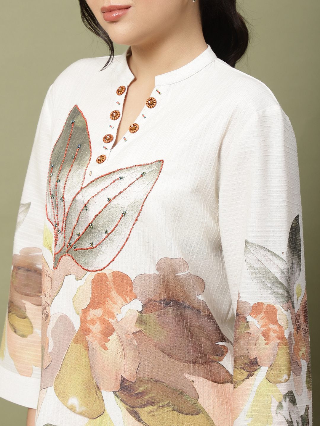 Embrace a new standard of luxury with our signature two-piece ensemble. Crafted from a premium blend of cotton, jute, and viscose, this set offers the perfect trifecta of fabric properties: the breathability of cotton, the structural character of jute, and the silky, elegant drape of viscose. The standout feature is the vibrant floral handwork, meticulously detailed with shimmering bead accents that bring the botanical motifs to life.
