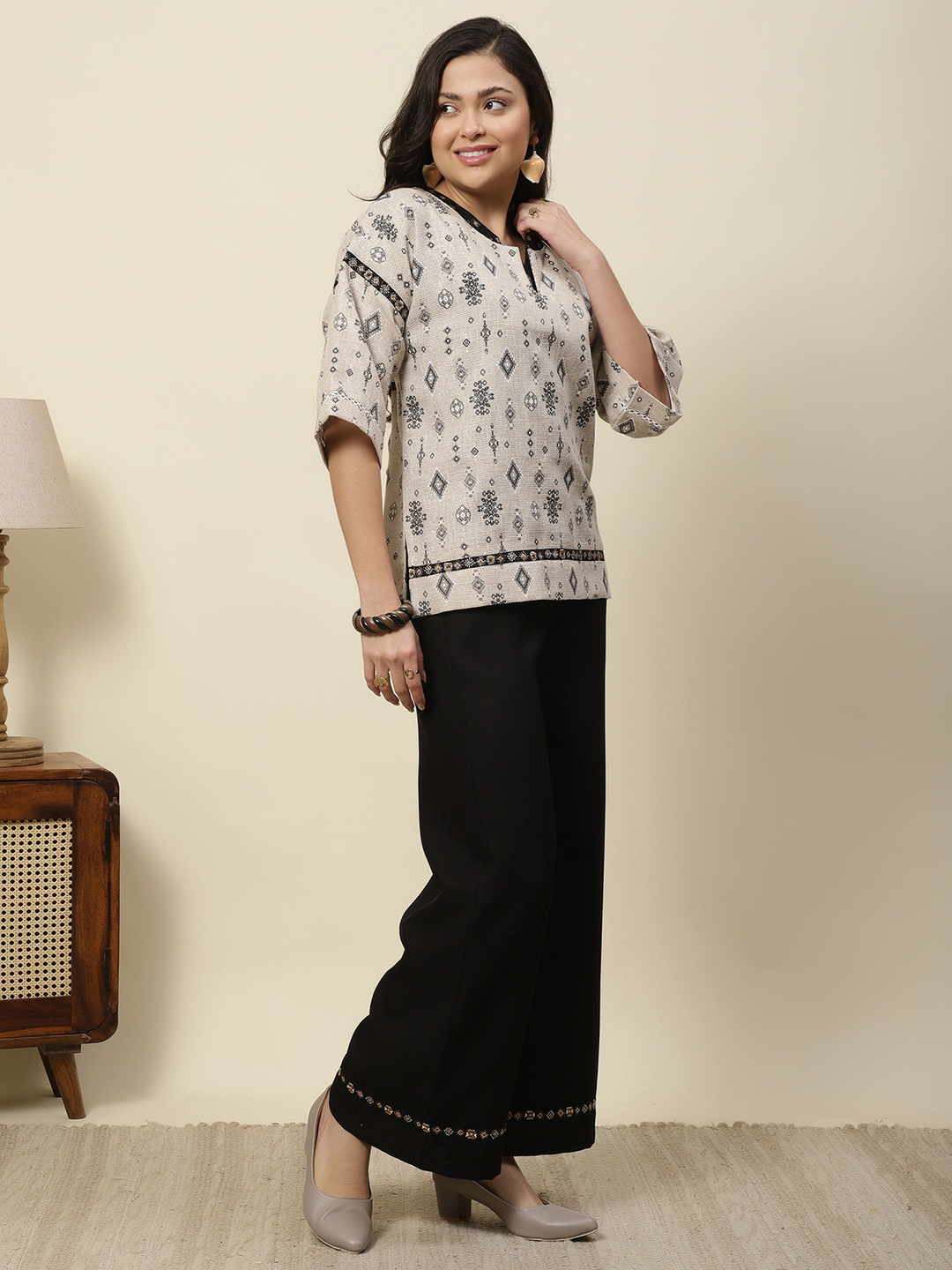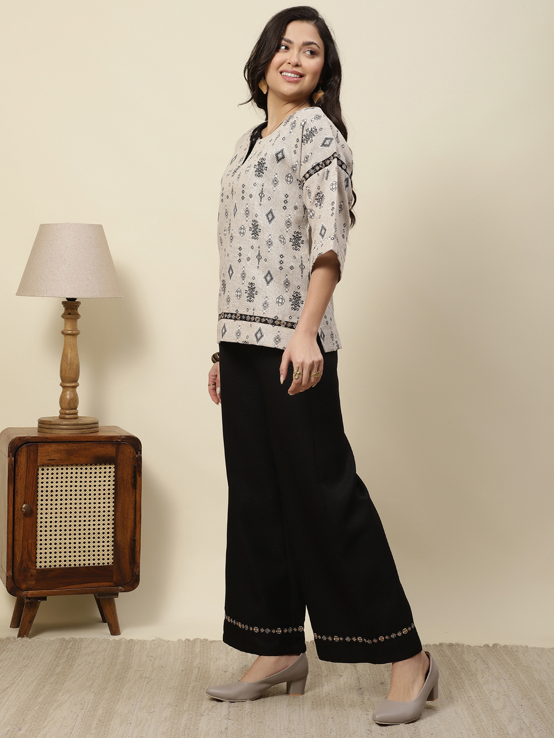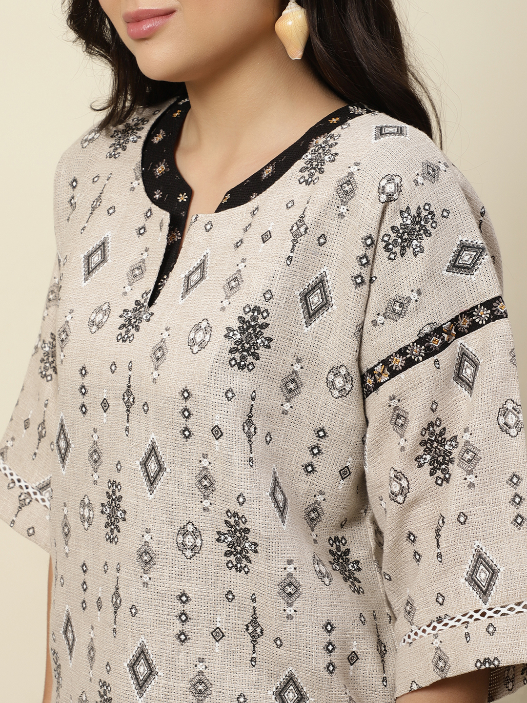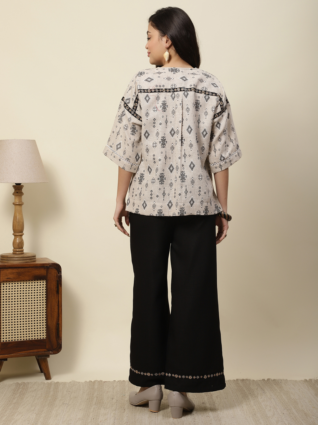 Earthy Texture. Exquisite Hand-Crafted Detail. Step into effortless elegance with our signature two-piece coordinate set. Crafted from a premium cotton-jute blend, this outfit provides a structured yet airy feel, perfect for all-day comfort. The centerpiece of this design is the intricate hand-embroidered detailing, featuring delicate botanical motifs and geometric threadwork that add a rich, tactile dimension to the garment.