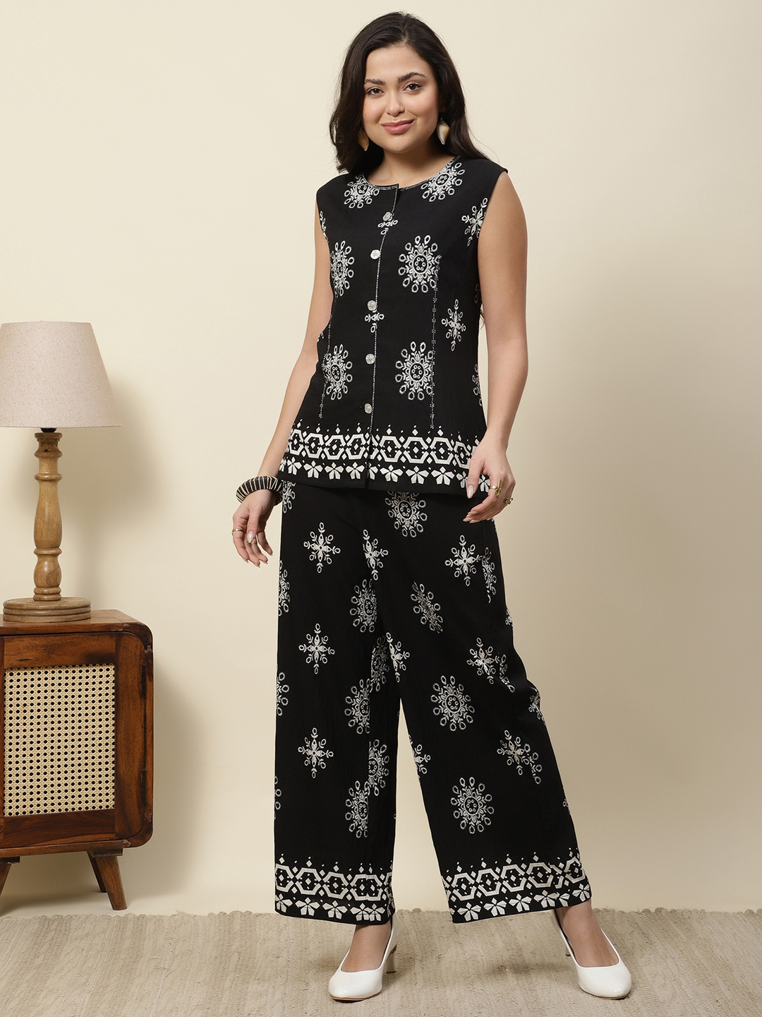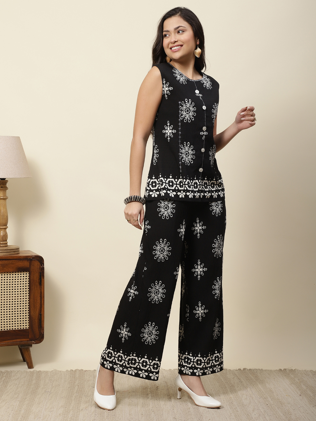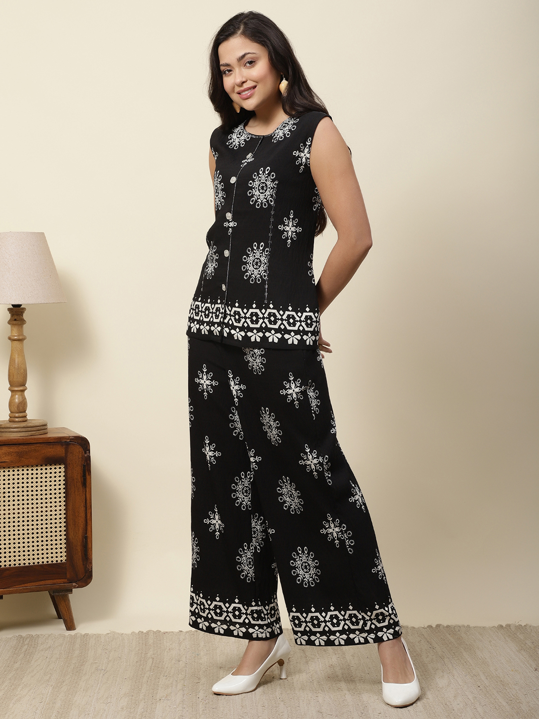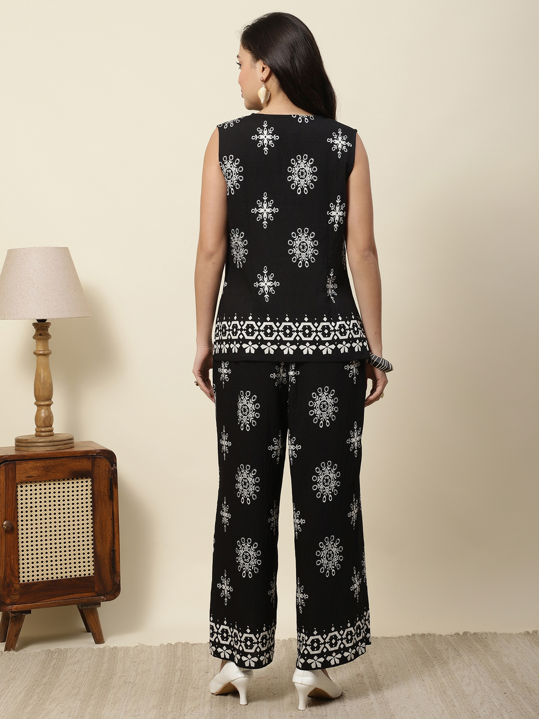 Structured Grace. Hand-Crafted Precision. Redefine modern power-dressing with our signature two-piece ensemble. Crafted from a premium nylon-rayon blend, this set provides a silky, high-end drape with the durability needed to maintain a crisp, professional look all day. The standout feature is the intricate geometric hand-embroidery, meticulously placed to create a rhythmic, visual narrative across the sleeveless bodice and wide-leg trousers.