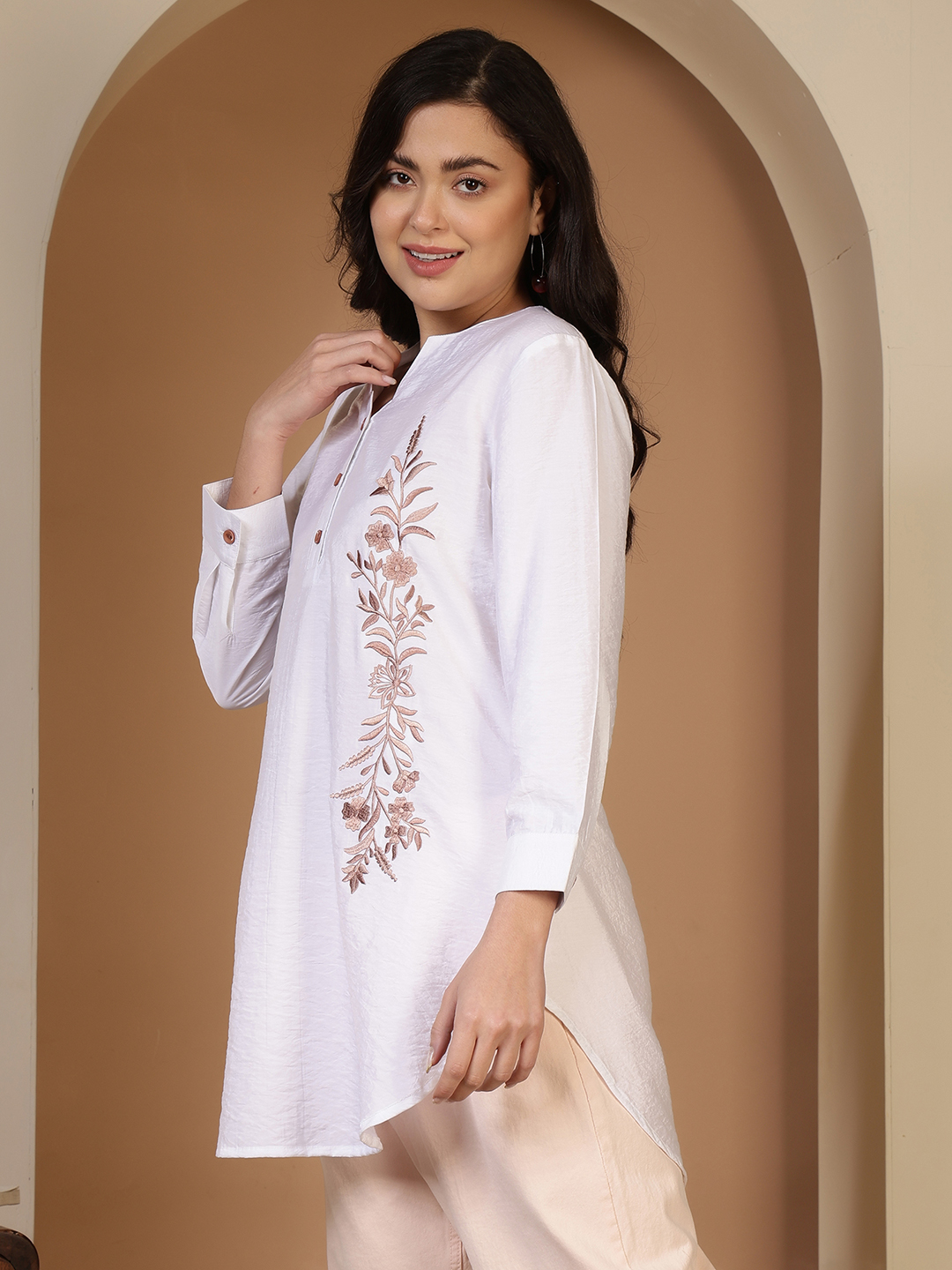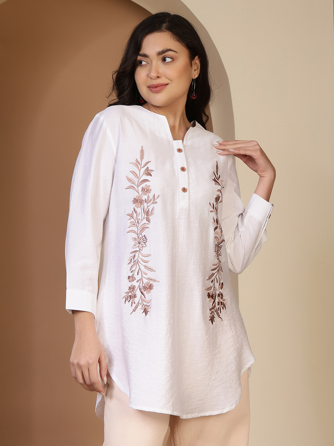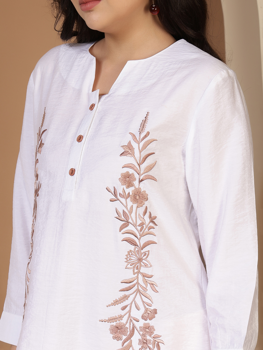 • Exquisite Hand Embroidery: The centerpiece of this tunic is the twin vertical panels of intricate hand-embroidery. Using a warm, rosy-taupe thread, the artisan has rendered delicate floral vines and botanical motifs that elongate the frame and add a soft, feminine texture.
