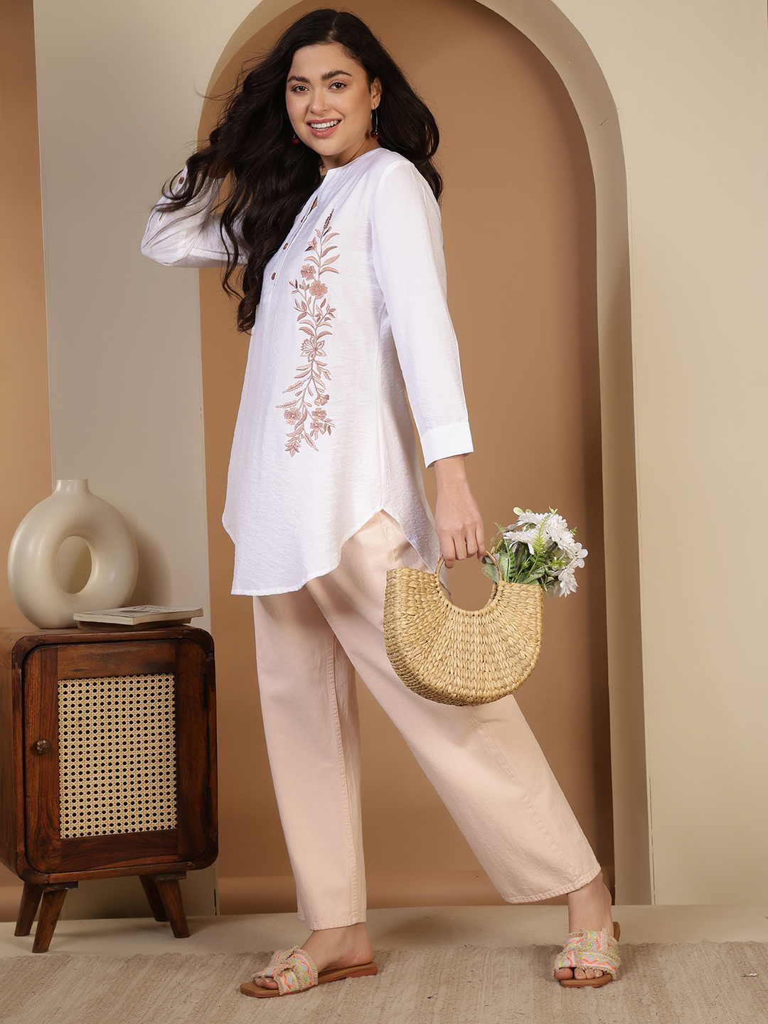 This long tunic is a masterclass in understated elegance, blending the crisp purity of white cotton with the earthy warmth of hand-done artistry. It’s a versatile piece that feels as light as a breeze while looking completely polished.