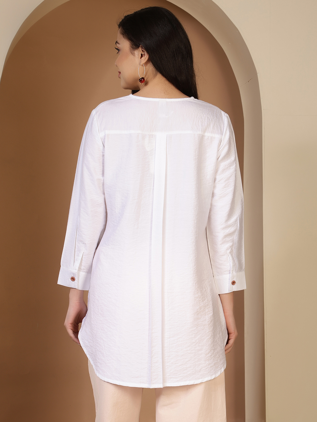 Elevate your daily rotation with this exquisite longline tunic. Crafted from a premium, breathable Nylon rayon fabric with a subtle sheen, this piece features a relaxed yet structured silhouette. The curved hemline and three-quarter sleeves offer a contemporary touch to a classic aesthetic.