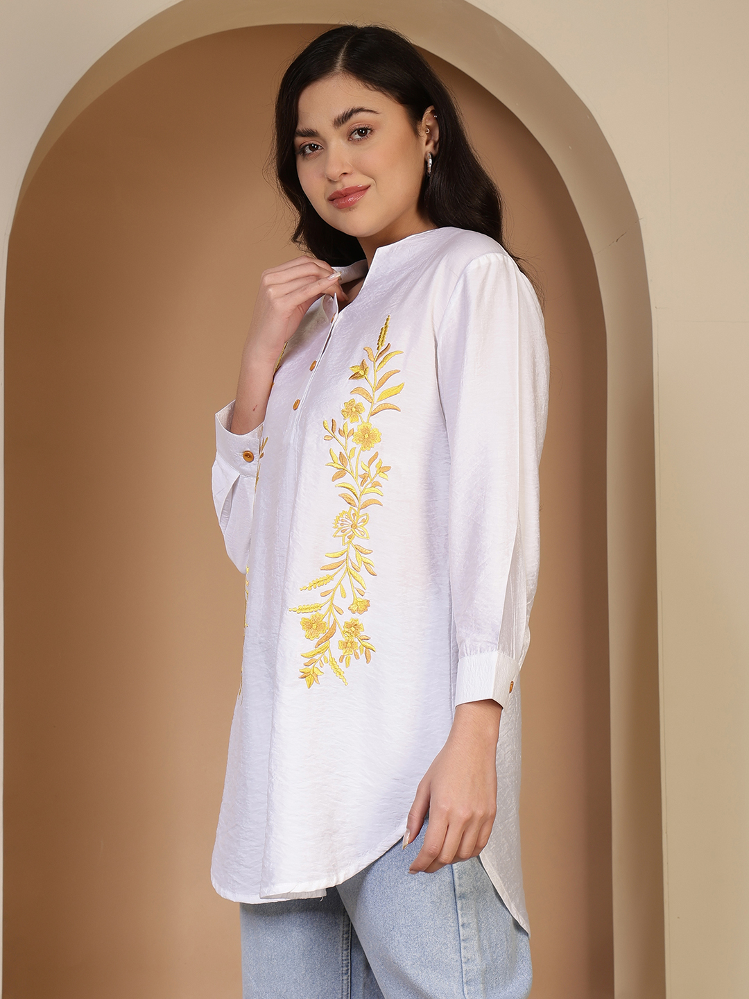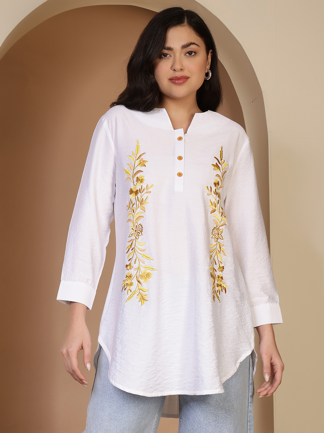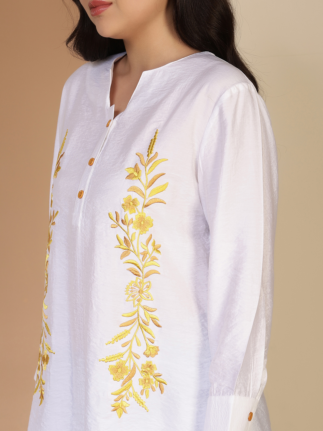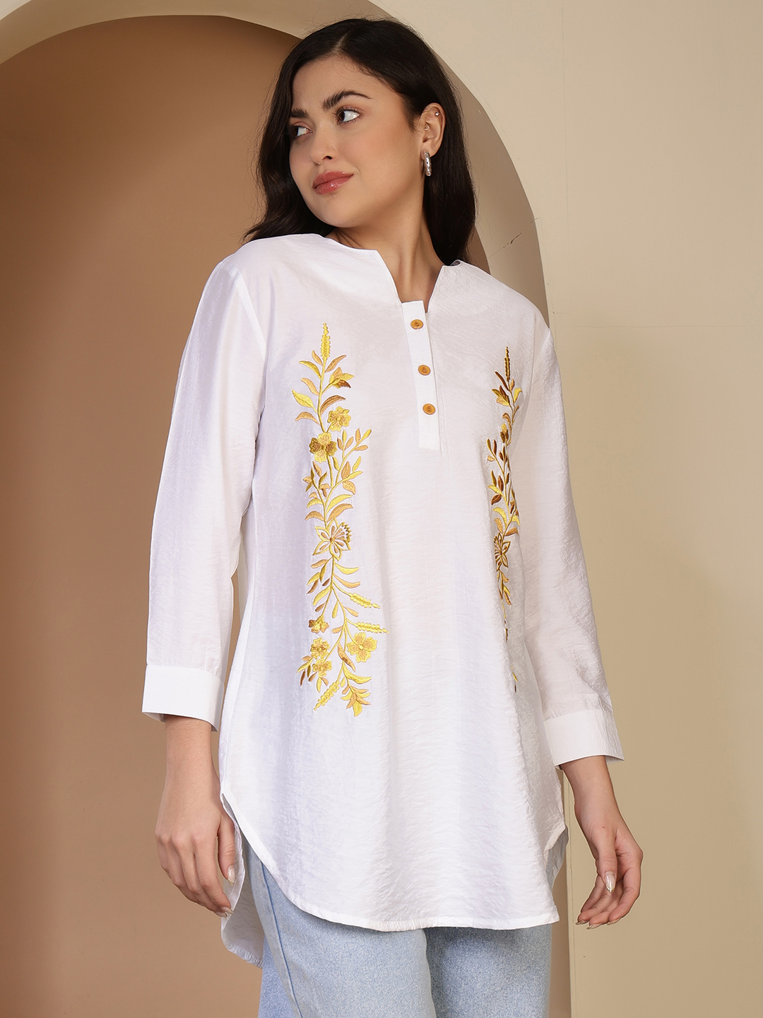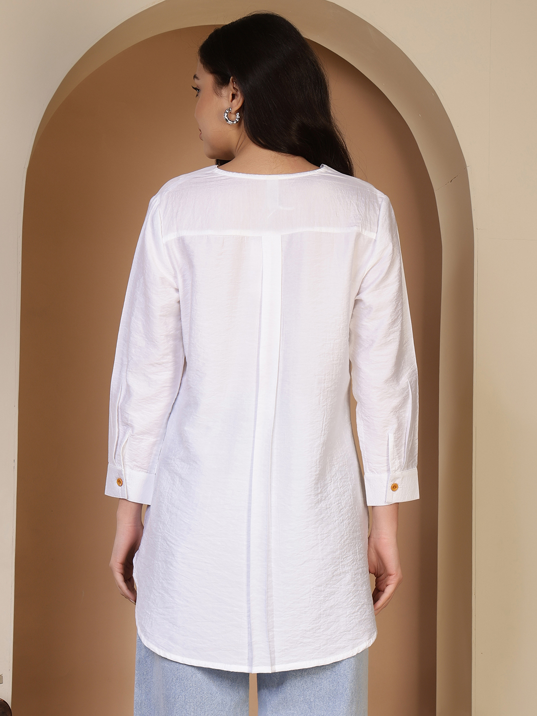 This long tunic is a masterclass in understated elegance, blending the crisp purity of white cotton with the earthy warmth of hand-done artistry. It’s a versatile piece that feels as light as a breeze while looking completely polished.