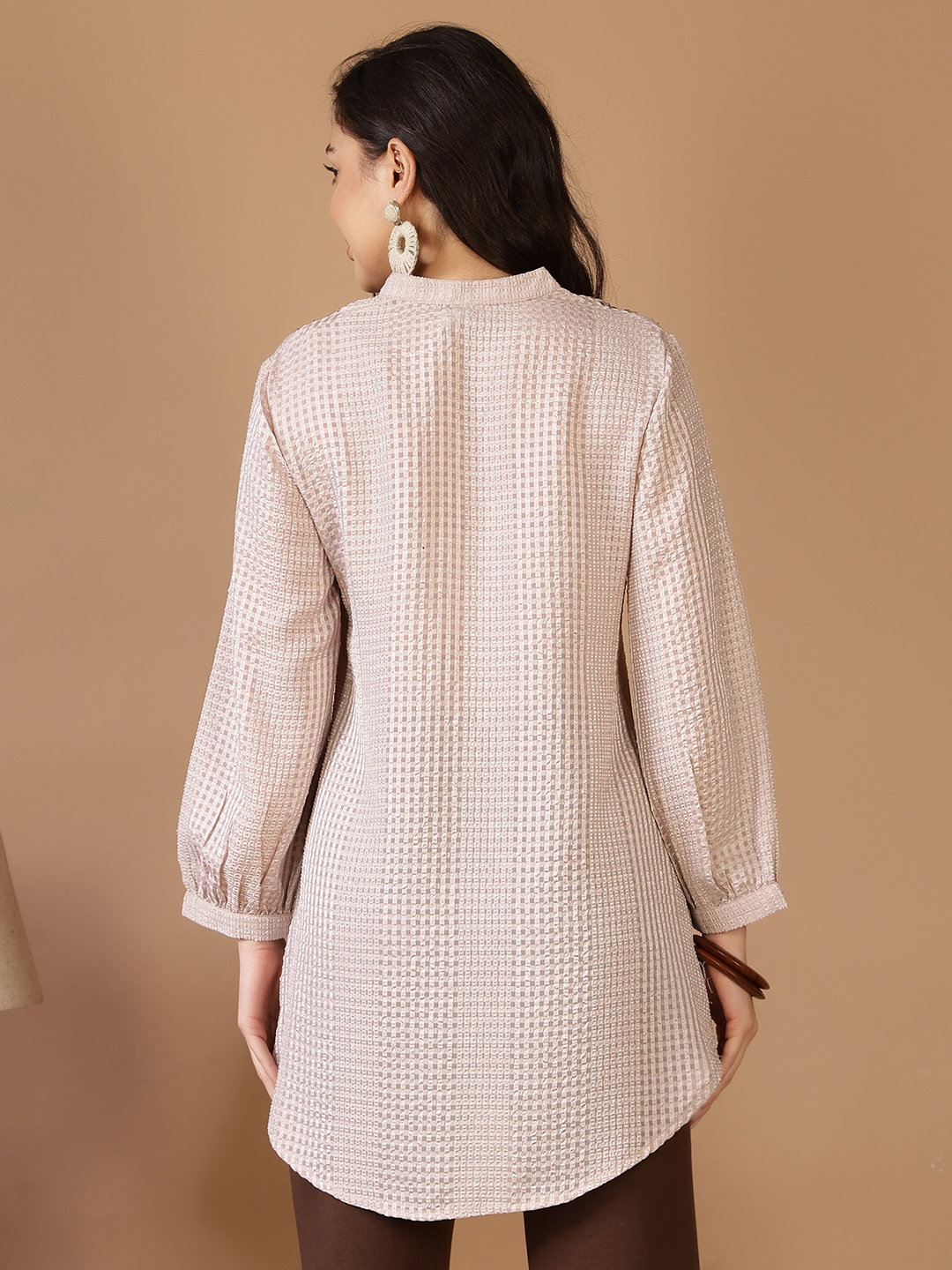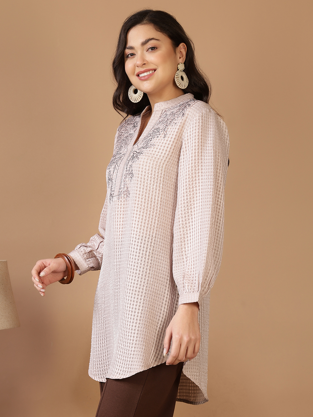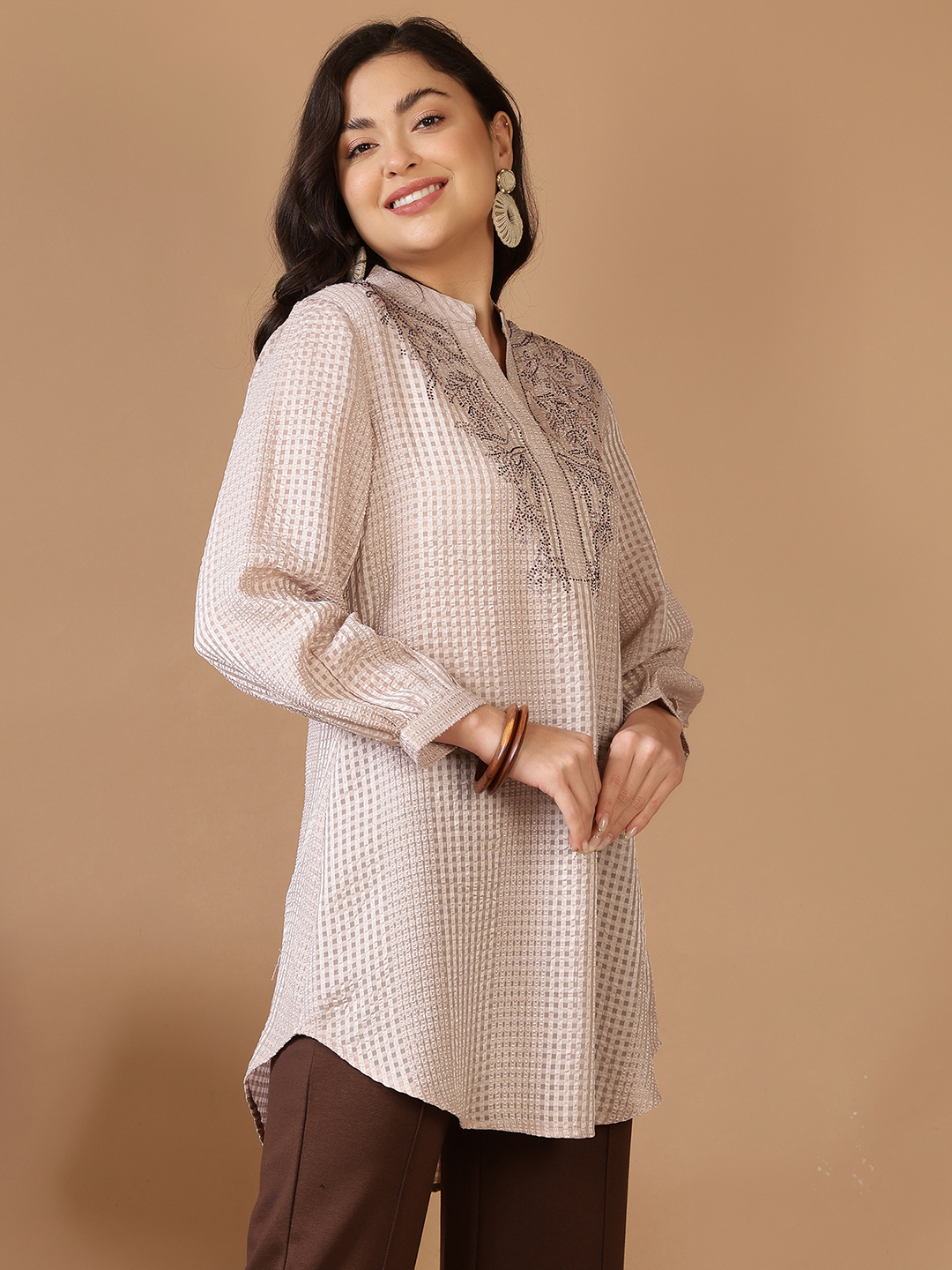 This sophisticated long tunic offers a shimmering blend of texture and sparkle, making it an ideal choice for elevated daytime events or evening gatherings.