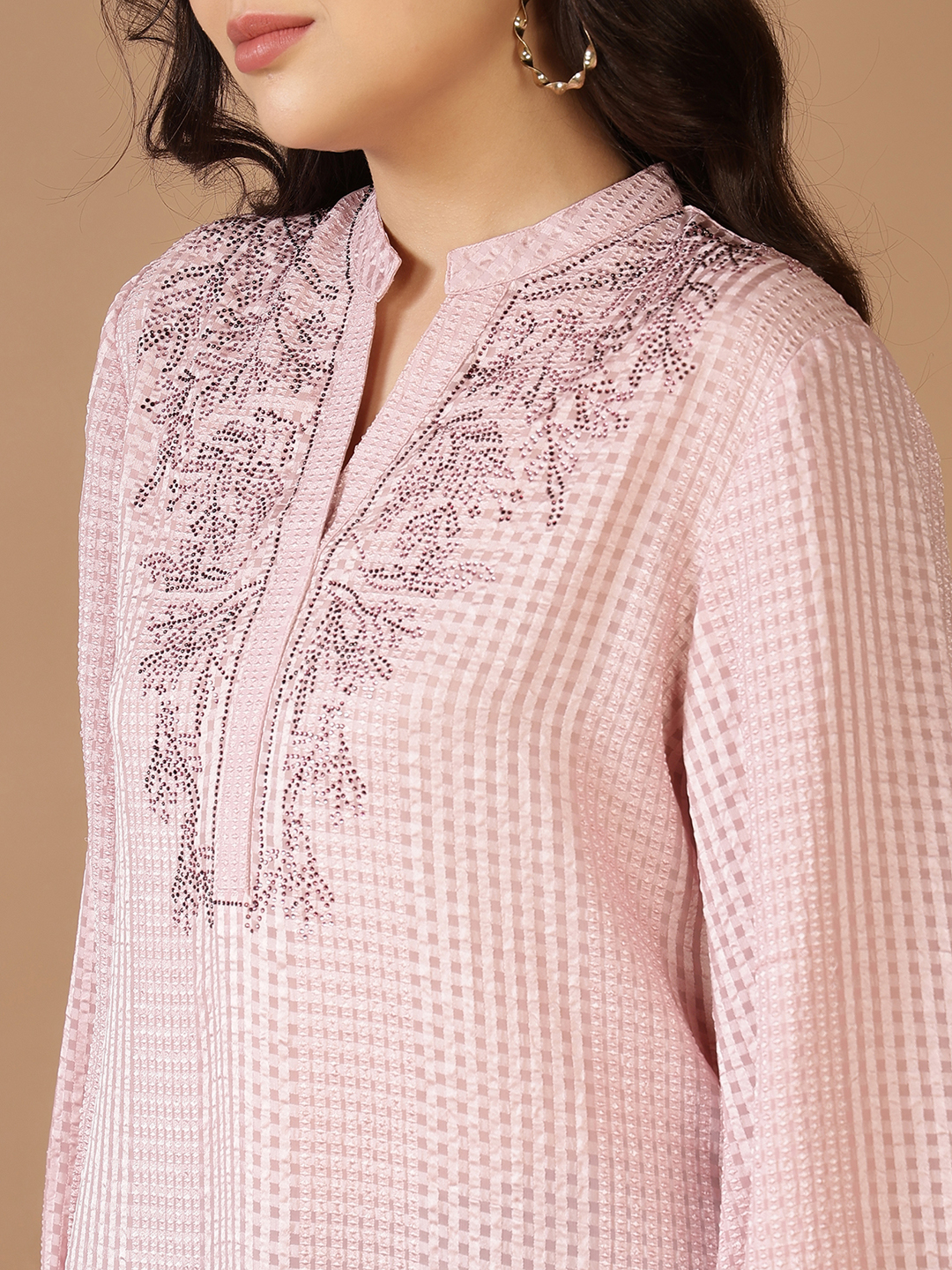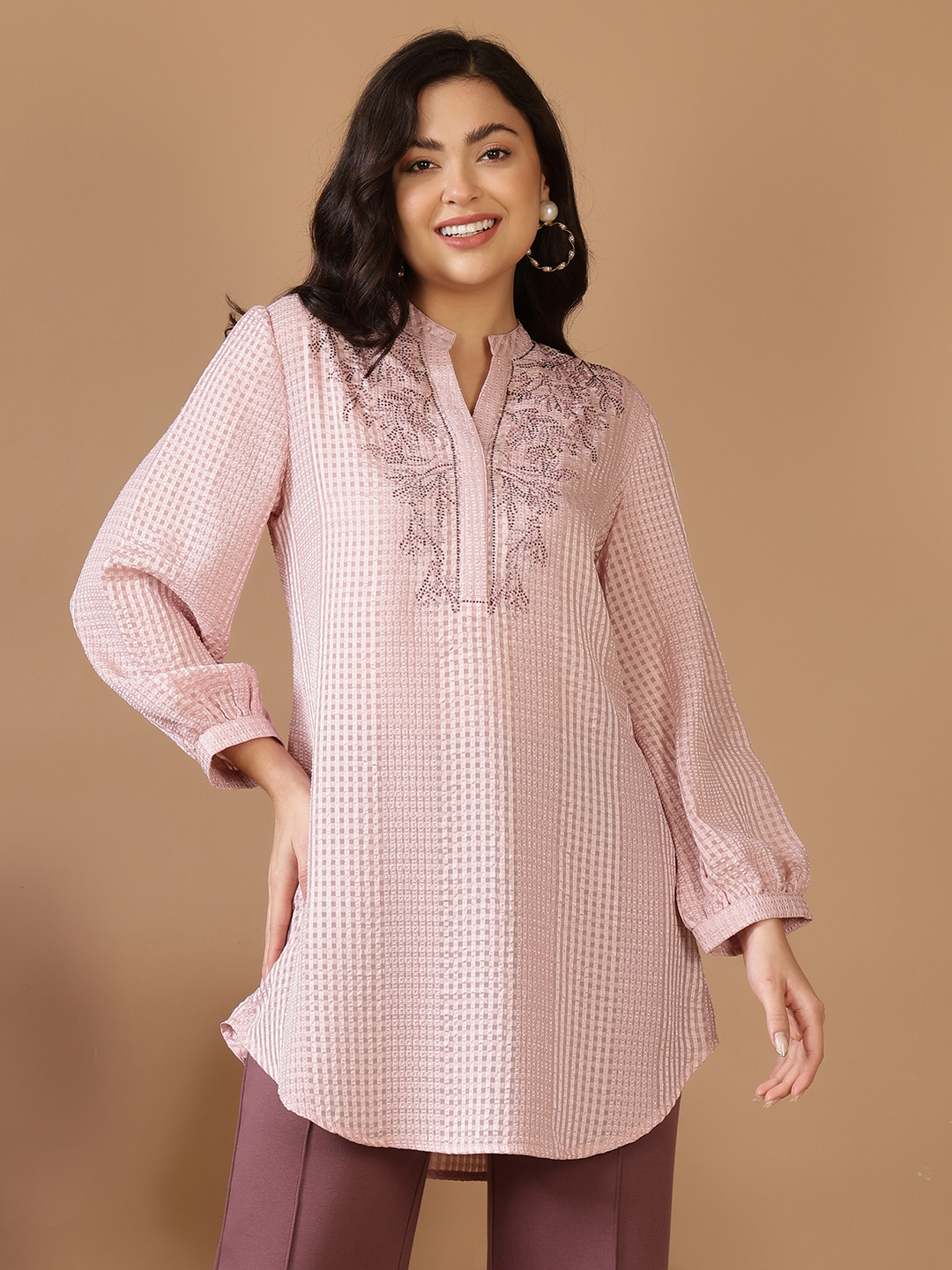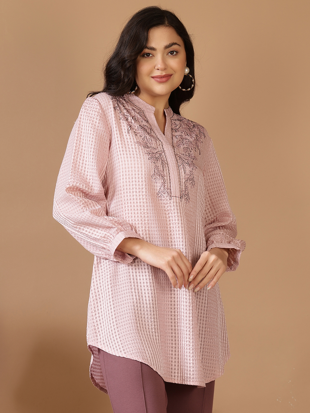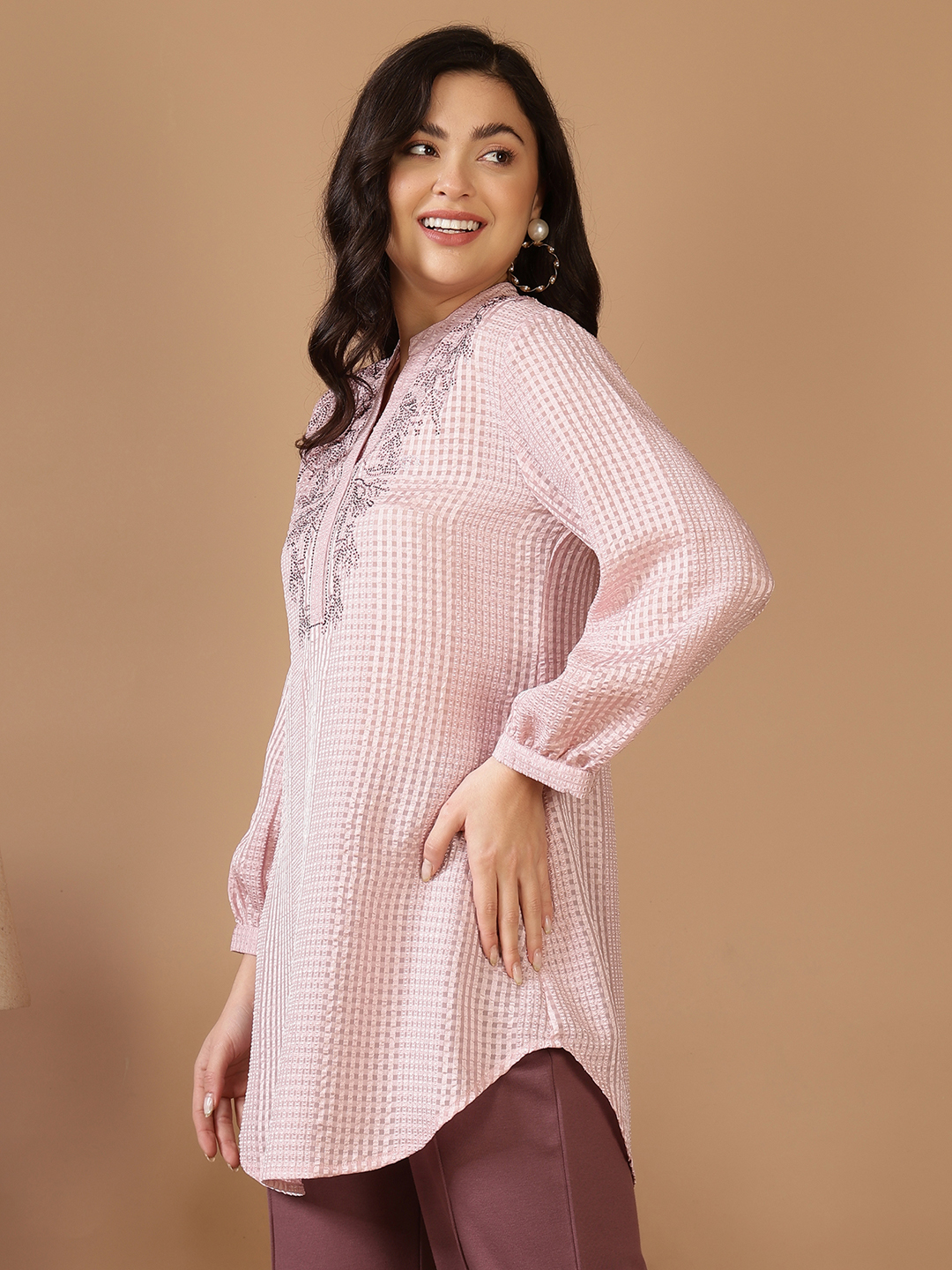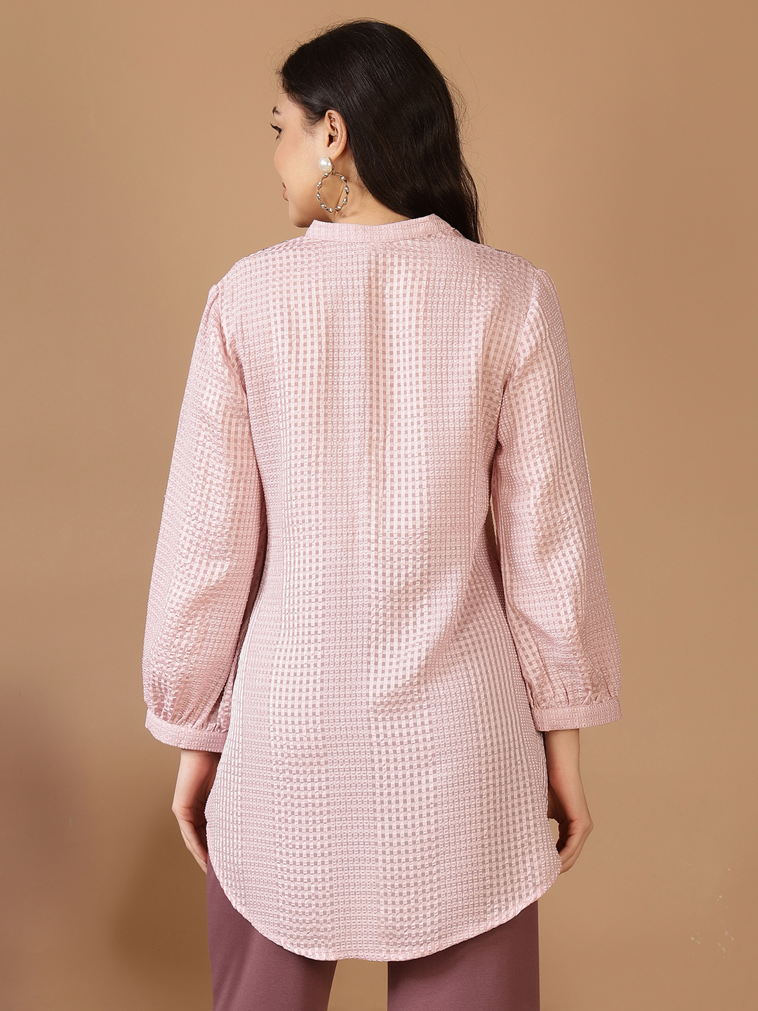 Exude effortless glamour in this stunning longline tunic, crafted from a luxurious Jacquard Poly fabric. The subtle checkered weave provides a multidimensional texture that catches the light beautifully, while the neutral champagne hue offers a timeless, versatile appeal.