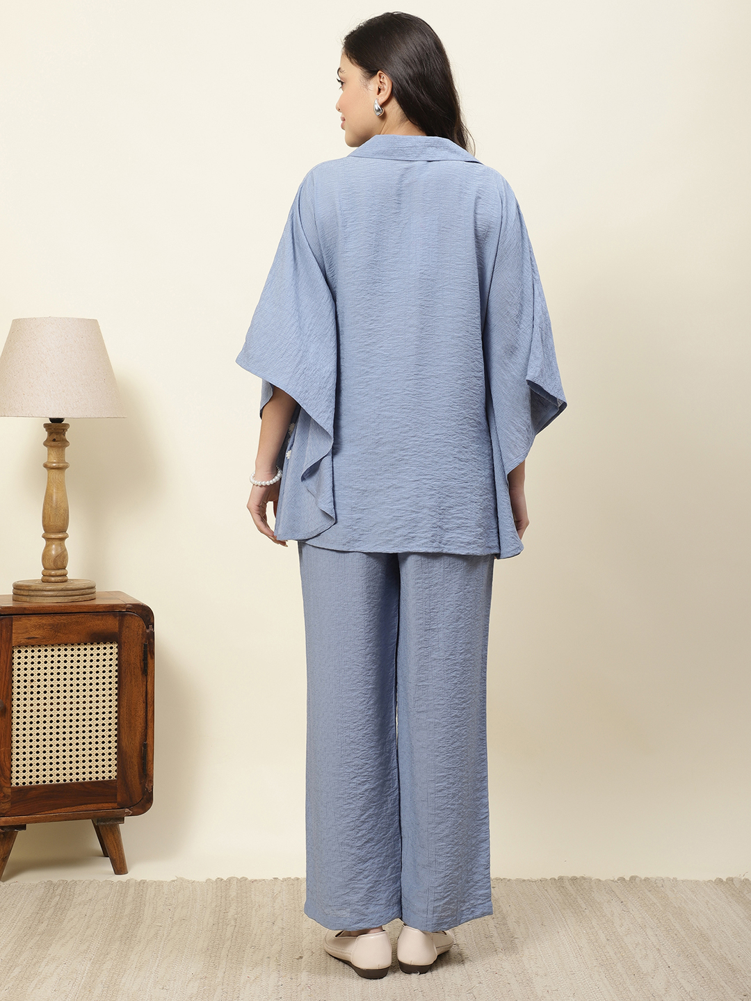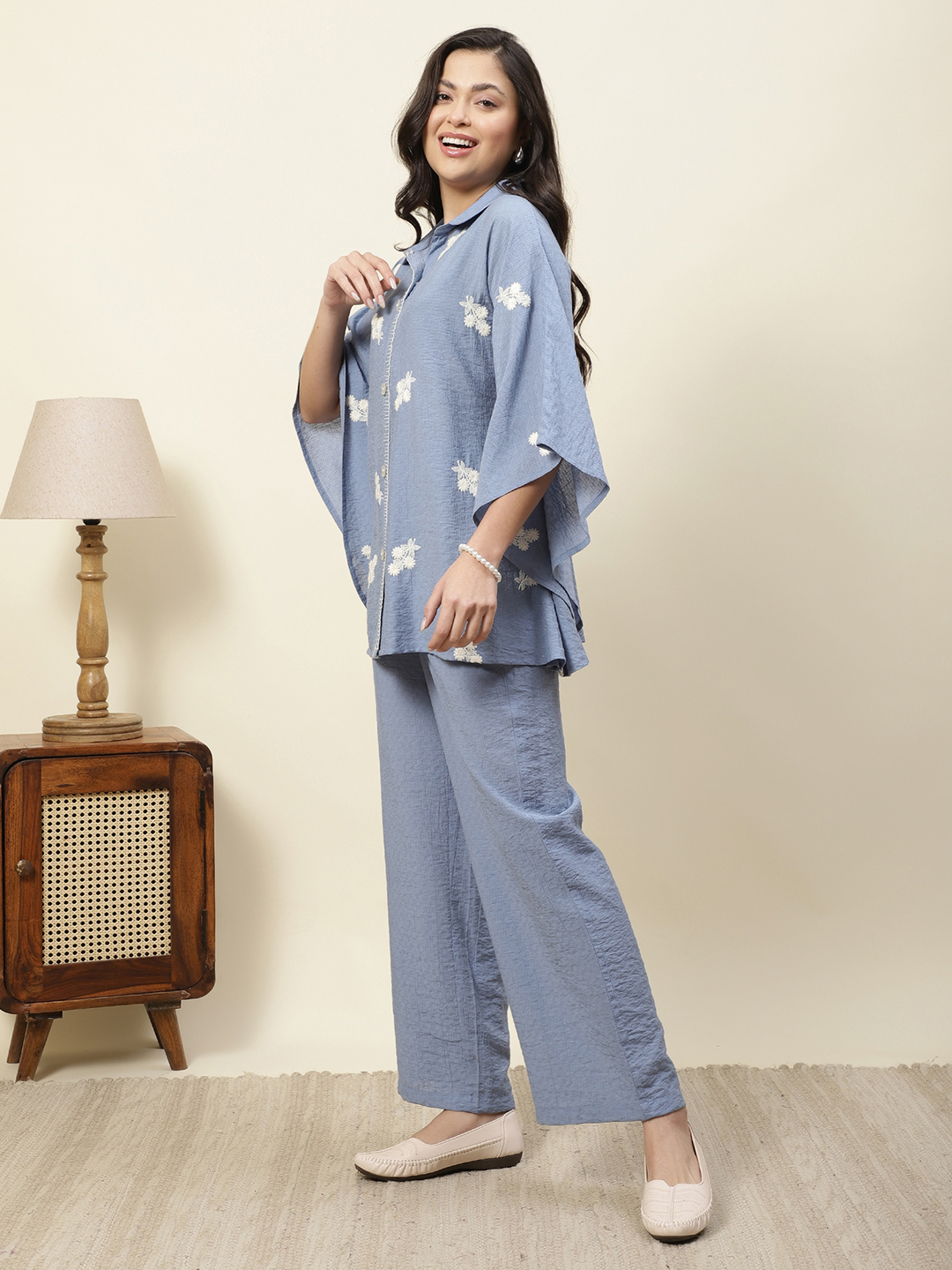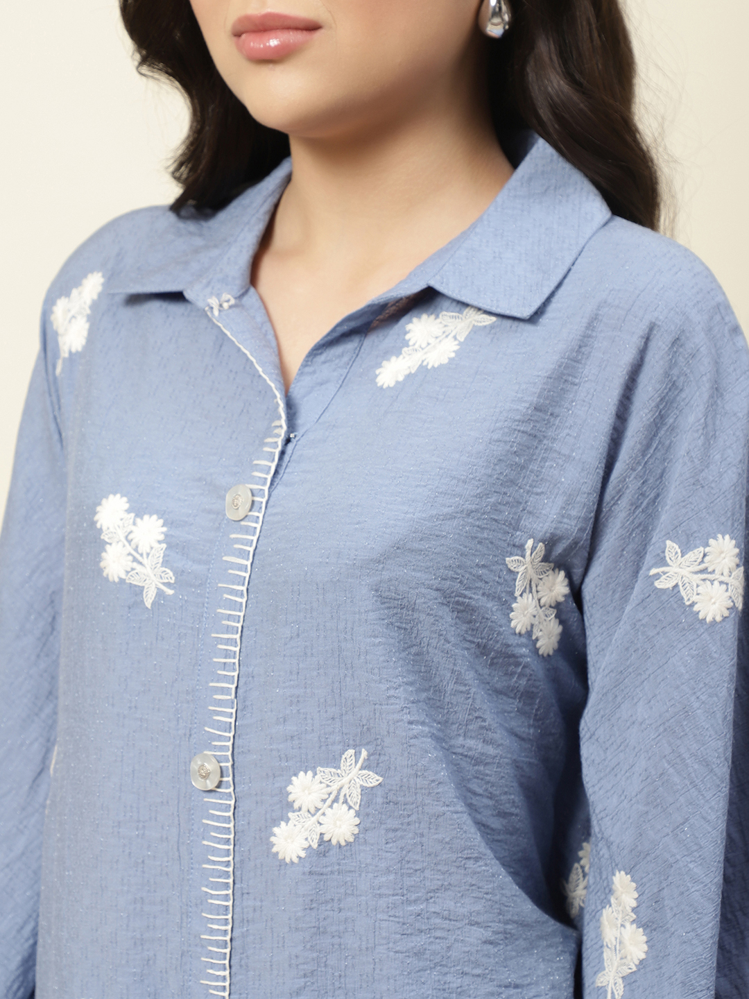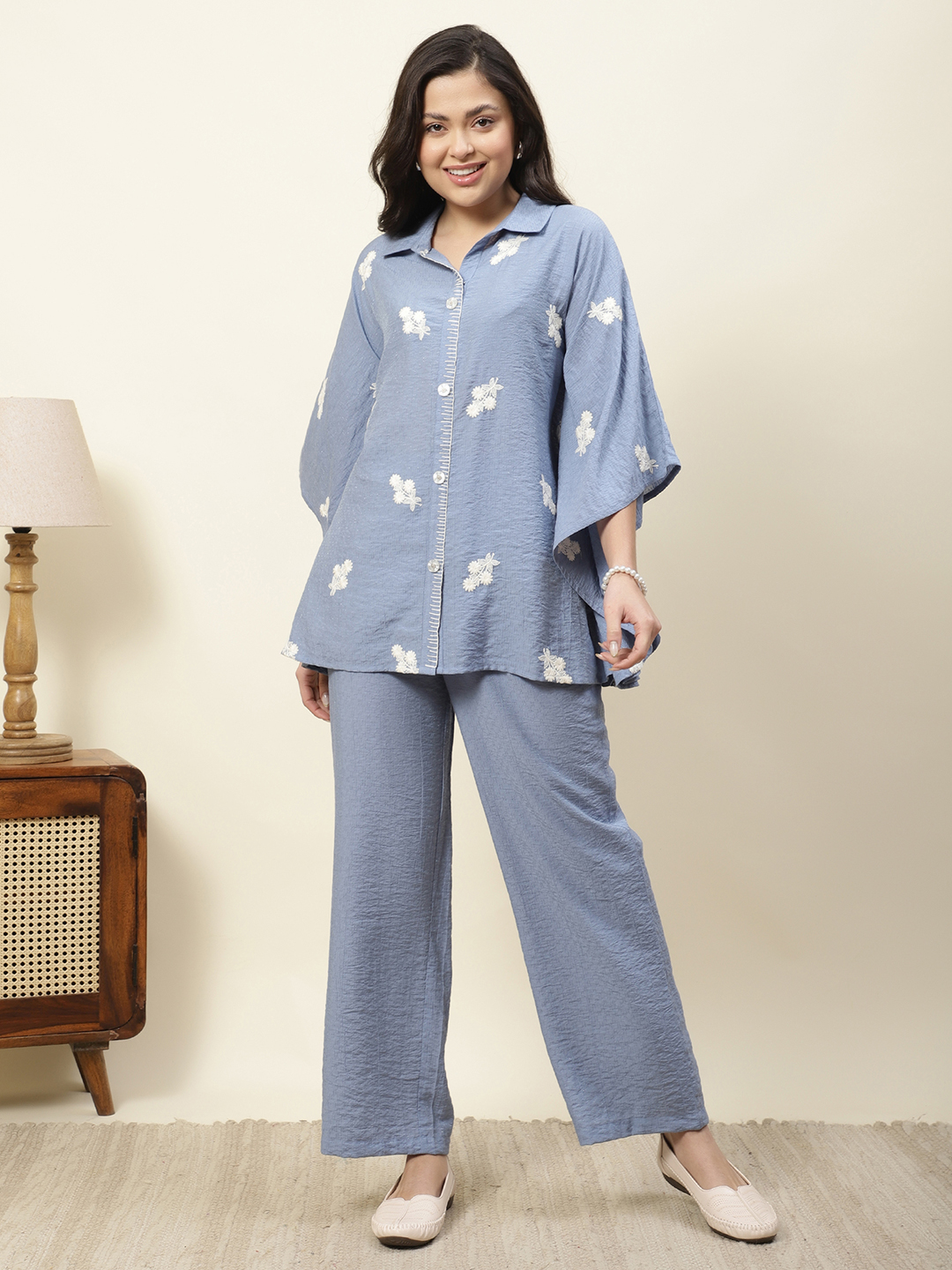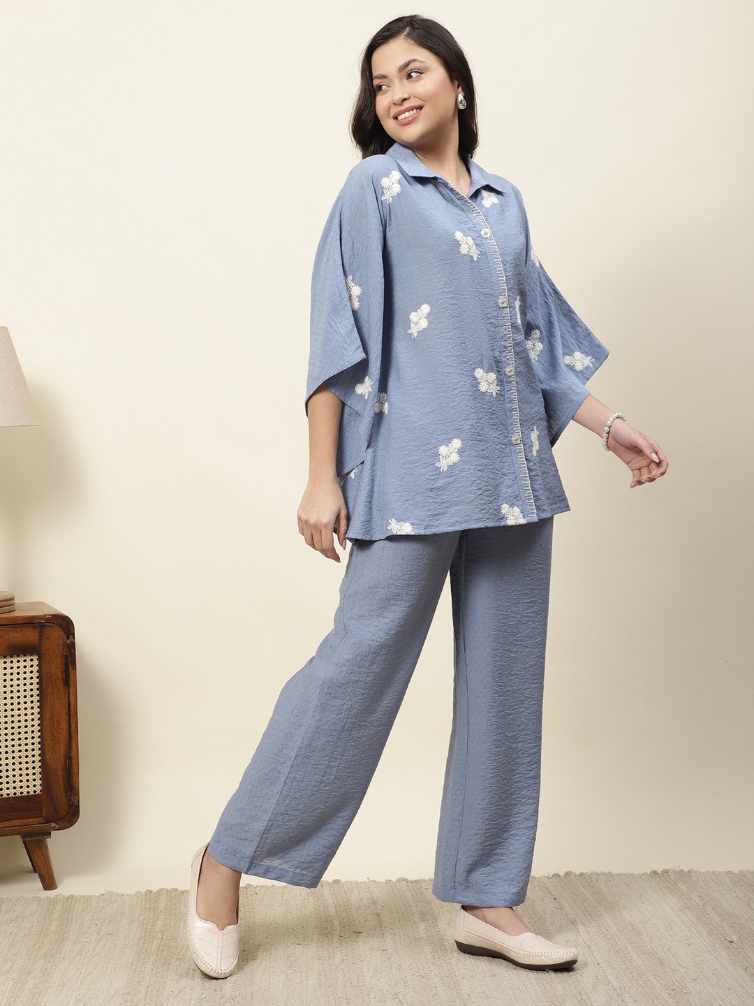 Relaxed elegance meets artisanal detail in our Azure Floral Co-ord Set. Crafted from premium Embroidered Poly Viscose, this set features a unique textured fabric that offers a beautiful drape and a subtle, sophisticated sheen. The button-down top is designed with an oversized, kaftan-inspired silhouette, adorned with delicate white floral sprigs embroidered throughout the fabric.