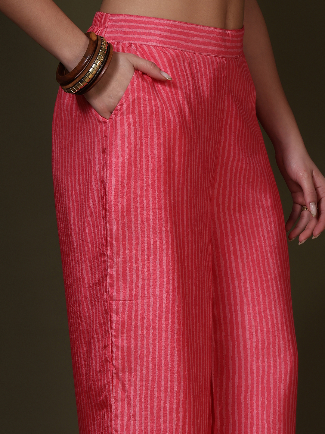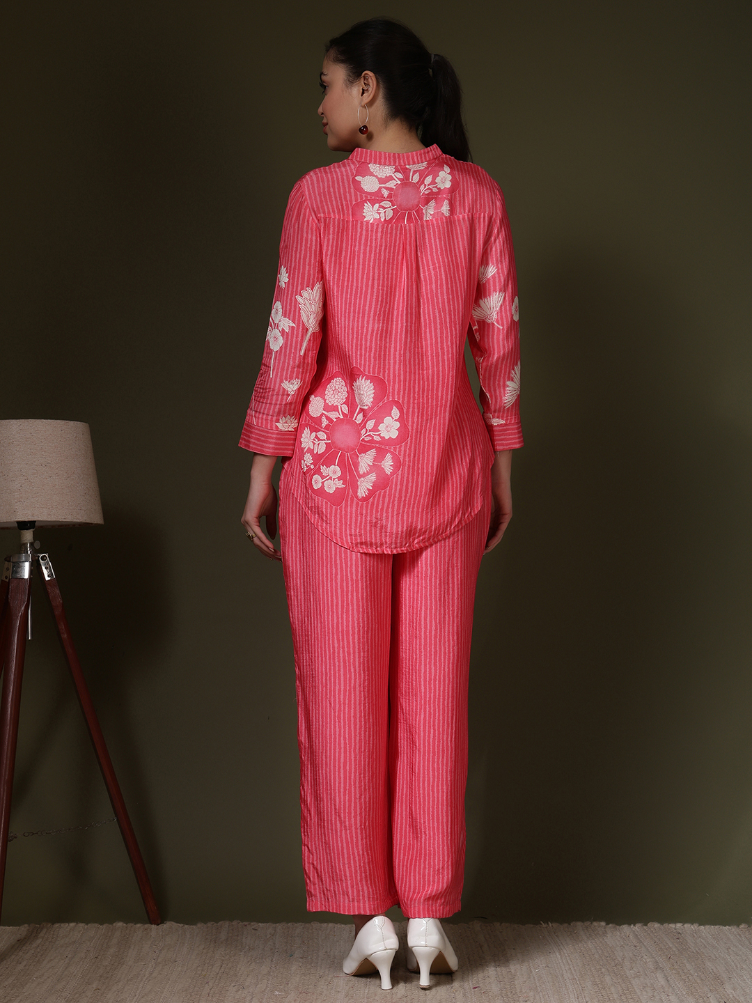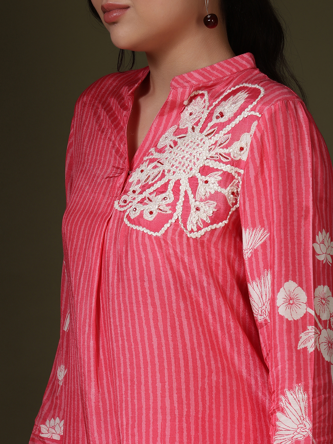 Radiate confidence in our Fuchsia Bloom Co-ord Set. This striking ensemble is crafted from premium muslin fabric, known for its lightweight feel and luxurious drape. The set features a tonal vertical stripe print that elongates the frame, providing a sleek backdrop for the dramatic floral motifs.