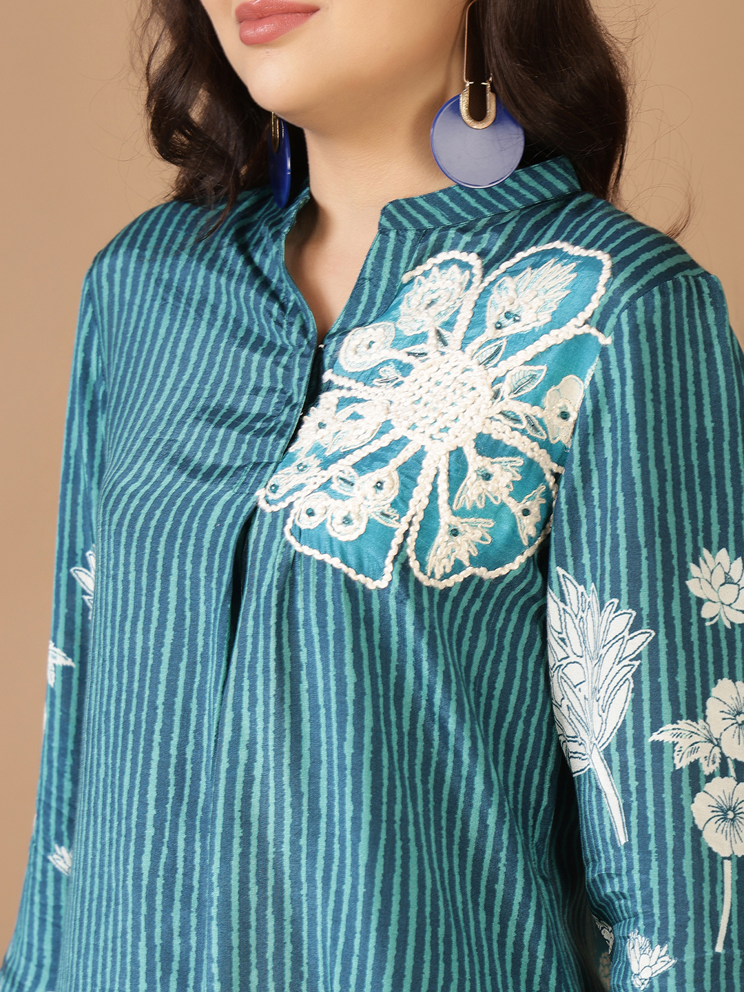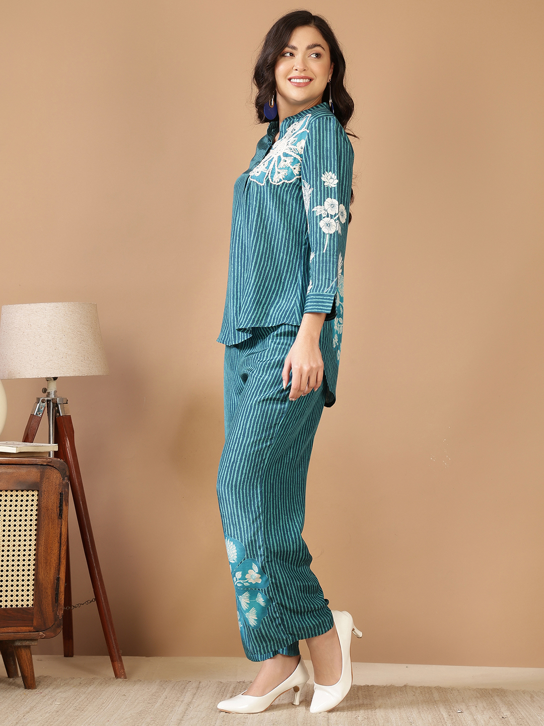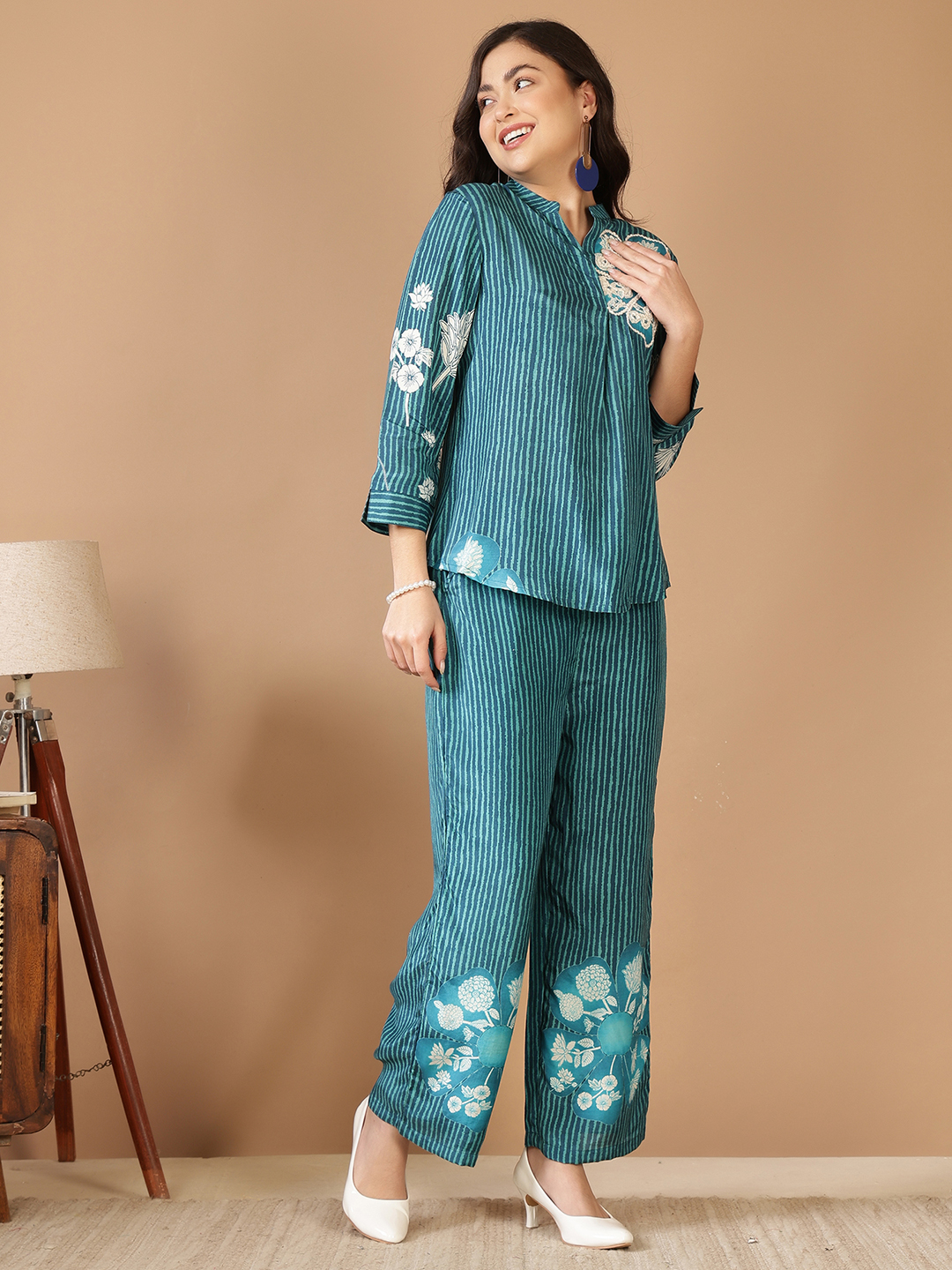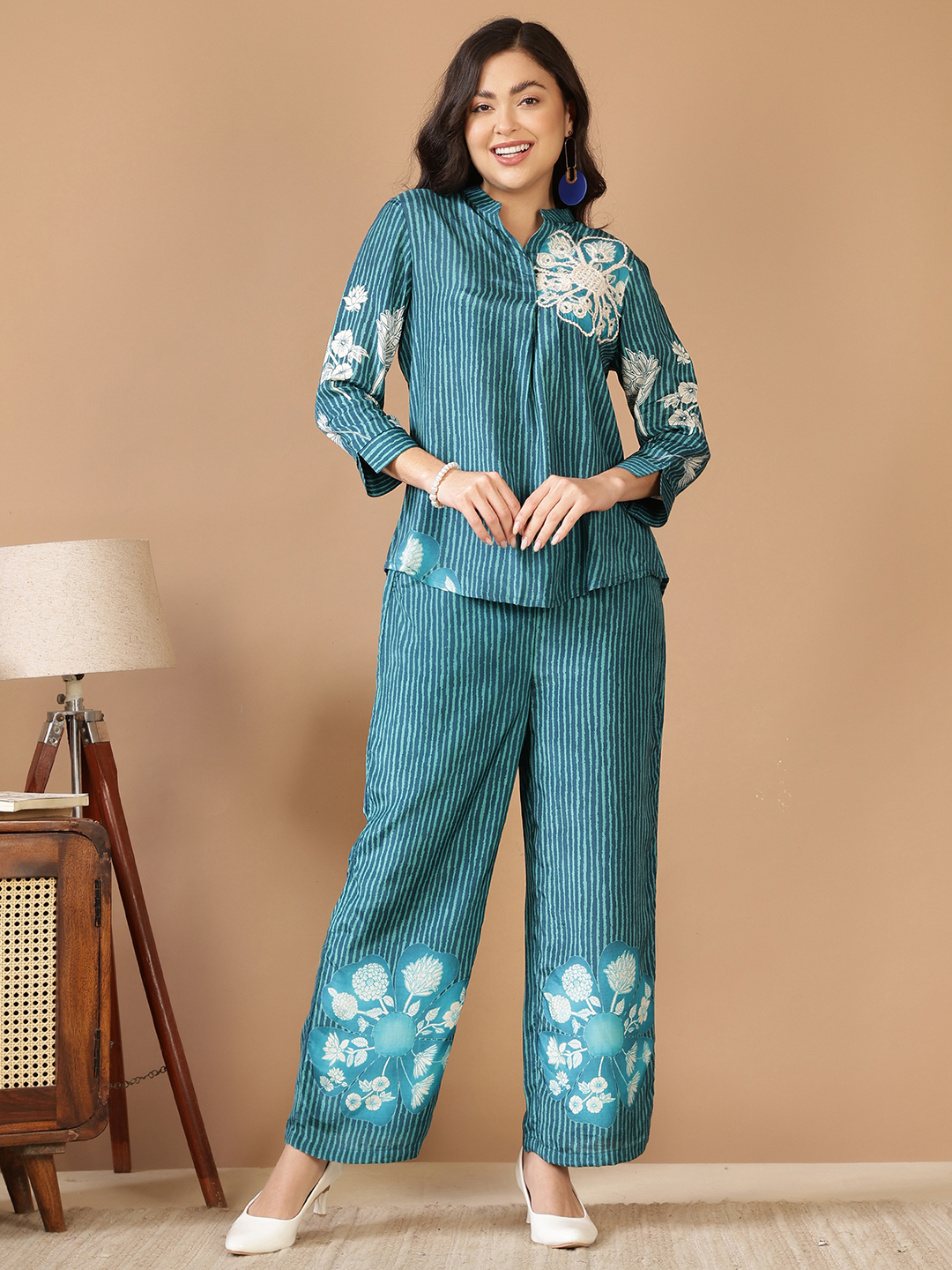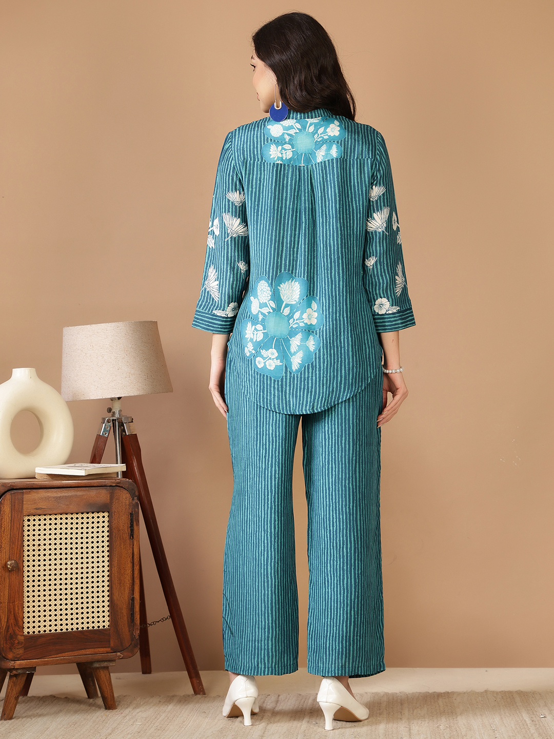 Radiate confidence in our Teal Bloom Co-ord Set. This striking ensemble is crafted from premium muslin fabric, known for its lightweight feel and luxurious drape. The set features a tonal vertical stripe print that elongates the frame, providing a sleek backdrop for the dramatic floral motifs.