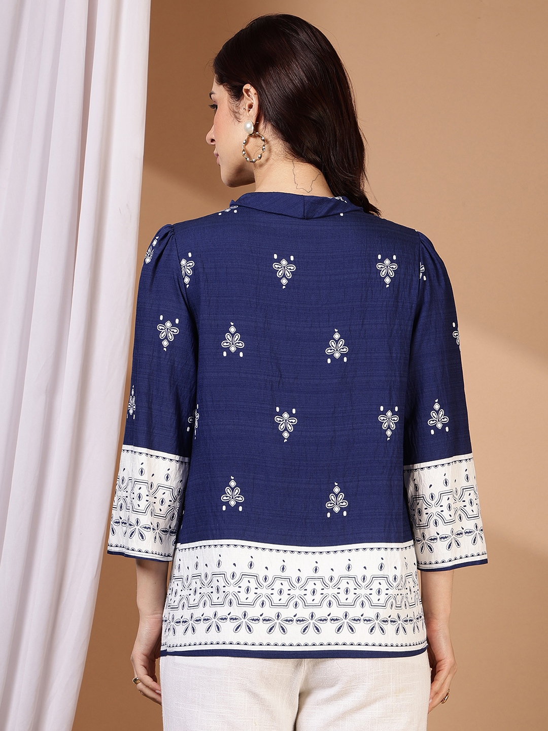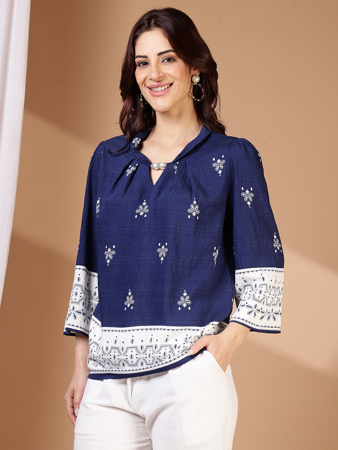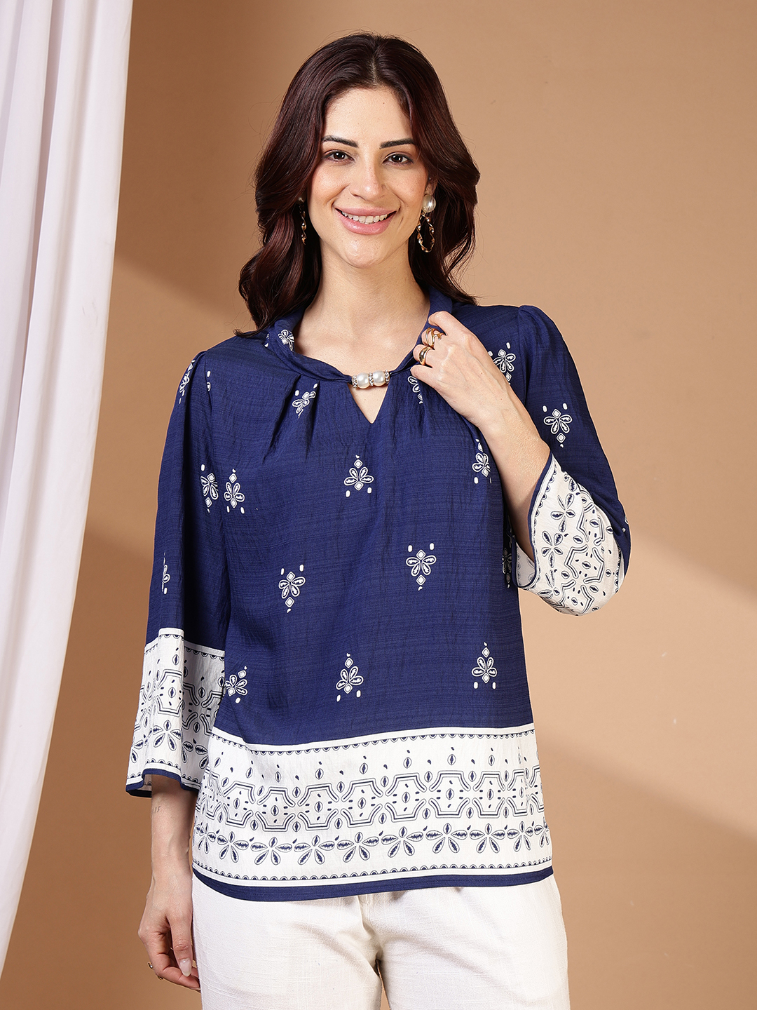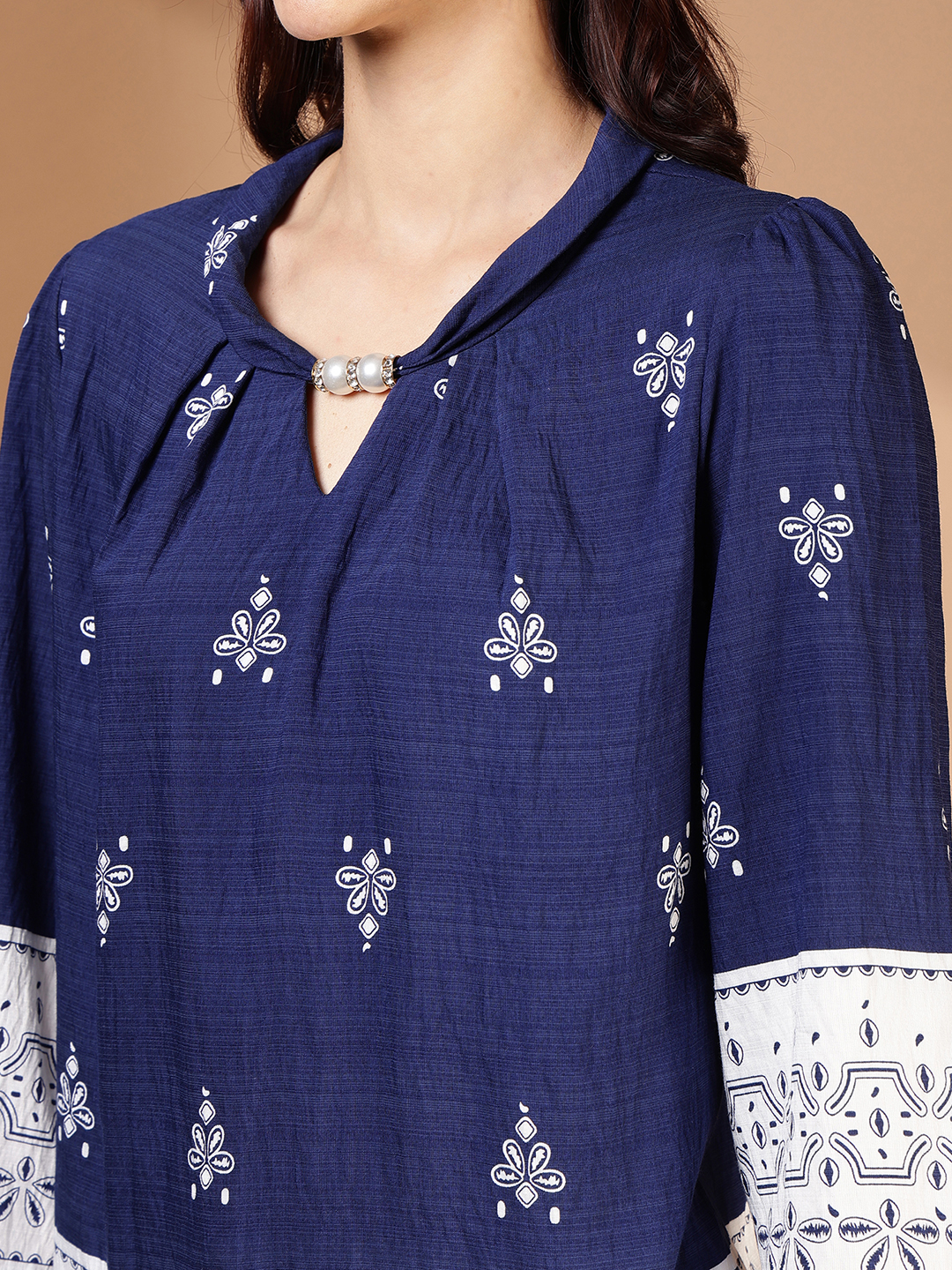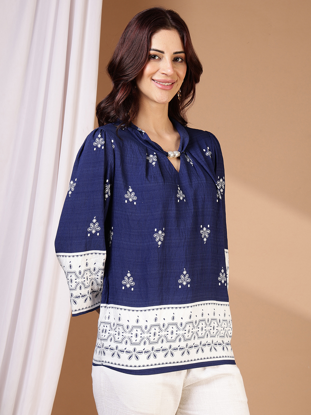 Step into effortless summer elegance with our latest printed tunic, a perfect blend of artisanal charm and modern tailoring. Designed for the woman who appreciates the finer details, this top features a sophisticated Indigo-Navy palette with delicate white motifs that evoke a timeless, breezy aesthetic.