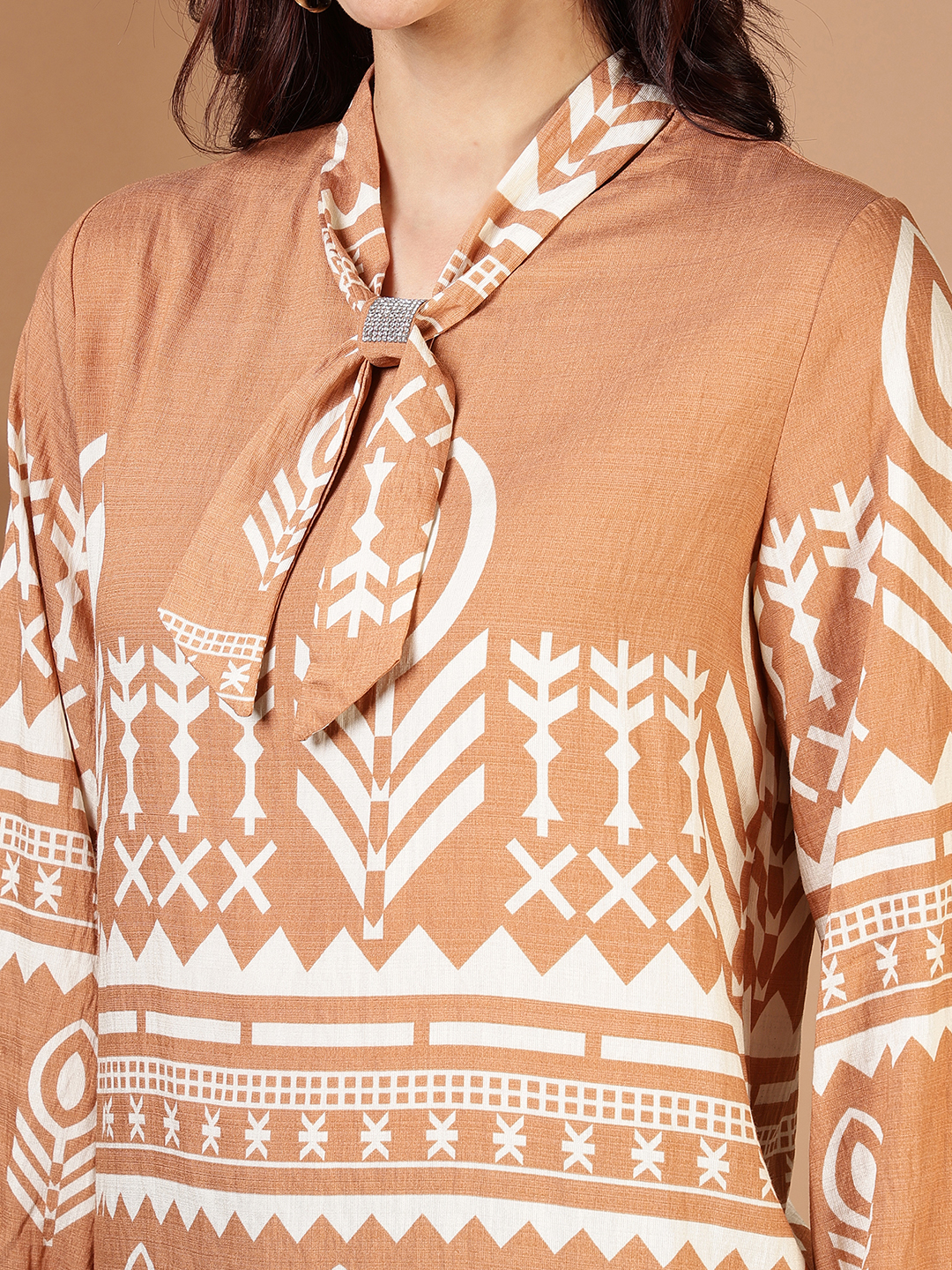 • Intricate Border Print Design: The top features an all-over geometric and tribal-inspired motif. A bold, horizontal border print at the waist and sleeves adds structural interest, framing the silhouette beautifully.