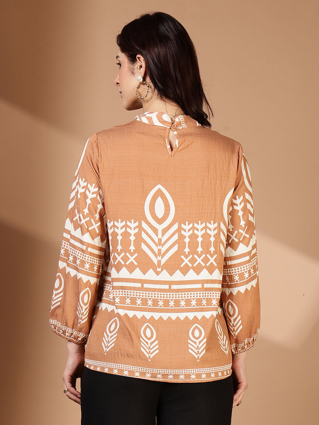 Infuse your summer wardrobe with the warm, earthy tones of our latest printed tunic. A masterclass in "boho-chic" design, this top combines a vibrant terracotta hue with crisp white geometric patterns for a look that is both artistic and sophisticated.