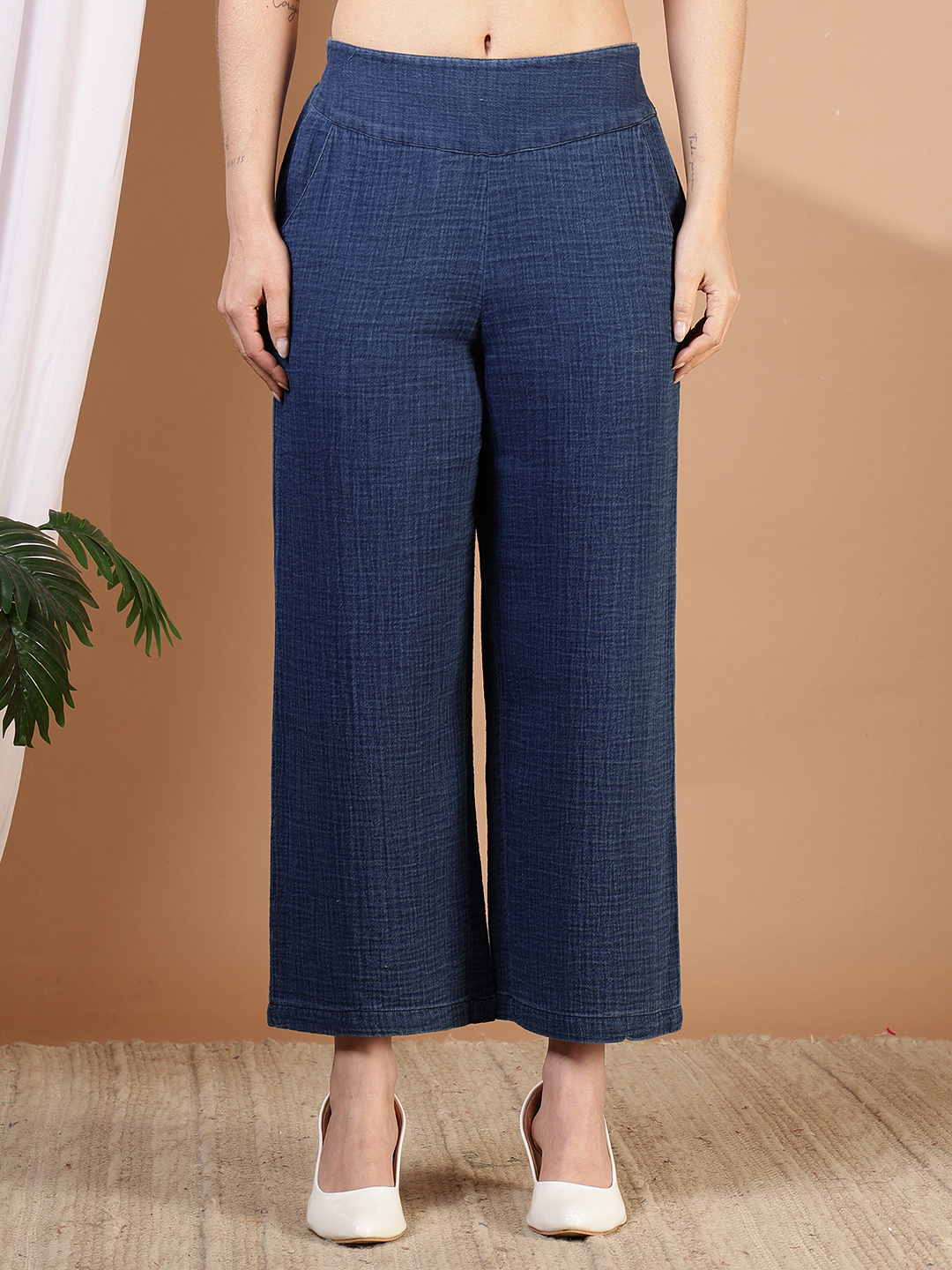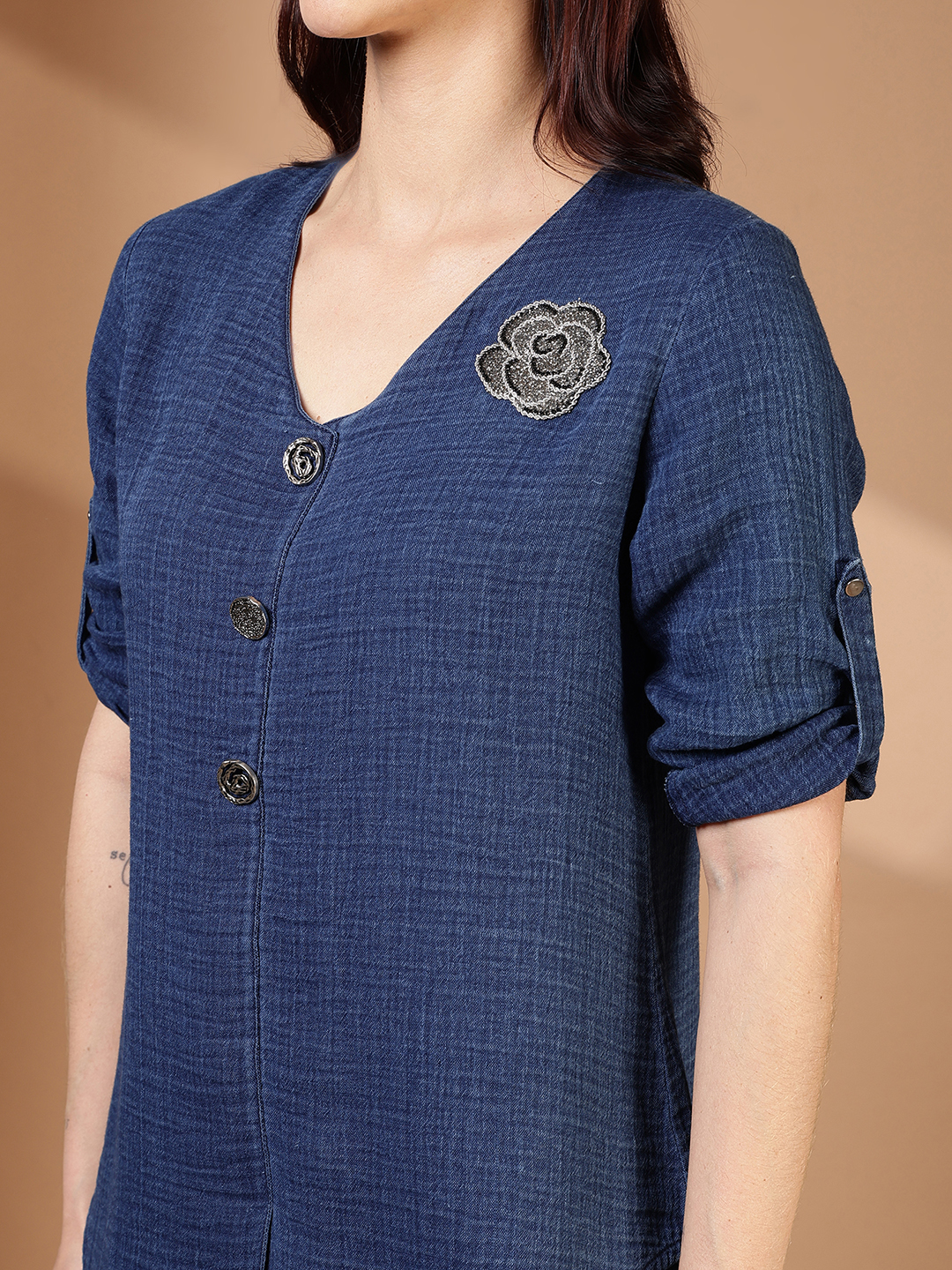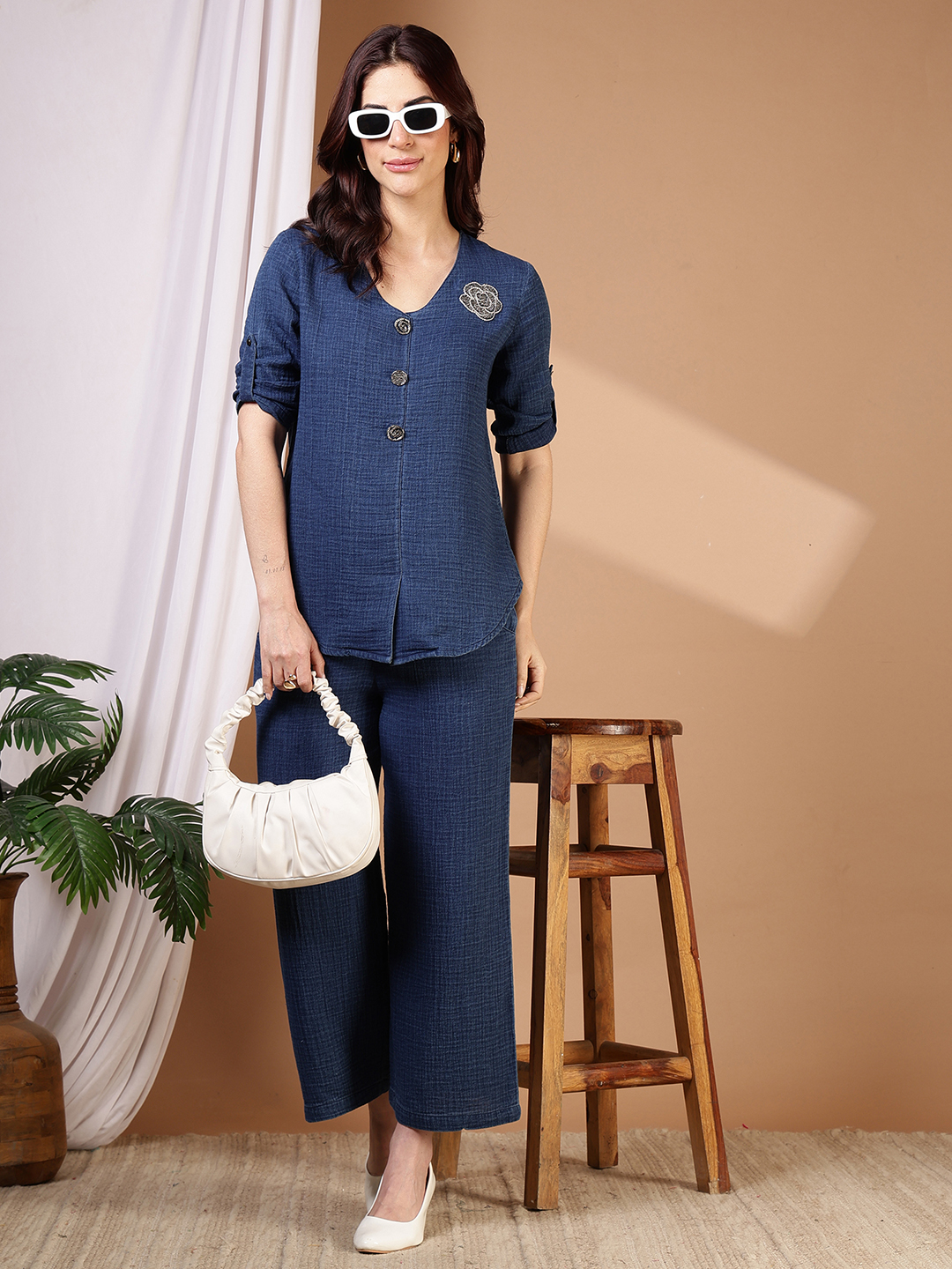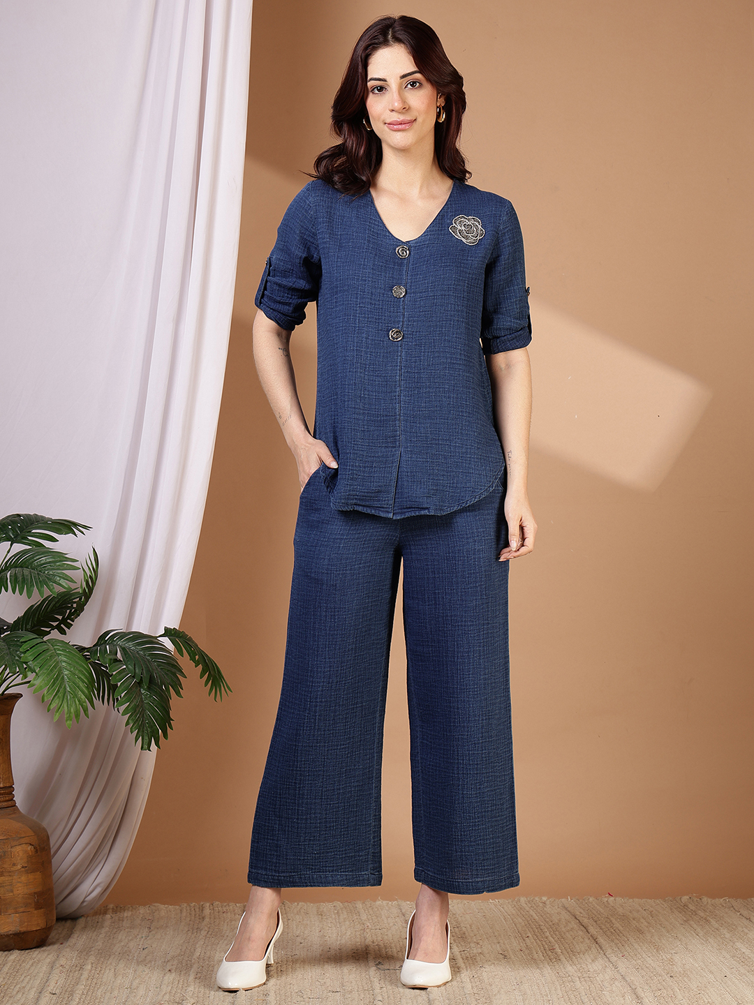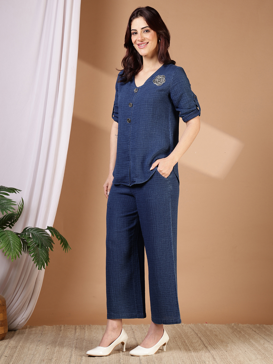 Master the art of effortless dressing with our 100% Indigo Cotton Co-ord Set. Unlike stiff denim, this ensemble is crafted from premium textured indigo cotton, featuring a subtle slub weave that adds depth and character to the fabric.