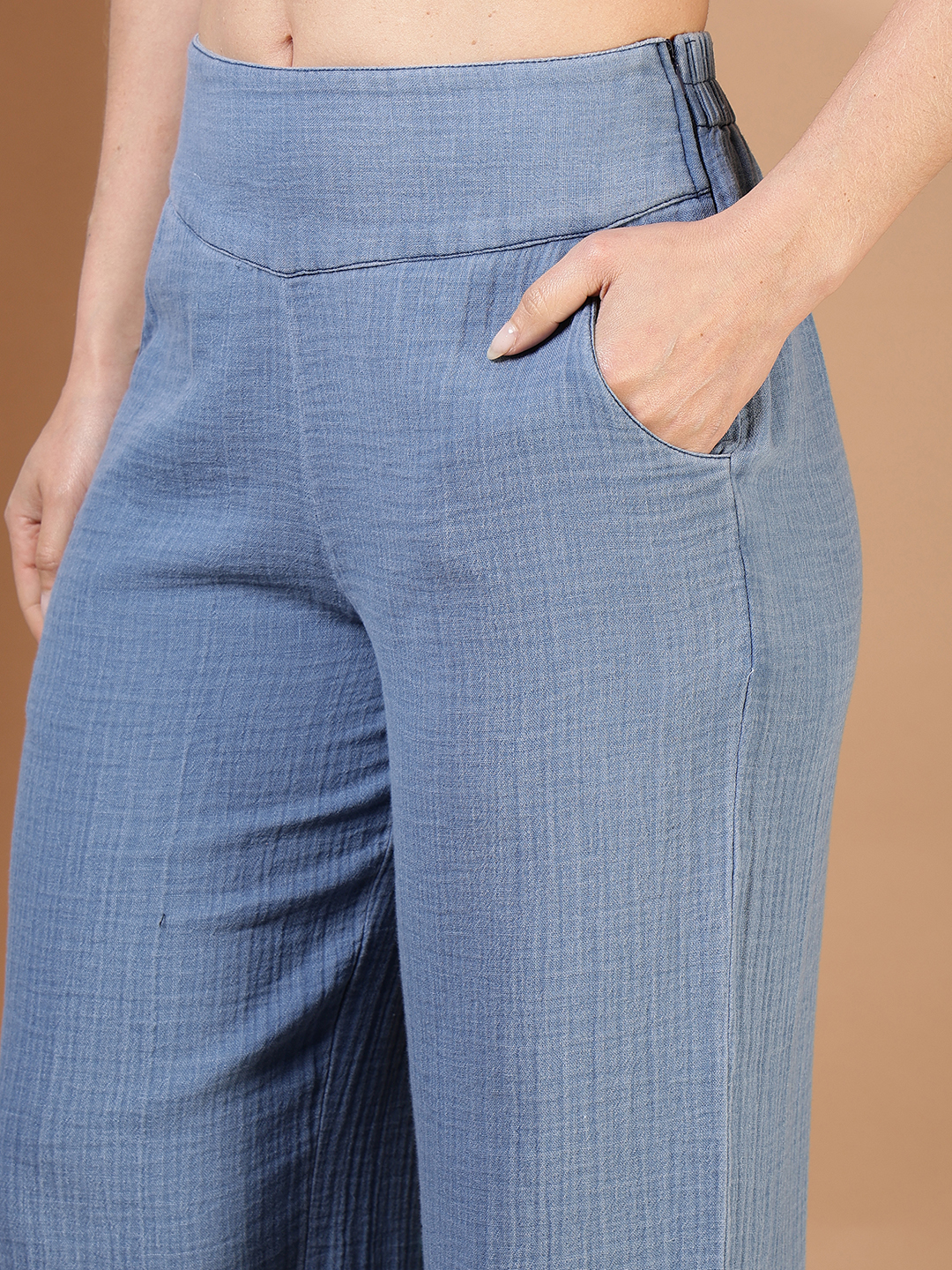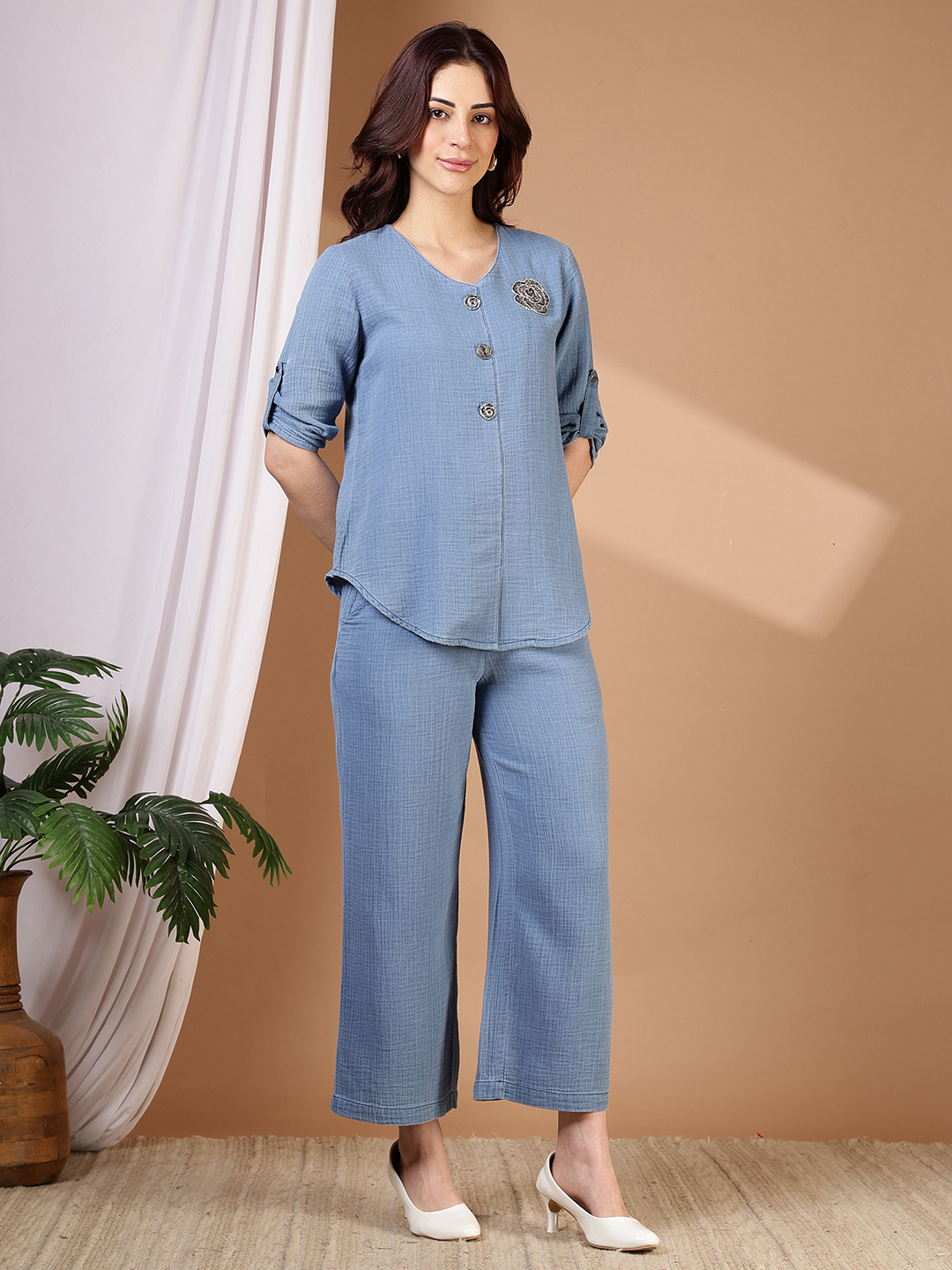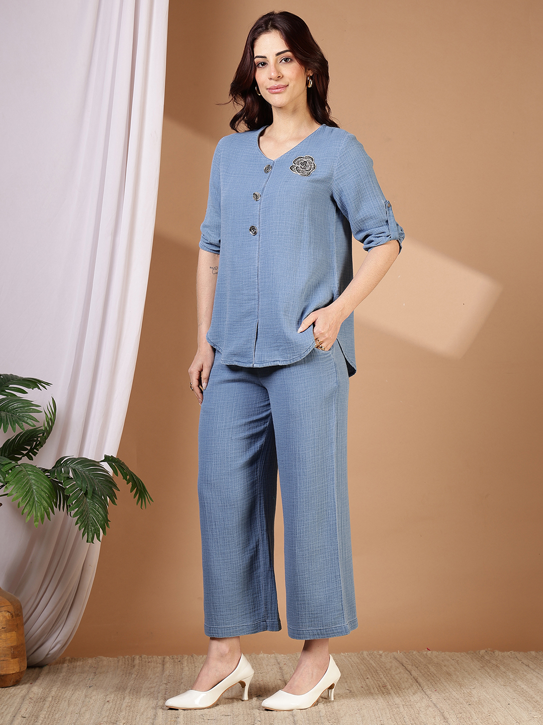 Master the art of effortless dressing with our 100% Indigo Cotton Co-ord Set. Unlike stiff denim, this ensemble is crafted from premium textured indigo cotton, featuring a subtle slub weave that adds depth and character to the fabric.