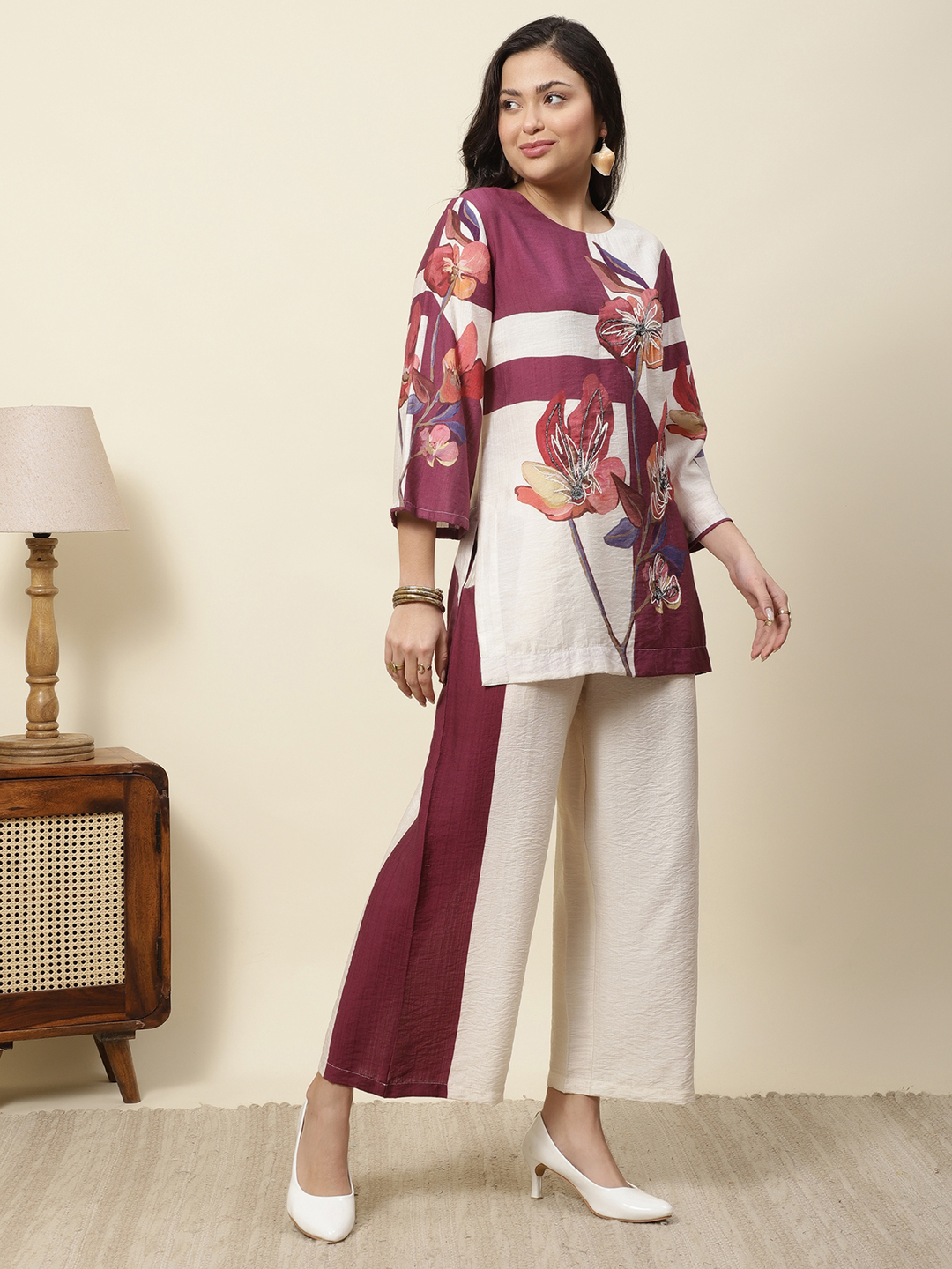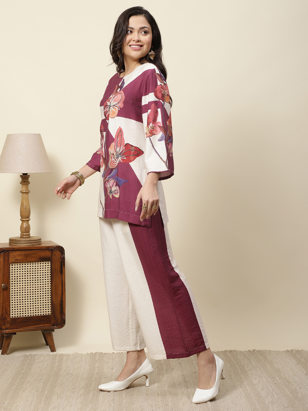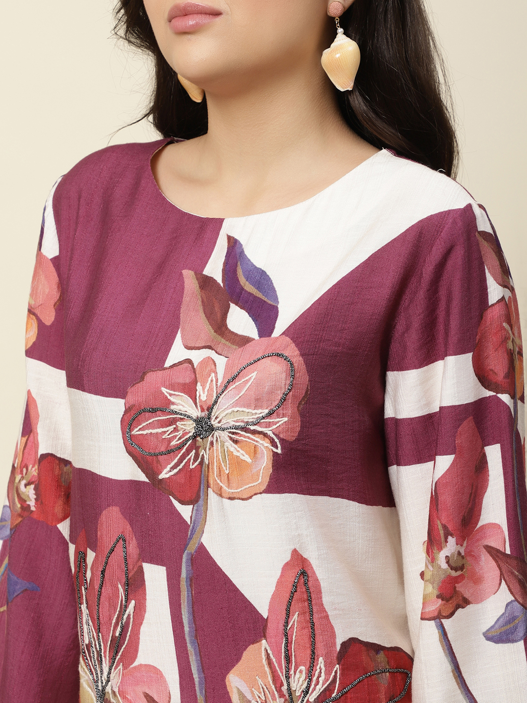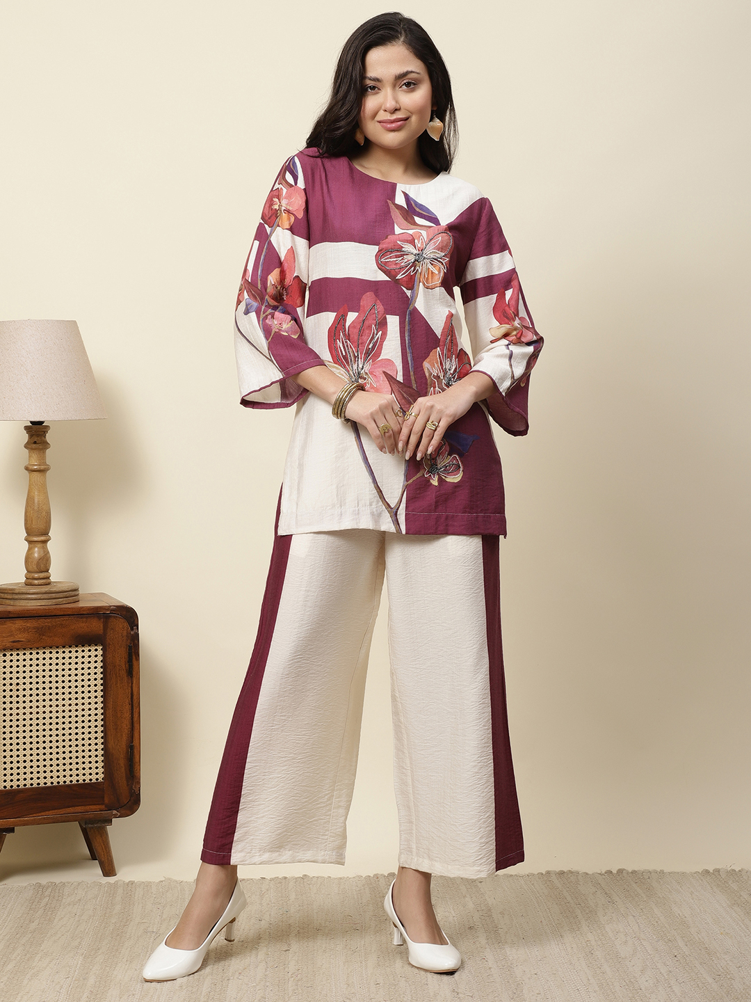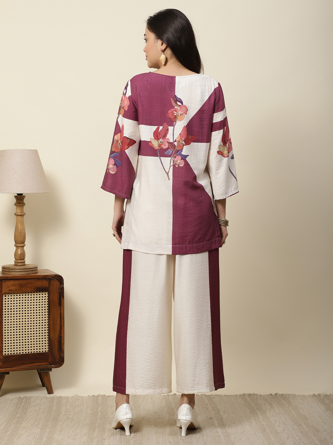 Elevate your everyday elegance with our Floral Muse Coord Set Purple Crafted from premium, breathable muslin—perfect for the upcoming summer season—this ensemble strikes the perfect balance between artistic flair and effortless grace. The set features a striking monochrome block pattern juxtaposed with oversized, hand-painted style floral motifs.