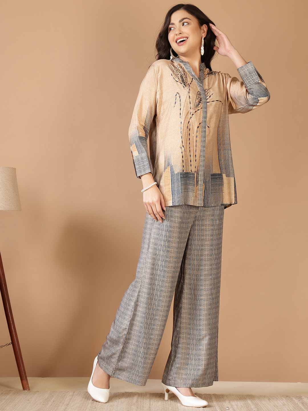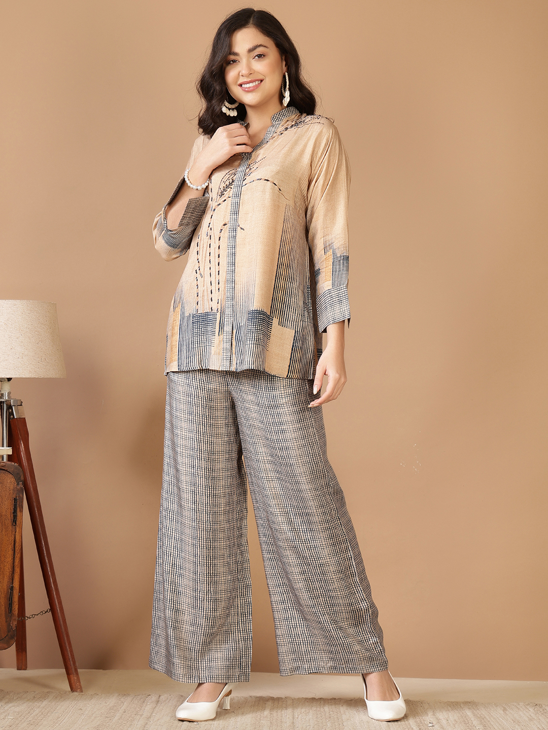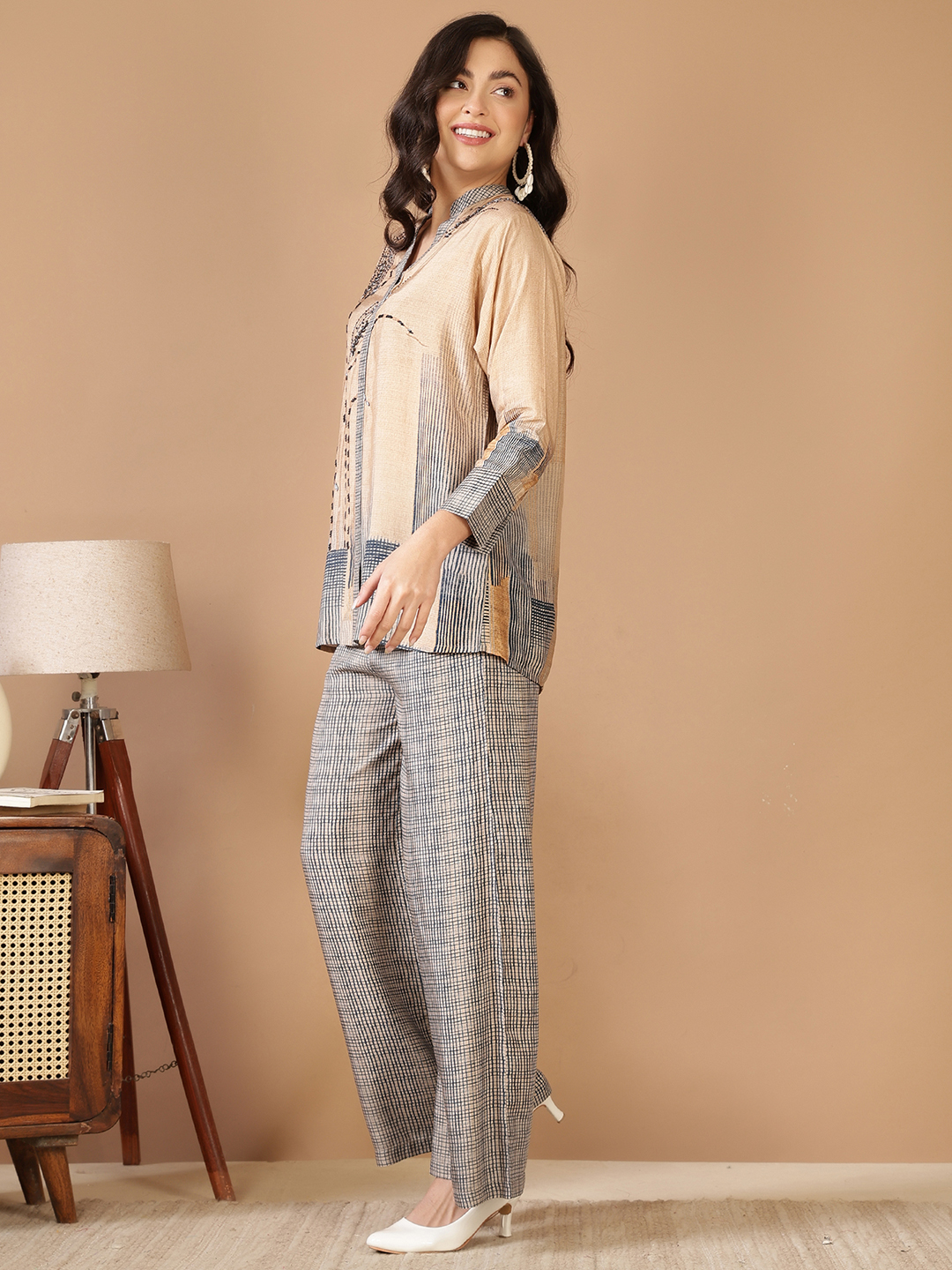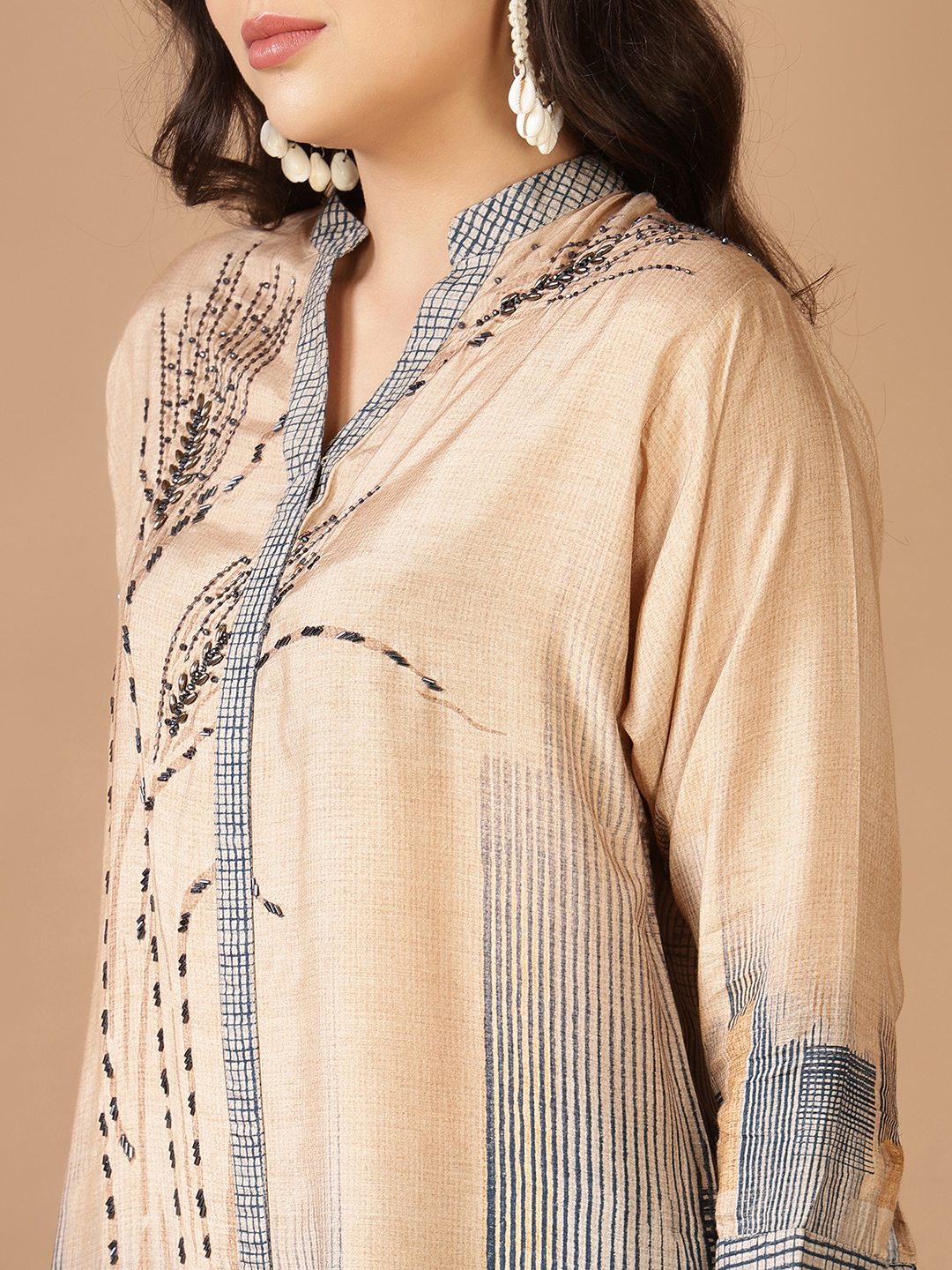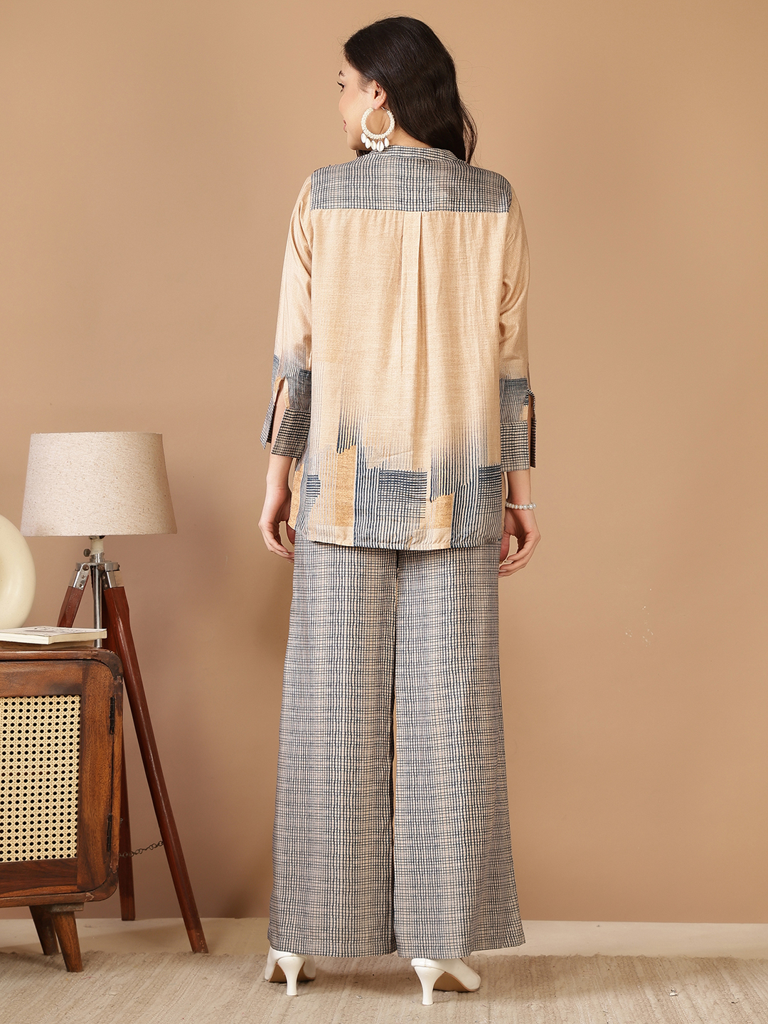 Discover understated luxury in our Amber Husk Coord Set goldish orange. A masterpiece of artisanal grace, this ensemble is crafted from a premium pure-cotton-silk blend. This natural fabric combines the soft breathability of cotton with the subtle sheen and luxurious drape of silk, offering a texture that is exceptionally light and comfortable against the skin.