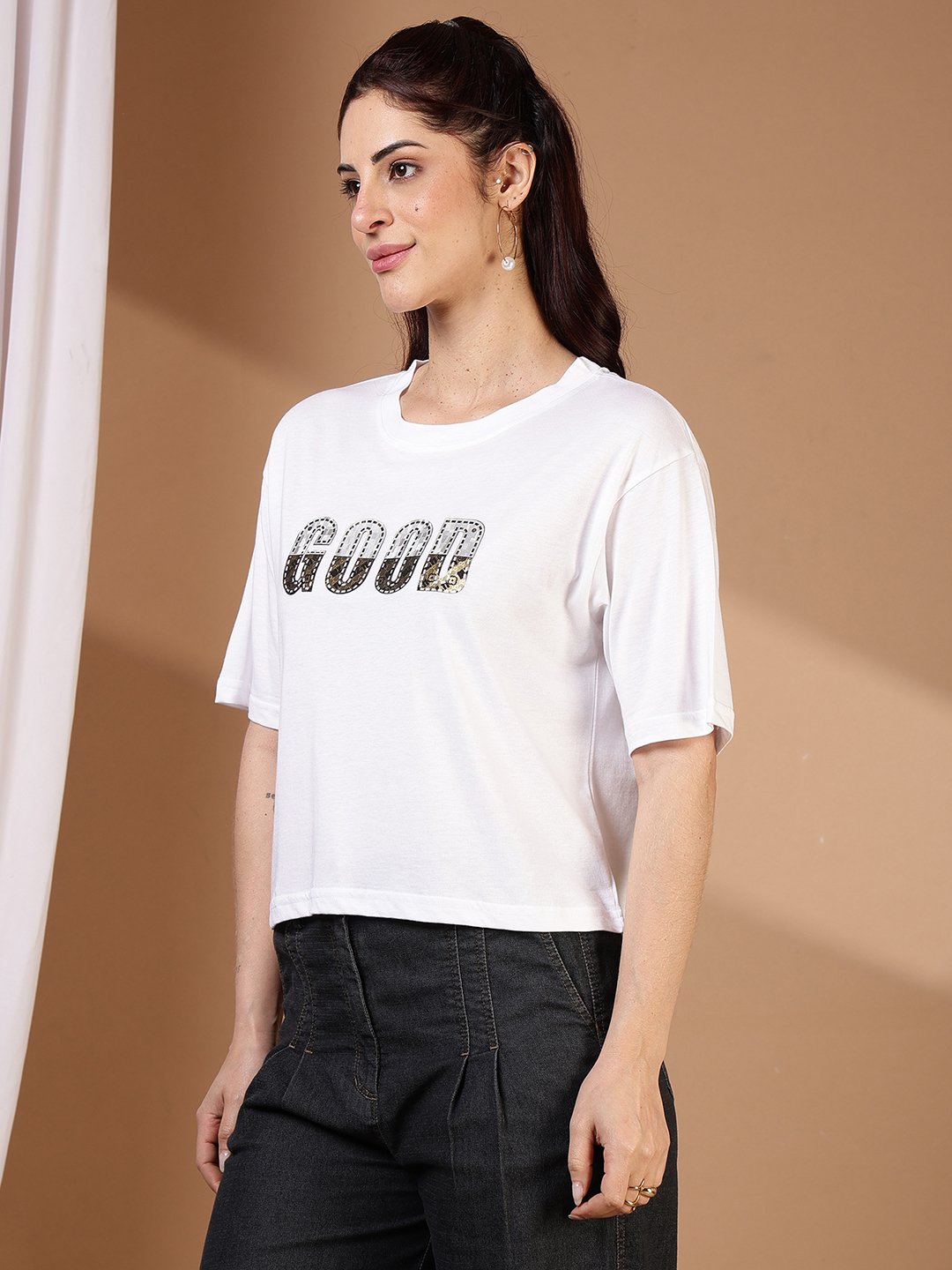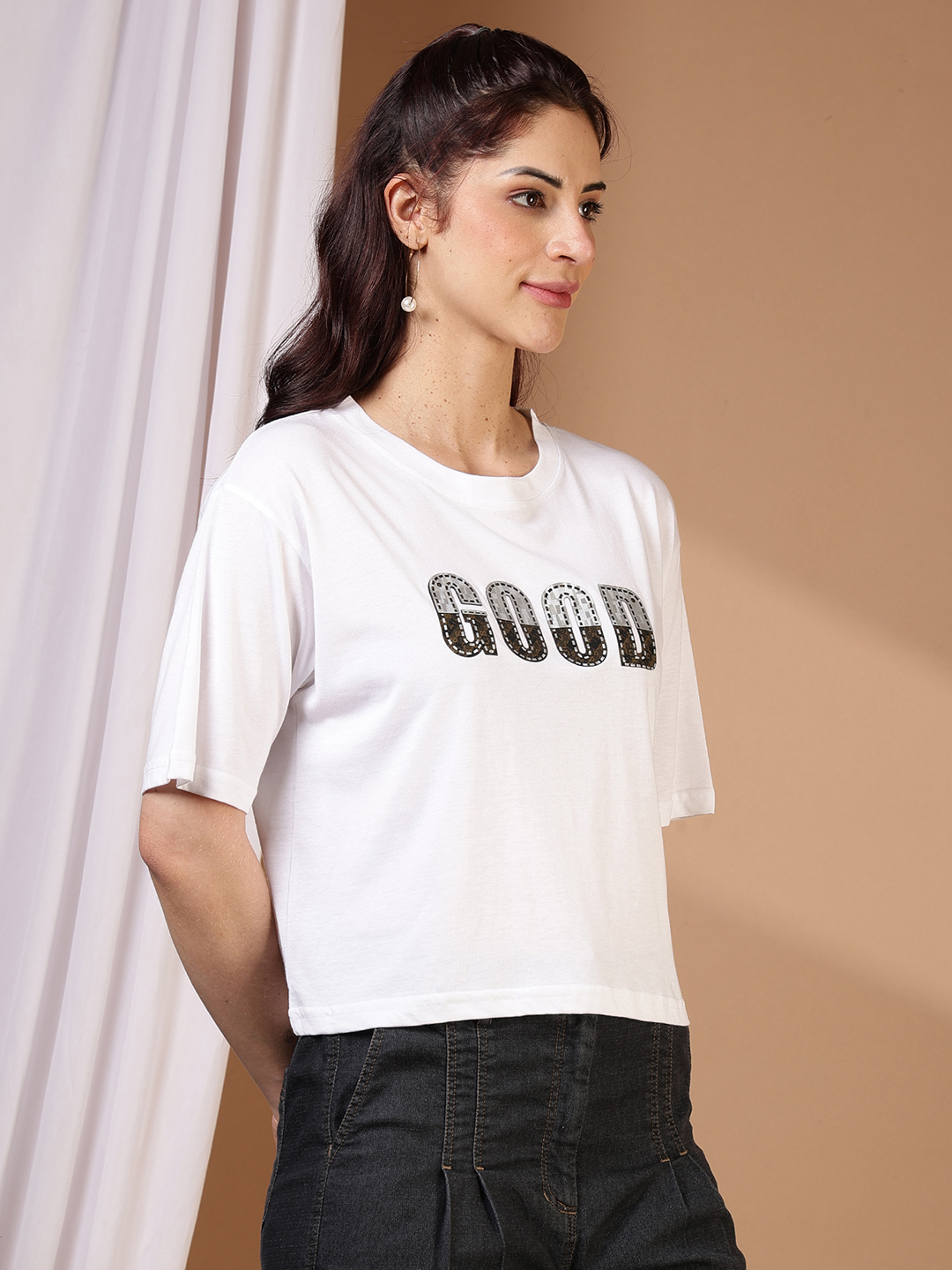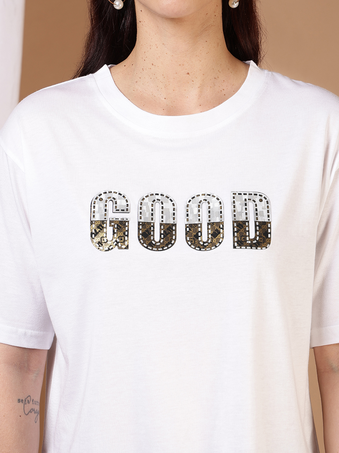 Step into effortless style with this striking black oversized T-shirt, designed to be a versatile centerpiece for your casual rotation. This piece features a bold \"GOOD\" typographic graphic on the chest, utilizing a distinctive dual-tone pattern that adds a modern, architectural feel to a classic black silhouette.