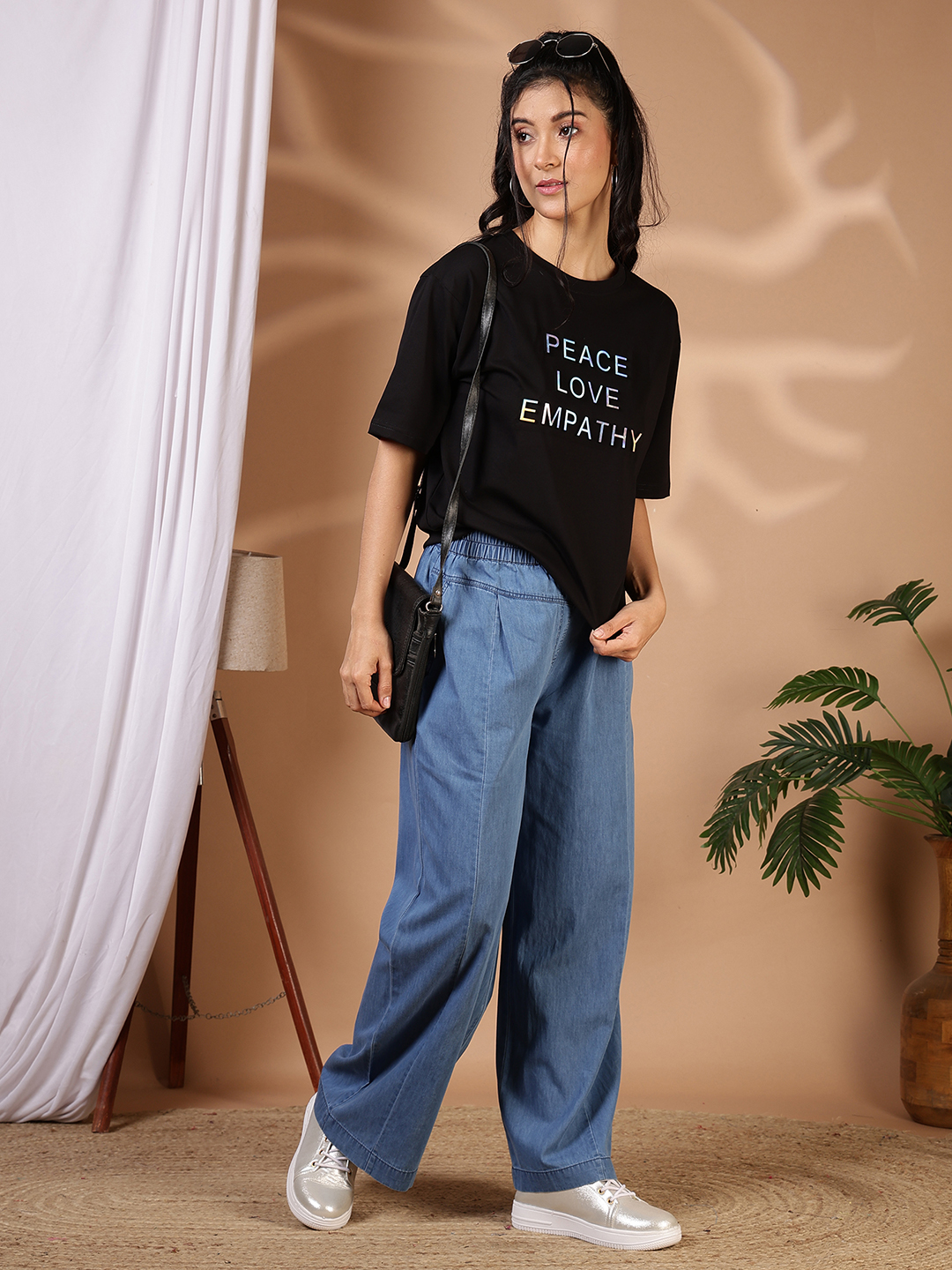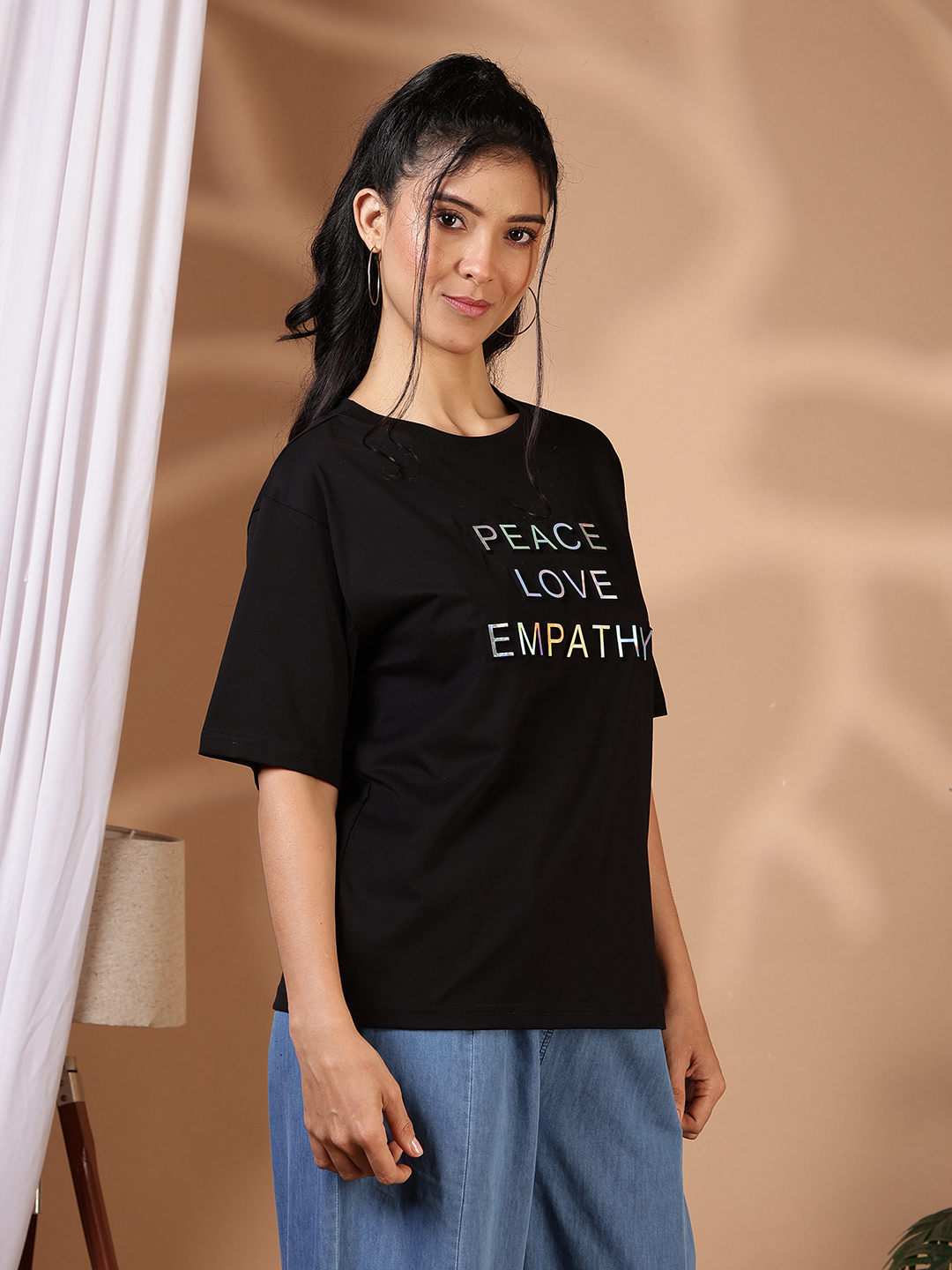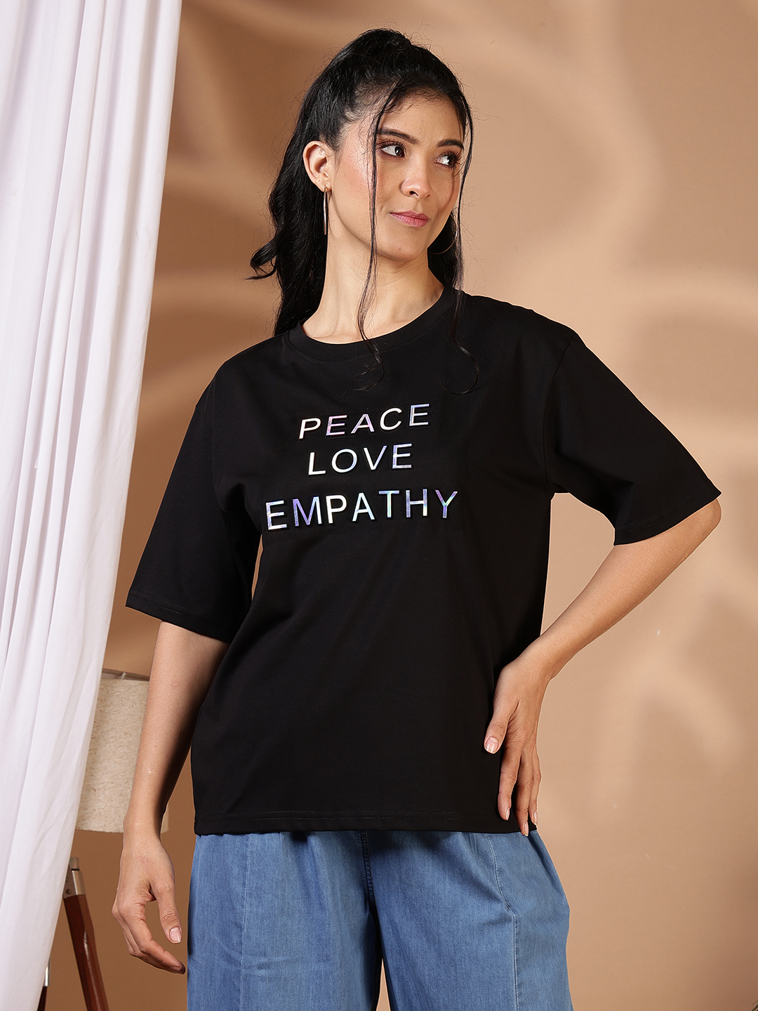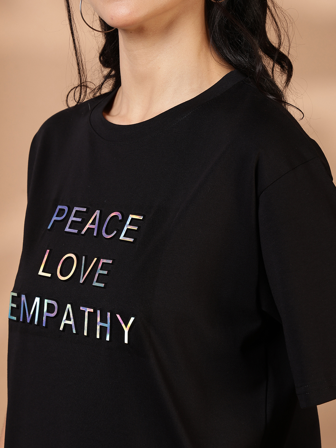 Statement-making and soul-soothing, this oversized graphic tee is designed to be your summer sanctuary. Featuring a bold "PEACE LOVE EMPATHY" typography in a unique iridescent finish, it’s a piece that speaks volumes while keeping you effortlessly comfortable.