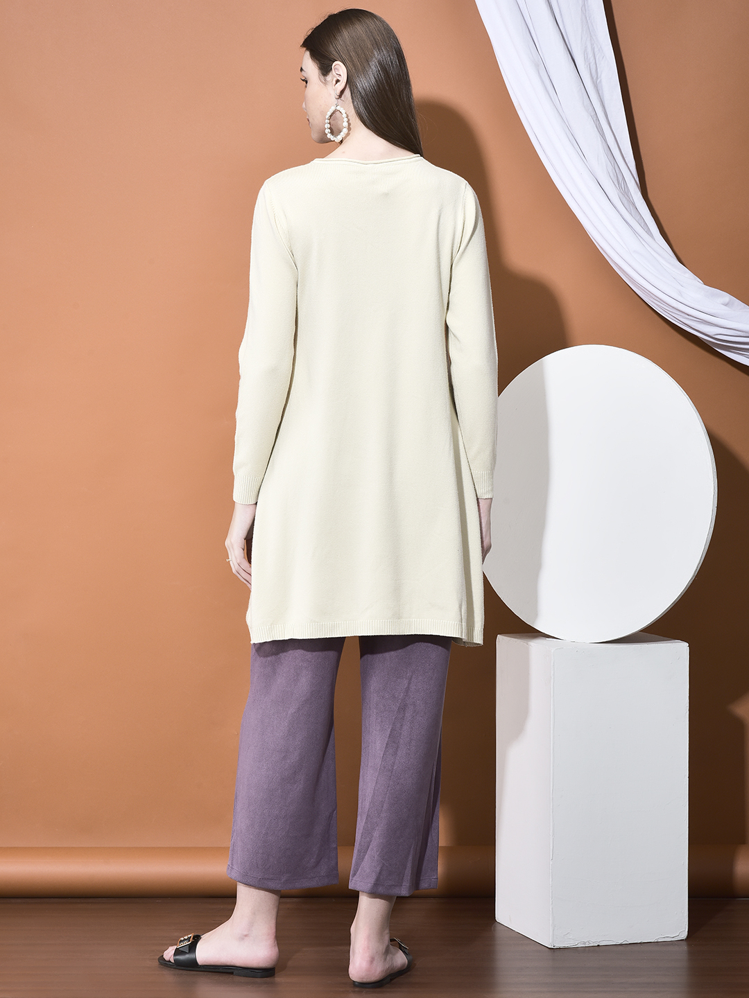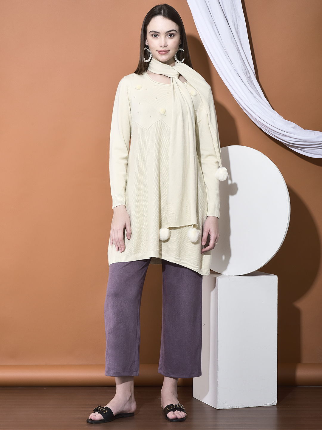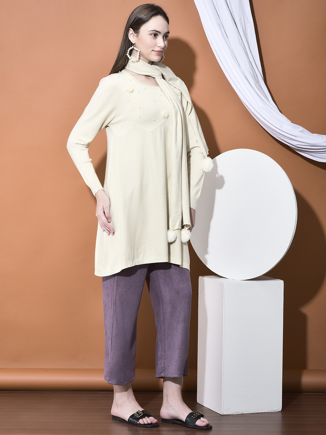 Step into winter whimsy with The Pom-Pom Stole Tunic Set, a charmingly warm and modest coordinated outfit. This luxurious set features a long-line, soft-knit tunic with delicate bead and pearl embellishments, and is perfectly paired with a coordinating scarf/stole adorned with playful faux fur pom-poms (or "fur balls"). Crafted from a Warm Cotton-Poly blend, the fabric provides a comfortable, breathable, yet insulating feel, ensuring warmth and a beautiful drape. The flattering A-line silhouette of the tunic offers comfortable, modest coverage. This unique set is ideal for festive winter occasions or stylish daily wear. Fabric Composition- Warm Cotton-Poly Blend Knit Set Components- Long Tunic/Top, Matching Stole/Scarf (with fur balls/pom-poms) Special Detail- Tunic features subtle pearl/bead scatter embellishments. Stole is finished with faux fur pom-poms. Fit- Relaxed A-Line Fit. The tunic is long and flows gently from the bust, offering a comfortable, loose fit.