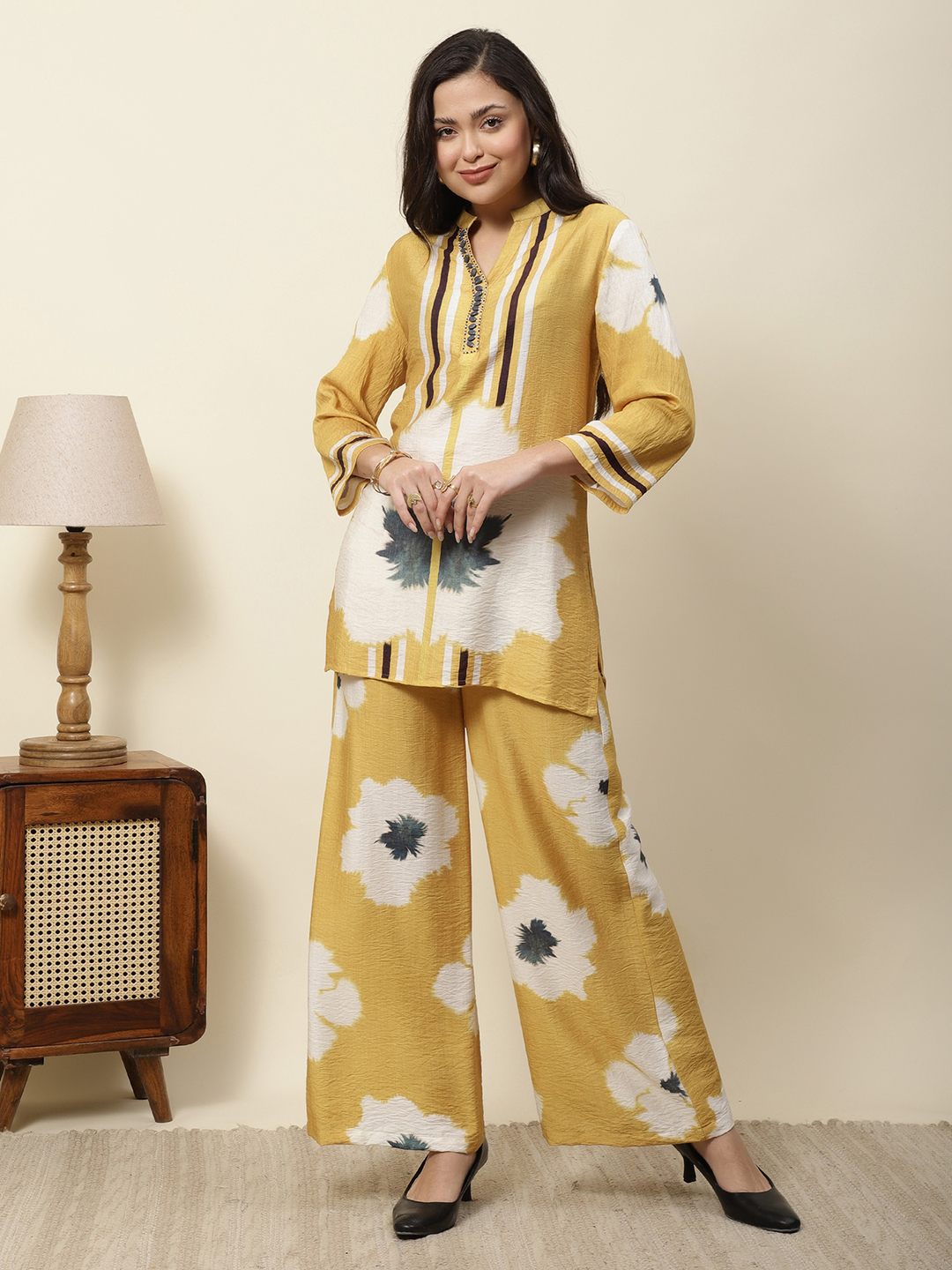 Make a striking statement this season with our Floral-Linear Linen Viscose Co-ord. This set features a unique artistic fusion of bold floral motifs and sharp vertical stripes, designed to elongate and flatter the frame. The lightweight fabric and intricate hand-embellished placket make it a standout piece for high-end summer outings or professional daytime events