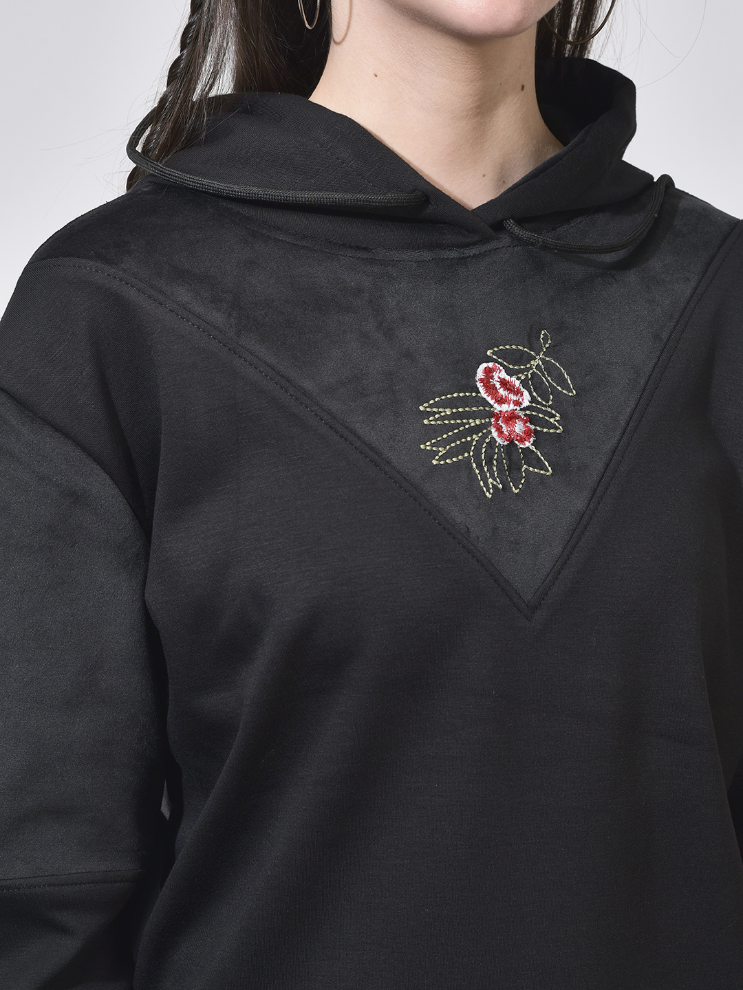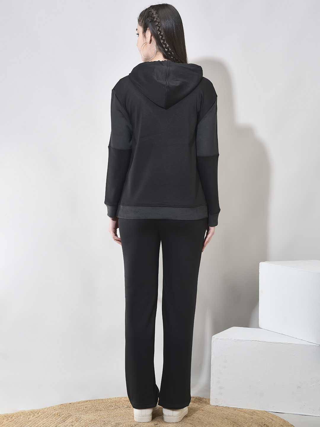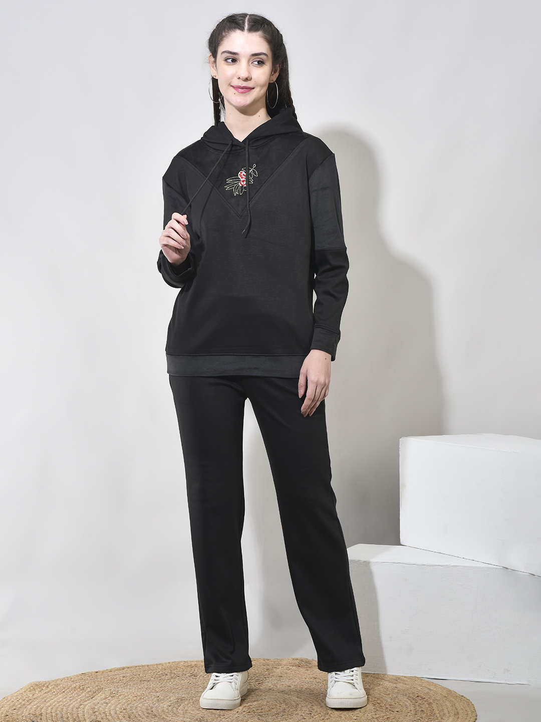 Introducing the Flora Noir Co-ord Set—a luxurious addition to your winter wardrobe, expertly crafted from a soft, warm Rayon Spandex blend available in classic Black, subtle Mouse, and deep Onion. This stylish ensemble features a relaxed, hip-length hoodie top, distinguished by a chic V-shaped panel made from a contrast fabric, beautifully adorned with intricate floral embroidery for a sophisticated touch. Paired with comfortable, full-length straight-fit trousers, this set offers the perfect balance of cozy warmth, optimal stretch, and elevated style, making it your go-to choice for effortless athleisure and comfortable winter outings.